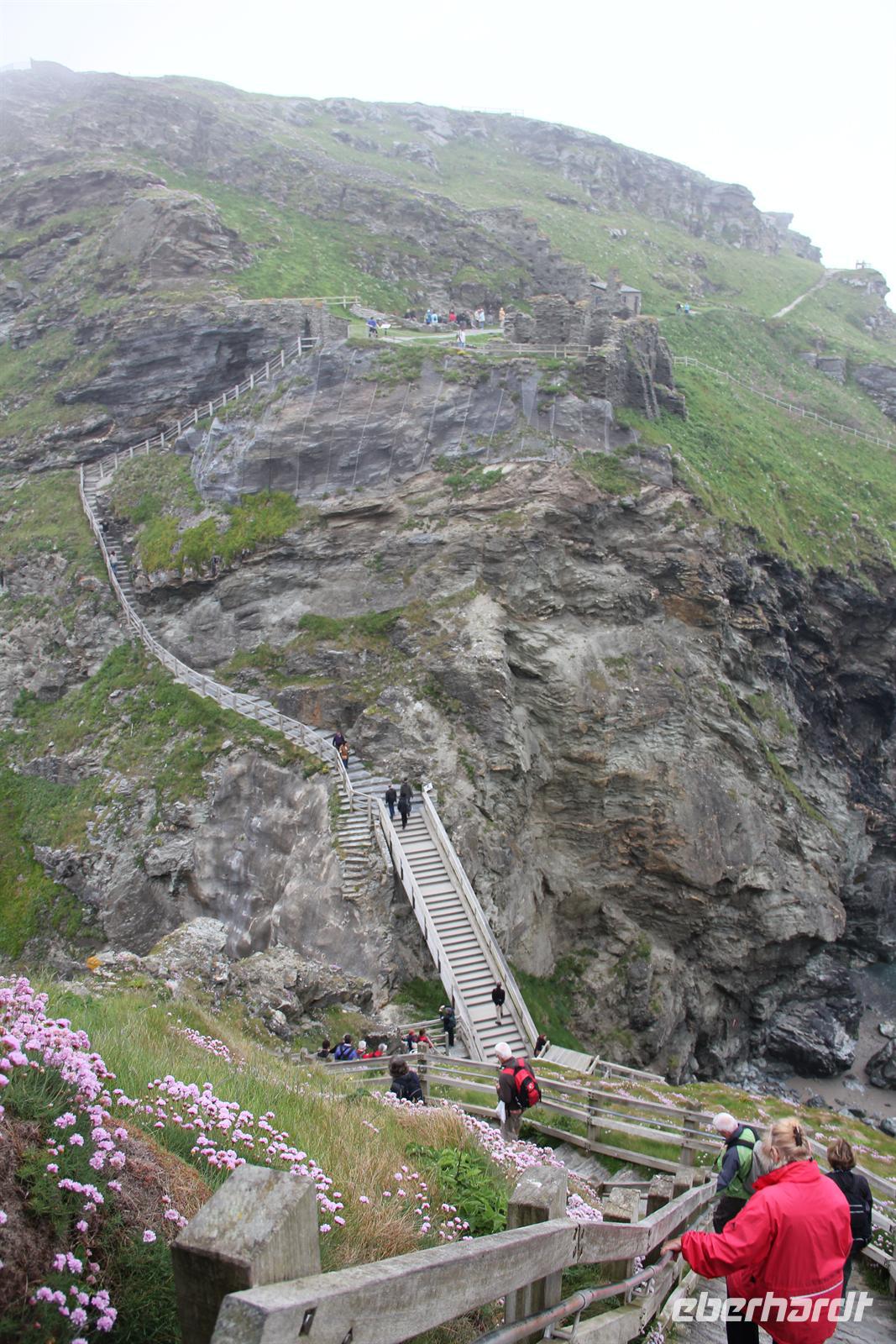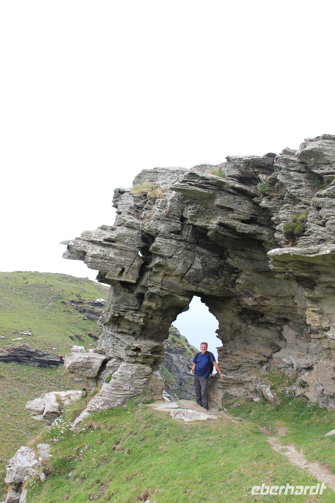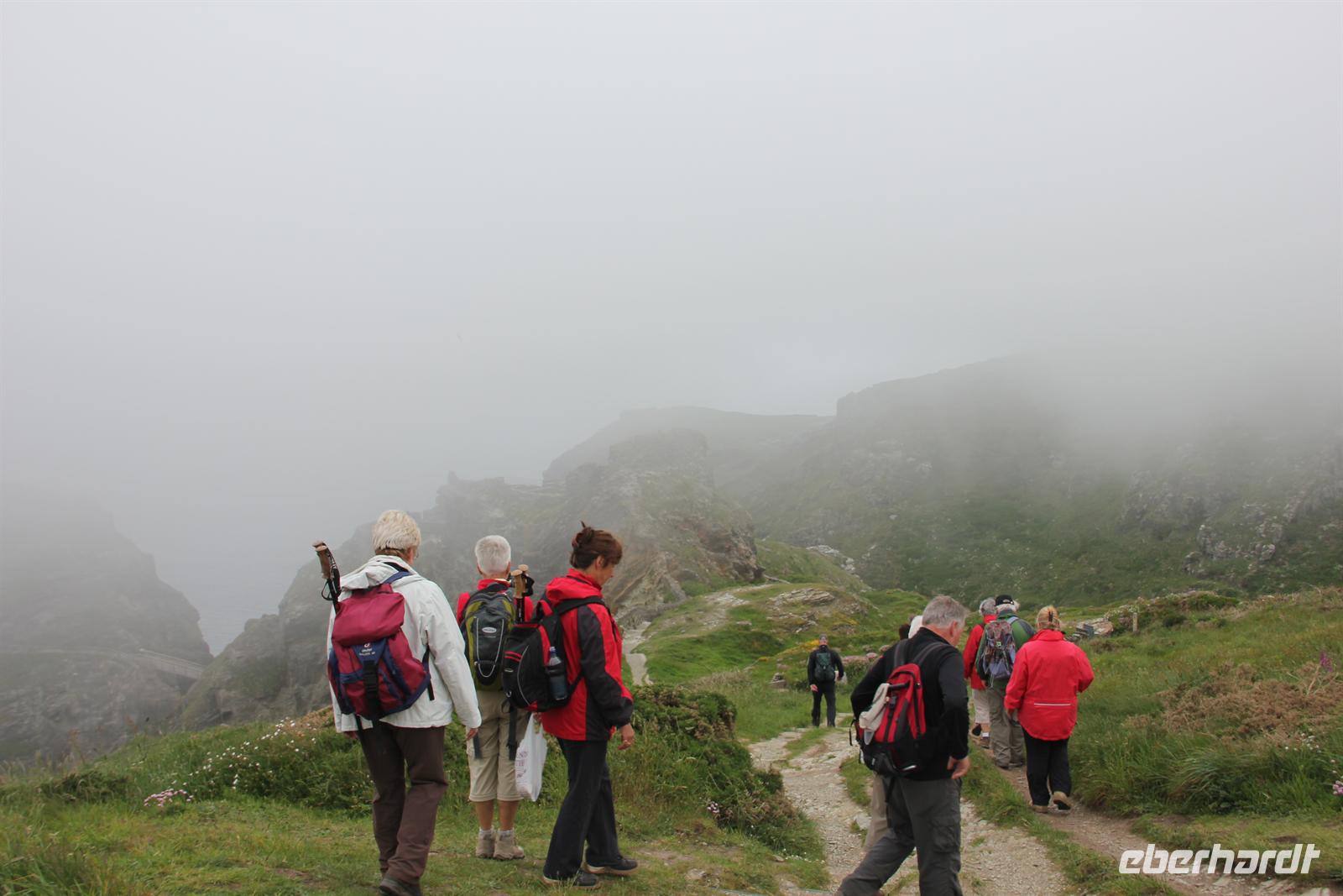Heute wanderten wir auf den Spuren von König Artus. Unser Weg führte uns nach Tintagel, doch bevor die Wanderung starten konnte, mussten wir einfach noch einen Halt an einem echten Cornish Pasty Geschäft einlegen. Damit an diesem Tag auch jeder in den Genuss dieser regionalen Spezialität kommen konnte, zeigte Simone uns einen Laden, in dem diese Köstlichkeit noch von Hand hergestellt wird. Gefüllt mit allerlei Köstlichkeiten, wie Lamm oder auch Käse & Zwiebel, war für jeden Geschmack etwas dabei. Dann ging es zur Tintagel Church und schließlich erklommen wir Tintagel Castle, was für die kleineren unter uns eine echte Herausforderung wurde, da die Treppenstufen manches Mal fast höher waren als die eigenen Beine. Endlich erreichten wir unsere erste Etappe und hier, wo der sagenumwobene König Artus der Legende nach gezeugt worden sein soll, herrschte durch den vielen Nebel eine mystische Atmosphäre. Wir konnten wieder hinabsteigen und die Höhle des Zauberers Merlin von der Ferne aus sehen. Doch auch an diesem Tag sollte unser Motto wieder lauten: Alles was wir hinabsteigen, müssen wir auch wieder hinauf! Also ging es auf und ab und auf und ab, vorbei am Elefantenfelsen und am Ladies Window nach Boscastle, der Stadt mit einem Hexenmuseum. In geselliger Runde wurde noch ein Kaffe oder ein traditioneller Cornish Cream Tea getrunken. Bevor es zurück ins Hotel ging, führte unsere Reiseleiterin uns noch zu den Bedruthan Steps, einer Bucht dessen Felsen von Muscheln geradezu besiedelt ist - ein wahrhaft paradisischer Ort.