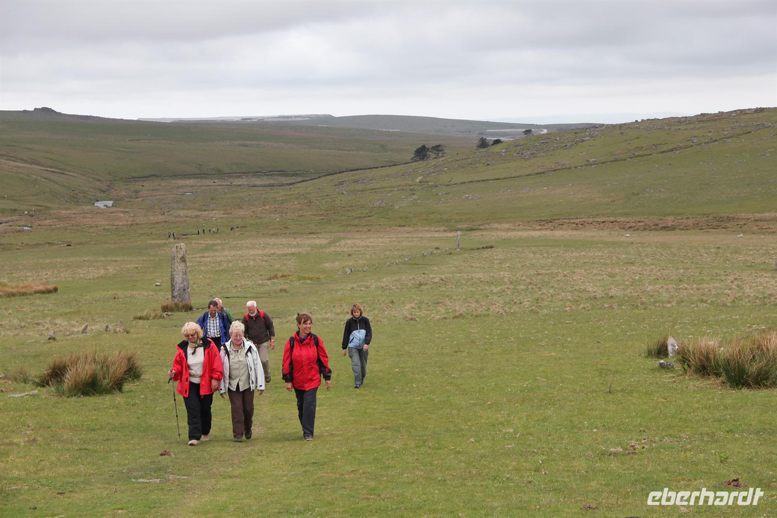 Der Dartmoor-Nationalpark zeigte sich an diesem Tag von seiner besten Seite, denn ganz ungewohnt lag das Moor nicht in Nebelschwaden und wir durften uns wieder auf bestes Wanderwetter freuen. Das Motto unseres heutigen Tages lautete: Alles was wir hinabsteigen, müssen wir auch wieder hinauf! Die meisten erwarteten feuchtes Moor und Sumpf, doch dies bot uns der Nationalpark nicht, da er nicht diese Sorte Moor ist. Wir begegneten vielen Schafen und auch gelber Ginster ist keine Rarität im Dartmoor. Über Flüsse, Steinmauern und sogar Maschendrahtzäune begaben wir uns immer weiter ins Dartmoor hinein. Schließlich kamen wir zu einer ehemaligen Kaninchenfarm wo wir Rast machten. Wir durchstreiften das Dartmoor und trafen auf eine paar Wildpferde, die sich über unseren „Besuch“ zu freuen scheinten und sich auch gern von uns streicheln und füttern ließen. Als wir wieder am Bus ankamen, genehmigten sich einige noch ein Eis beim Eismann, der auf dem Parkplatz stand und dann ging es weiter nach Postbridge. Hier wurde eine Kaffeepause eingelegt und wir konnten die Clapperbridge bestauenen. Die Stabilität dieser Brücke beruht allein auf den aufeinander ruhenden Steinen. Bei dem Städtchen Minions wurde noch ein kleiner Stopp eingelegt, um die sogenannte Cheesewring (dt. Käsepresse), eine Steinformation, aus der Ferne zu betrachten. Schließlich kamen wir abends wohl behalten in Newquay an und bezogen unser neues Hotel. Direkt am Meer gelegen lud der Strand abends noch zu einem kleinen Spaziergang ein und manche getrauten sich sogar mit den Füßen ins kalte Nass.