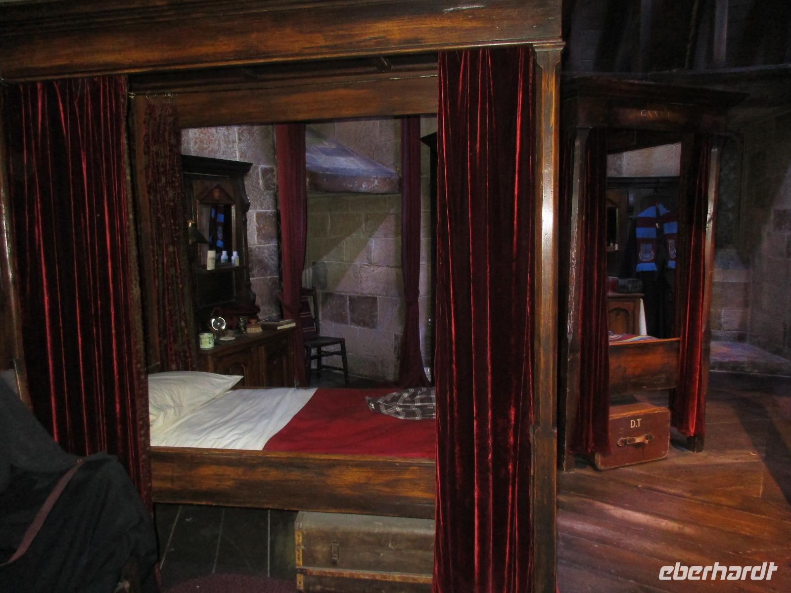 Wir können nun endlich die erste Halle betreten, wo viele der Drehorte ausgestellt werden. Hier befinden sich der Gemeinschaftssaal von Gryffindor, der Raum von Dumbledore, das Klassenzimmer für Alchemie, das Haus der Weasleys, die große schwarze Tafel der Malfoys, die Kamine im Zaubereiministerium, der Verbotene Wald und natürlich die Plattform vom Gleis 9 ¾, wo keinesfalls der Hogwarts Express fehlen darf.