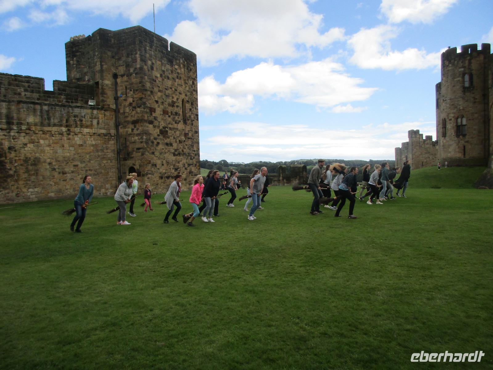 Hier angekommen unternehmen wir einen kurzen Spaziergang durch die Burganlage, wo einige Szenen aus Hogwarts gedreht wurden. Individuell kann sich jeder die Gemächer der Anlage anschauen oder den Shop im Innenhof erkunden, bevor wir um 11:30 Uhr unsere Flugstunde haben. Zwei Professoren unterrichten uns, wie wir unseren Besen herauf zaubern, auf ihn aufsteigen, ihn reiten und tatsächlich fliegen können. Mit viel Spaß lernen wir diese Sachen und halten alles genauestens auf unseren Fotos fest.
