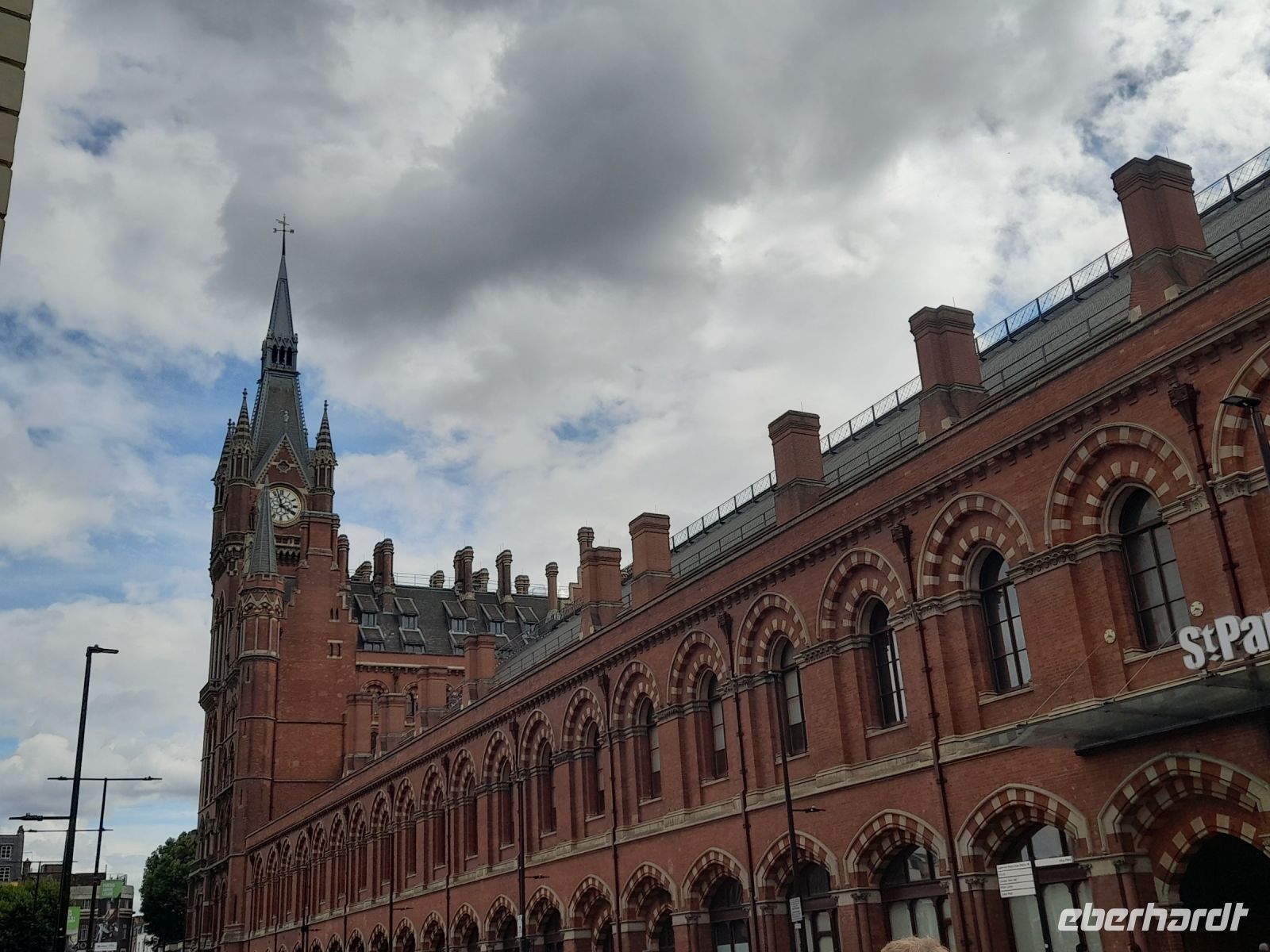 Etwa eine Stunde später haben auch die Gäste, die mit dem Flugzeug angereist sind, zu uns gefunden und Stadtführerin Ulla ist zu uns gestoßen. Zusammen mit ihr geht es nun auf Stadtrundfahrt. Zunächst durch die City of London, die mittlerweile von futuristischen Hochhäusern dominiert wird und hauptsächlich Geschäftsviertel ist, in dem es am Sonntag angenehm ruhig ist. Wir fahren vorbei an der berühmten Saint Paul's Cathedral und der gegenüber gelegenen Millennium Bridge, die in „Harry Potter und der Halbblutprinz“ von den Dementoren zerstört wird. Weiter geht es zur versteckten viktorianischen Halle von Leadenhall Market, die als Drehkulisse im ersten Film diente und wo auch der Eingang des „Tropfenden Kessels“ verborgen liegt. Anschließend geht es weiter zum legendären Bahngleis 9 ¾ im Bahnhof King's Cross. Leider sieht der Bahnhof seit der kürzlichen Renovierung sehr verändert aus. Gegenüber können wir dann noch die wunderbare Fassade der St. Pancras Station bewundern, von wo aus heute immer noch die Züge Richtung Kontinentaleuropa abfahren. Es geht nun weiter nach Westminster, ins alte London. Unser nächster Halt ist unweit der Houses of Parliament, die ebenfalls in den Harry Potter Filmen zu sehen waren. Der große Glockenturm erstrahlt nach jahrelanger Restaurierung endlich wieder ohne Gerüst in neuem Glanz. Weiter geht es dann vorbei am Buckingham Palace, Trafalgar Square und Piccadilly Circus. Wenig später verabschieden wir uns in Kensington von Stadtführerin Ulla und fahren weiter nach Heathrow, wo wir unser Lager für die nächsten drei Nächte aufschlagen.