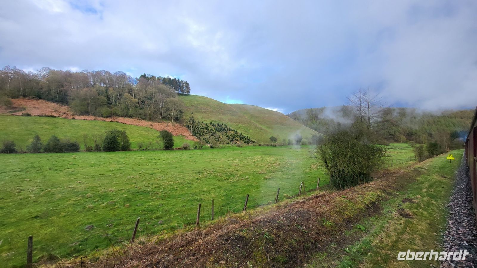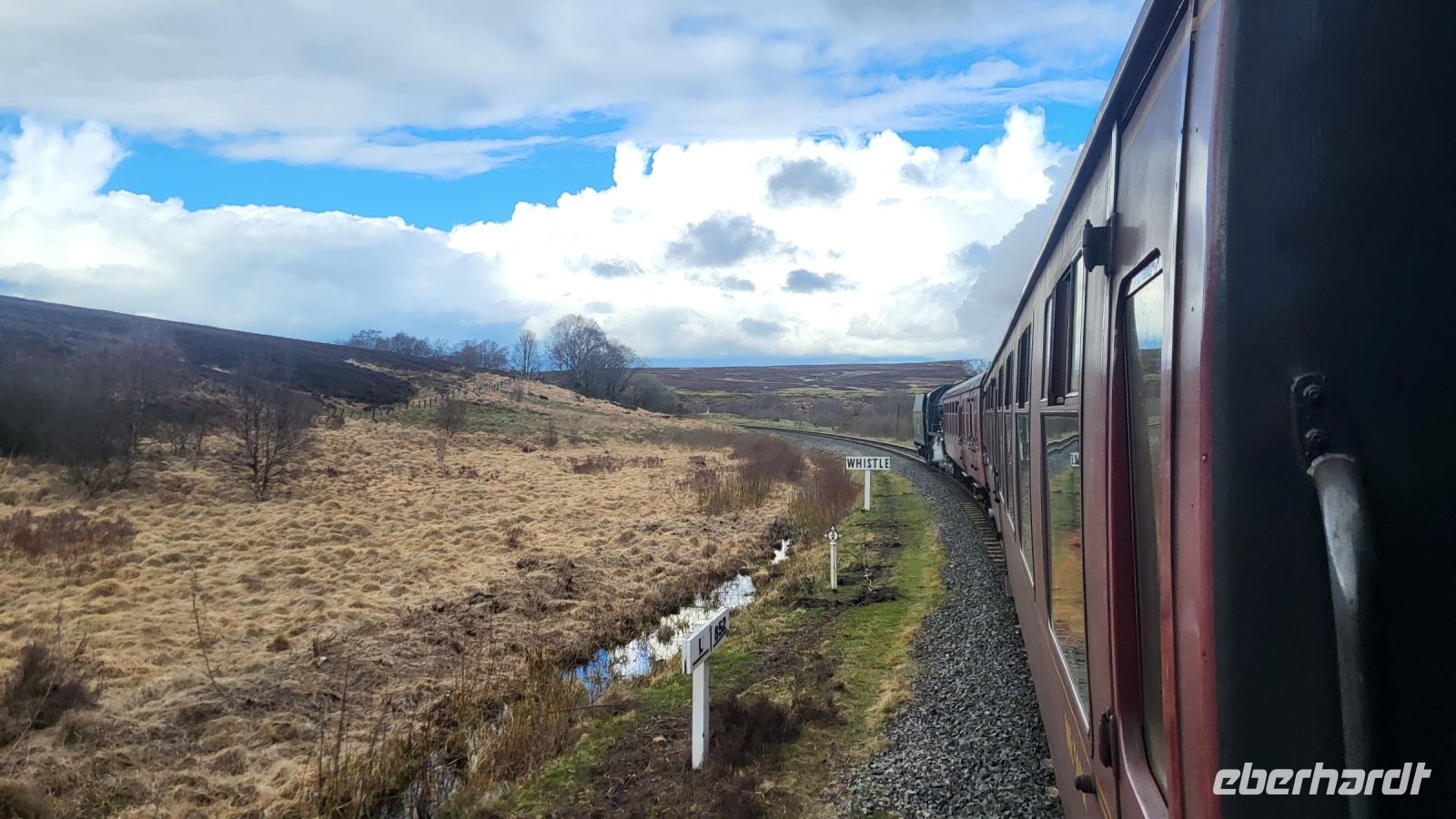 Nach der Mittagspause geht es nun zum Bahnhof von Pickering. Wir steigen vorm Bahnhof aus und haben noch genügend Zeit bevor der Zug schließlich einfährt und wir unsere Plätze einnehmen. Heute haben wir nicht nur eine Lok, sondern gleich zwei. Eine Diesellok schiebt uns, von der Dampflok werden wir gezogen. Die Reise führt uns durch eine malerische Landschaft, die mit grünen Wiesen, sanften Hügeln und atemberaubenden Ausblicken auf die North York Moors gespickt ist. Mann kann gar nicht anders, als aus dem Fenster zu schauen und die Schönheit der Natur zu genießen, die an uns vorbeirauscht.