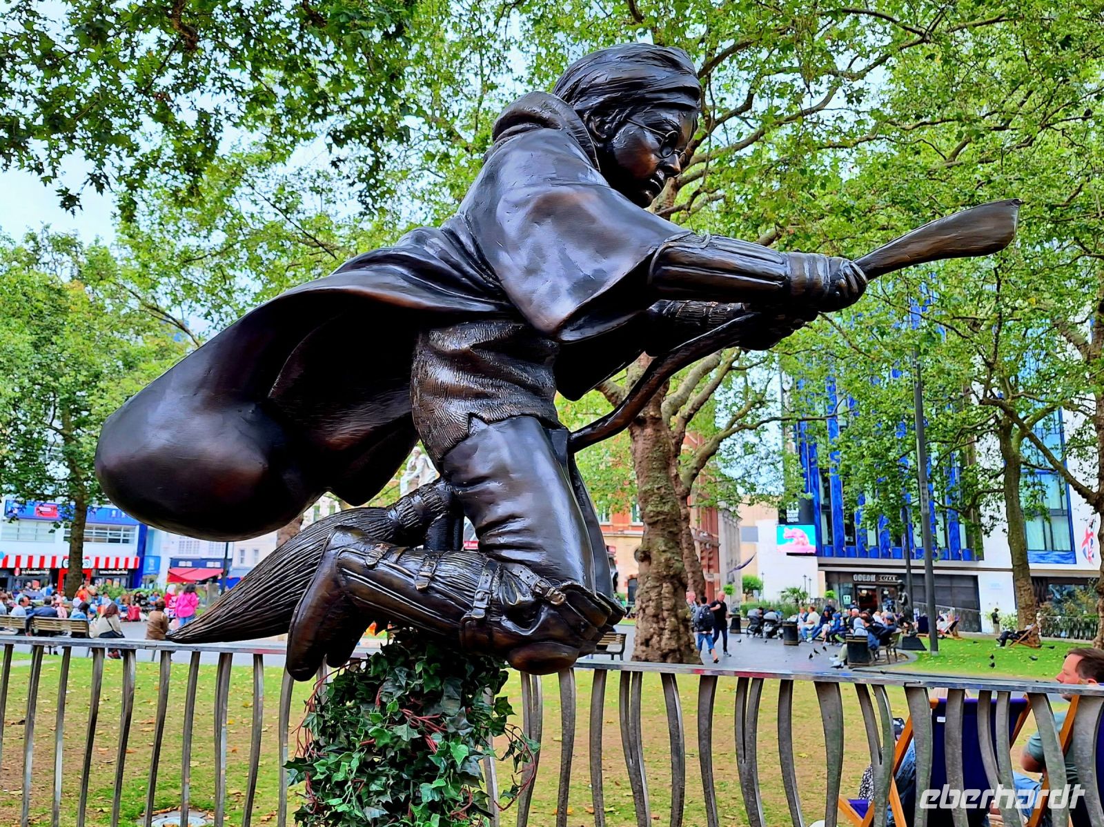 Und siehe da, unter 13 Bronzestatuen am Leicester Square finden wir neben Berühmtheiten wie Charlie Chaplin, William Shakespeare, Gene Kelly, Paddington Bear, Laurel & Hardy, Batman, Mary Poppins und Mr. Bean auch die Harry Potter – Statue.