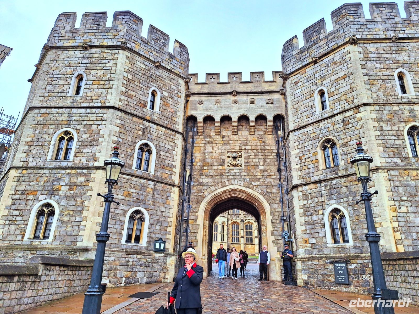 Zunächst machen wir uns auf den Weg nach Windsor. Dort befindet sich Windsor Castle, das größte durchgängig bewohnte Schloss der Welt und eine der offiziellen Hauptresidenzen des britischen Monarchen. Außerdem hat Windsor neben einer hübschen Fußgängerzone und einem viktorianischen Bahnhofs-gebäude noch drei Sehenswürdigkeiten: Neben der Guildhall (Ehem. Zunfthalle, heute Museum) mit den „Fake Säulen“ und dem Crooked House (Schiefes Haus) sehen wir die Queen Charlotte Street, mit knapp 16 Metern Länge ist sie die kürzeste Straße in England.