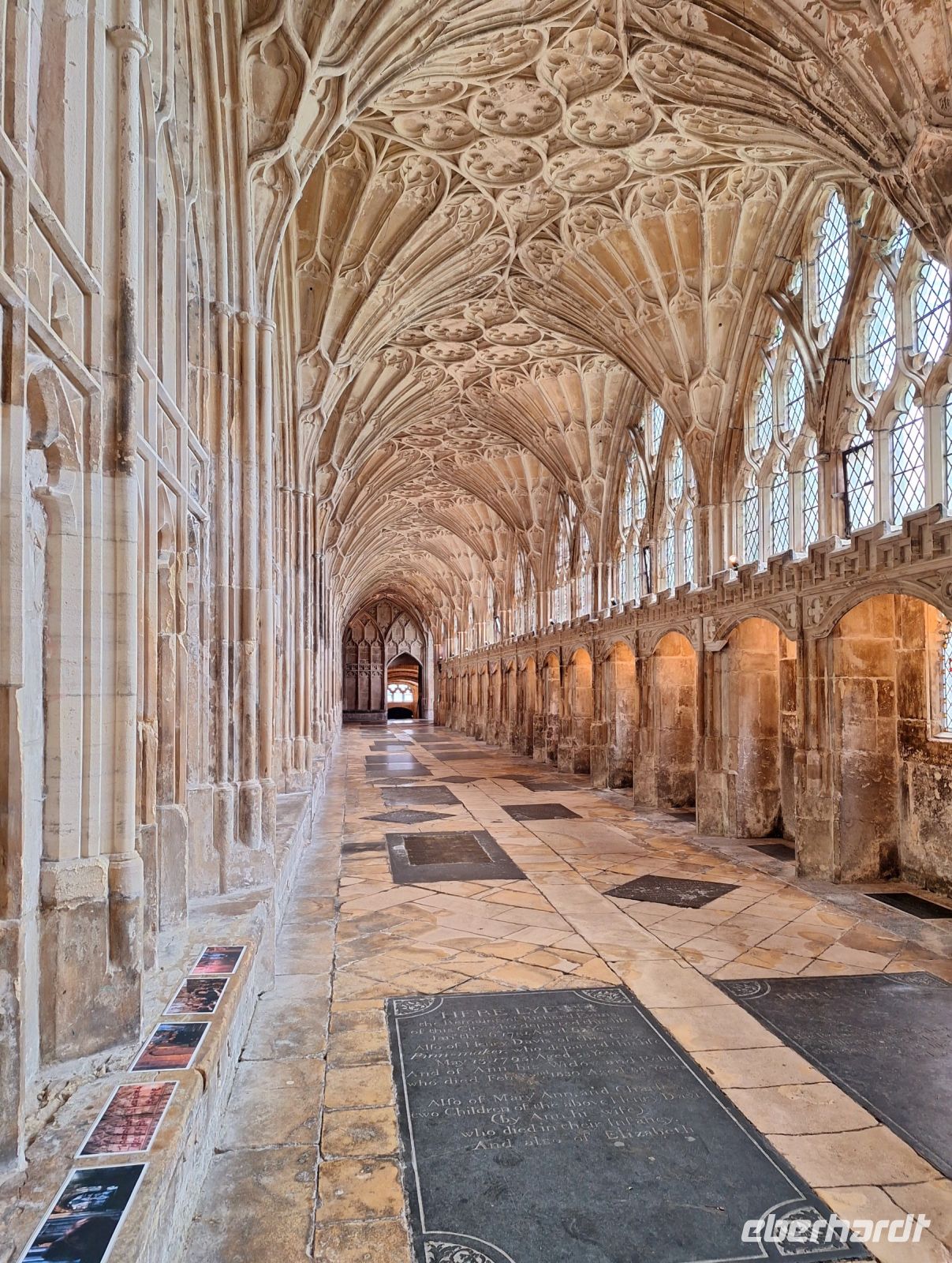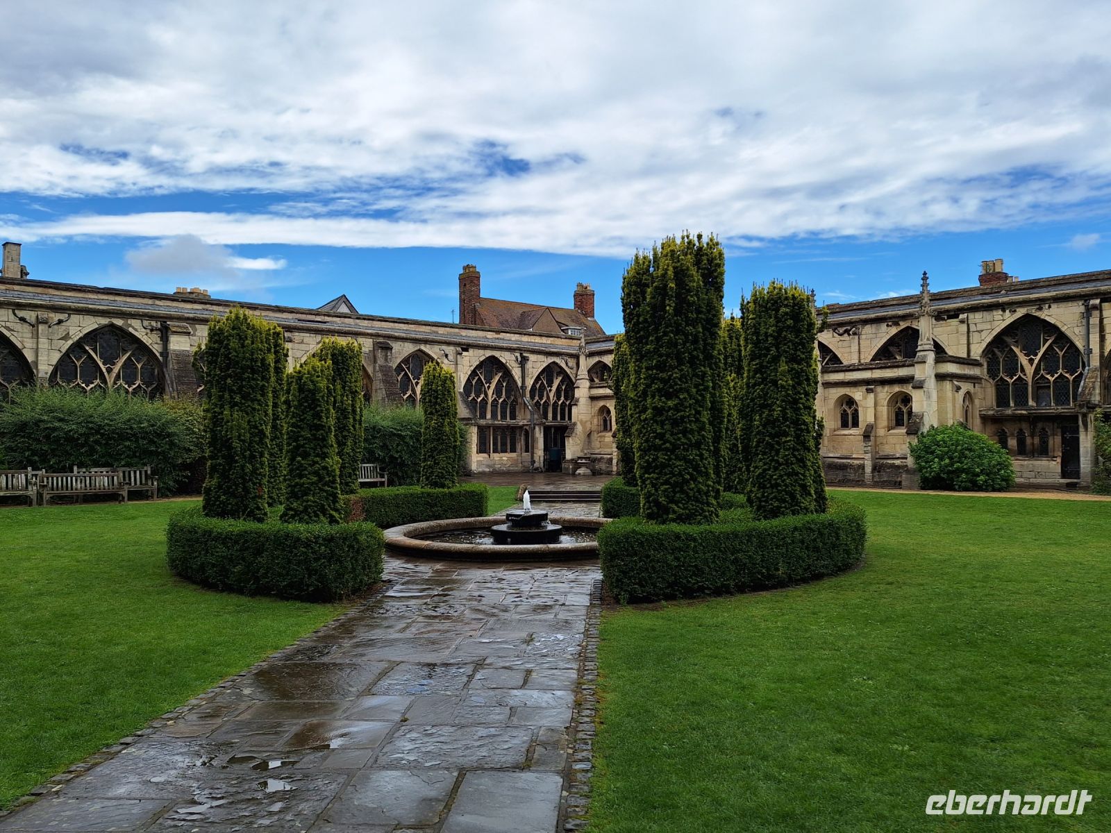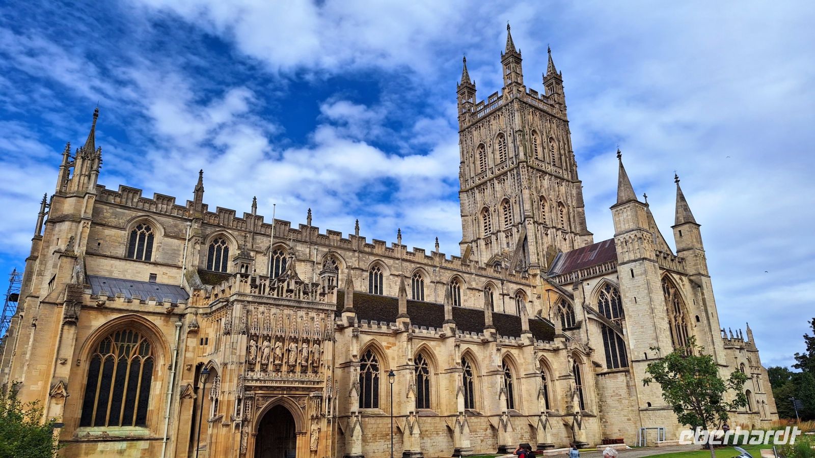 In der Gloucester Cathedral sind wir erschlagen von der Größe, der Fülle und den riesigen Bleiglasfenstern. Wir widmen uns den Drehorten, denn das Porträt der fetten Dame, Harrys Versteck, die Szenen mit Malfoy & Snape u.a. sind dort entstanden. Und dann werden unsere Mädchen selbst zu Filmstars. Mit Umhang und Zauberstab schweben sie durch den Kreuzgang und freuen sich über gelungene Videos für Freunde und Familie zu Hause.