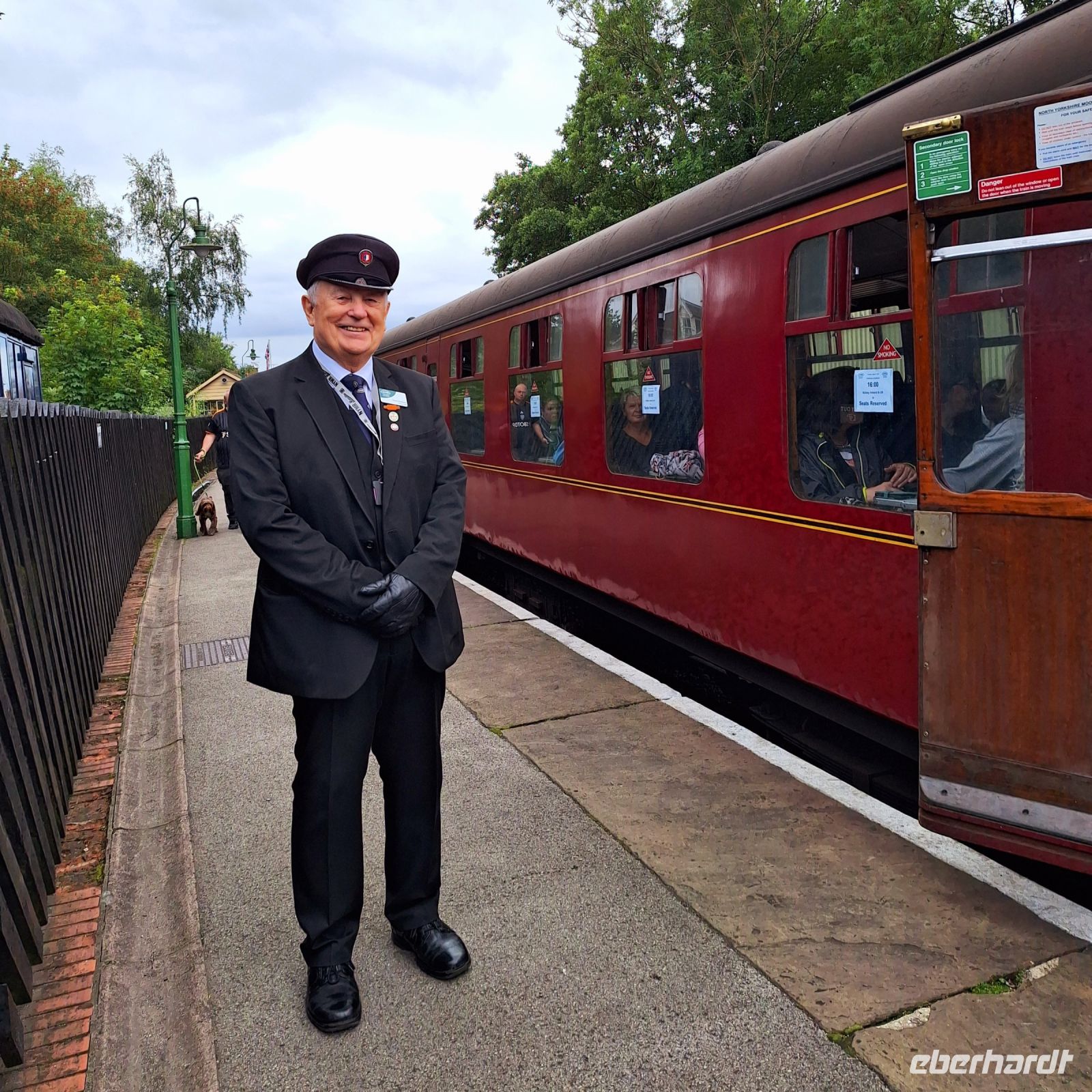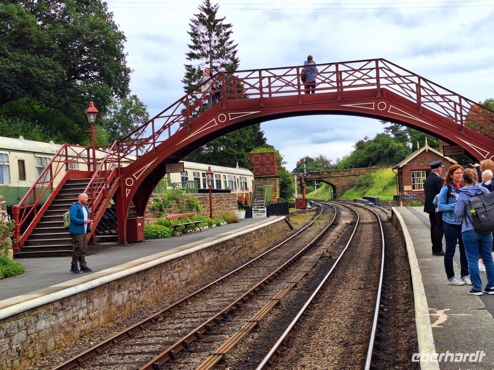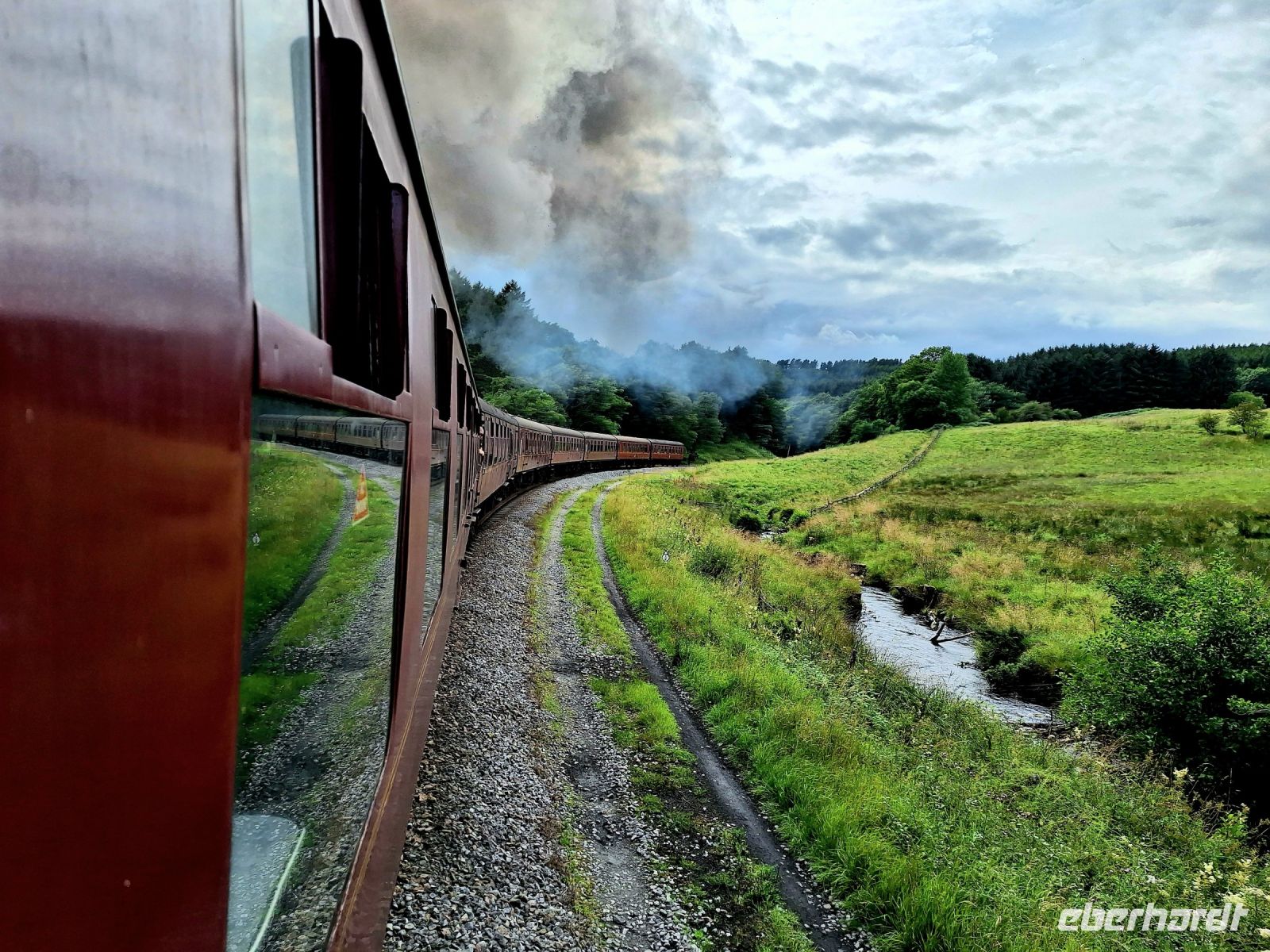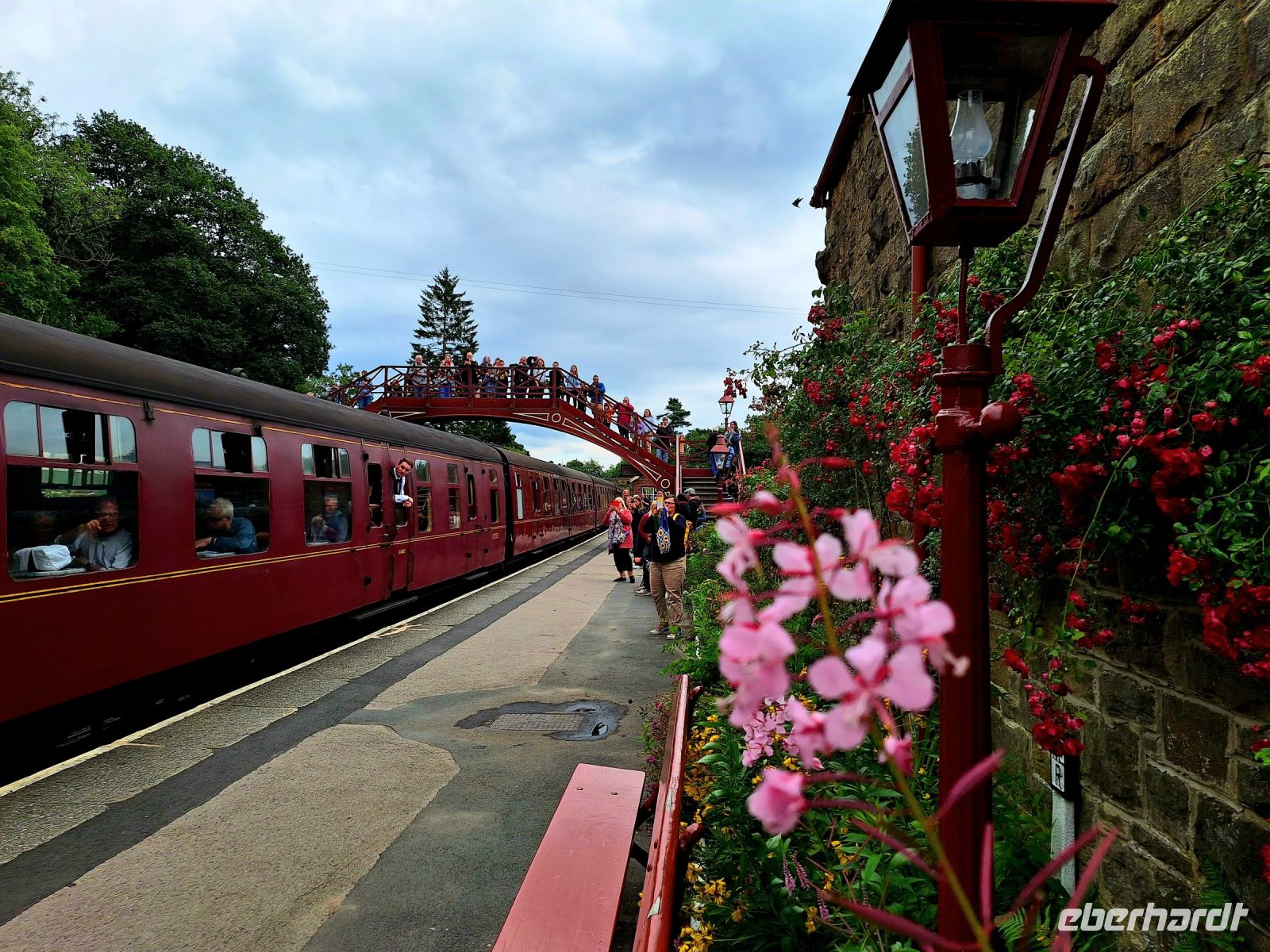 Ein weiteres Highlight erwartet uns. In Pickering ist wieder einmal die Zeit stehen geblieben. Die Station der North Yorkshire Moors Railway ist mit ihren historischen Accessoires die perfekte Kulisse für Film und Fernsehen. Der Stationsvorsteher begrüßt uns herzlich. Ca. 300 ehrenamtlich Engagierte kümmern sich hier um den Erhalt dieser Bahnlinie. Bald schon hören, sehen und riechen wir die Dampflok. Der Zug fährt ein. Fast ein ganzer Waggon ist für unsere Gruppe reserviert.