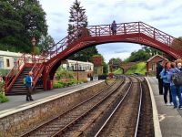 Viel zu schnell ist die Fahrt vorbei und wir kommen in Hogsmeade an, ach nein, das heißt bei den Muggeln ja Goathland. Hinter der roten Brücke versteckt sich Hogwarts im „Nebel“, aber das Fotomotiv wird vielfältig eingefangen. Unser Busfahrer Jan erwartet seine Gruppe auch schon sehnsüchtig und nach einem kurzen Spaziergang durch den Ort geht es weiter. Die Landschaft hat sich verändert, wir fahren über die fast baumlose und mit blühendem Heidekraut bewachsene Hochebene der North York Moors, die sich ca. 400m über dem Meer erhebt.