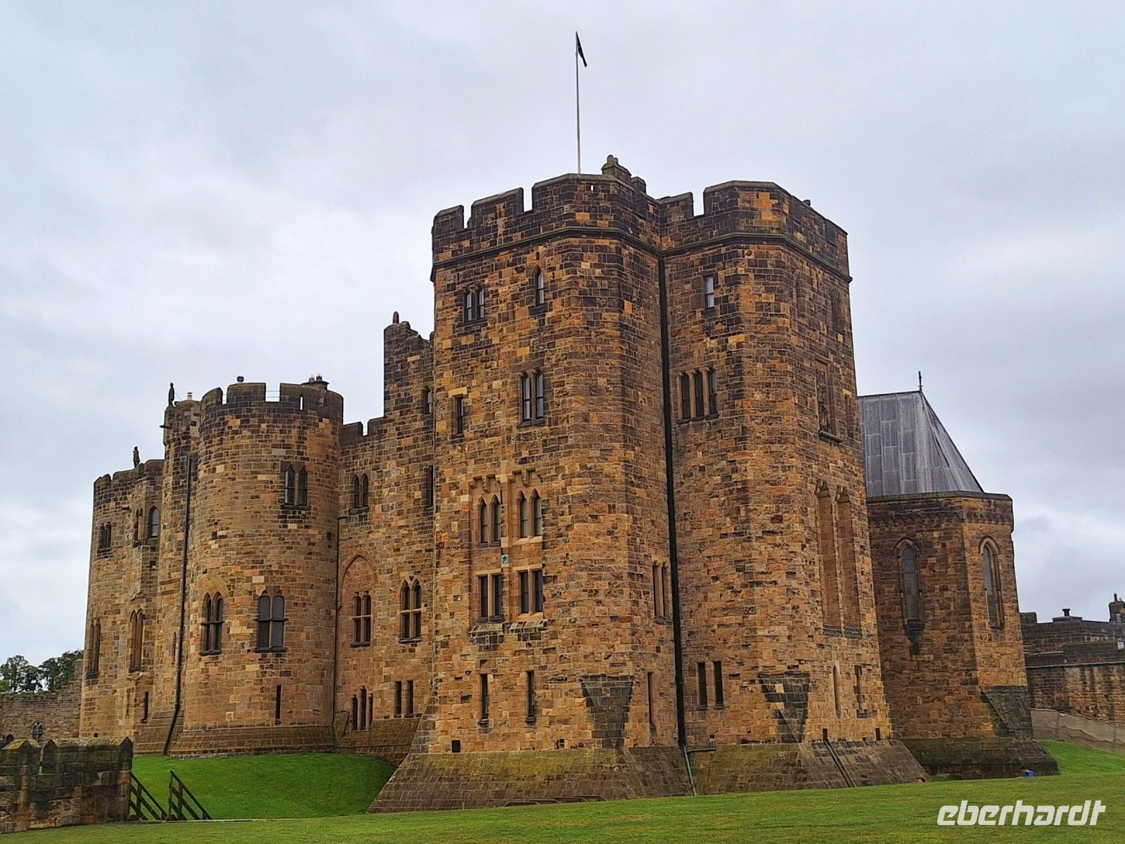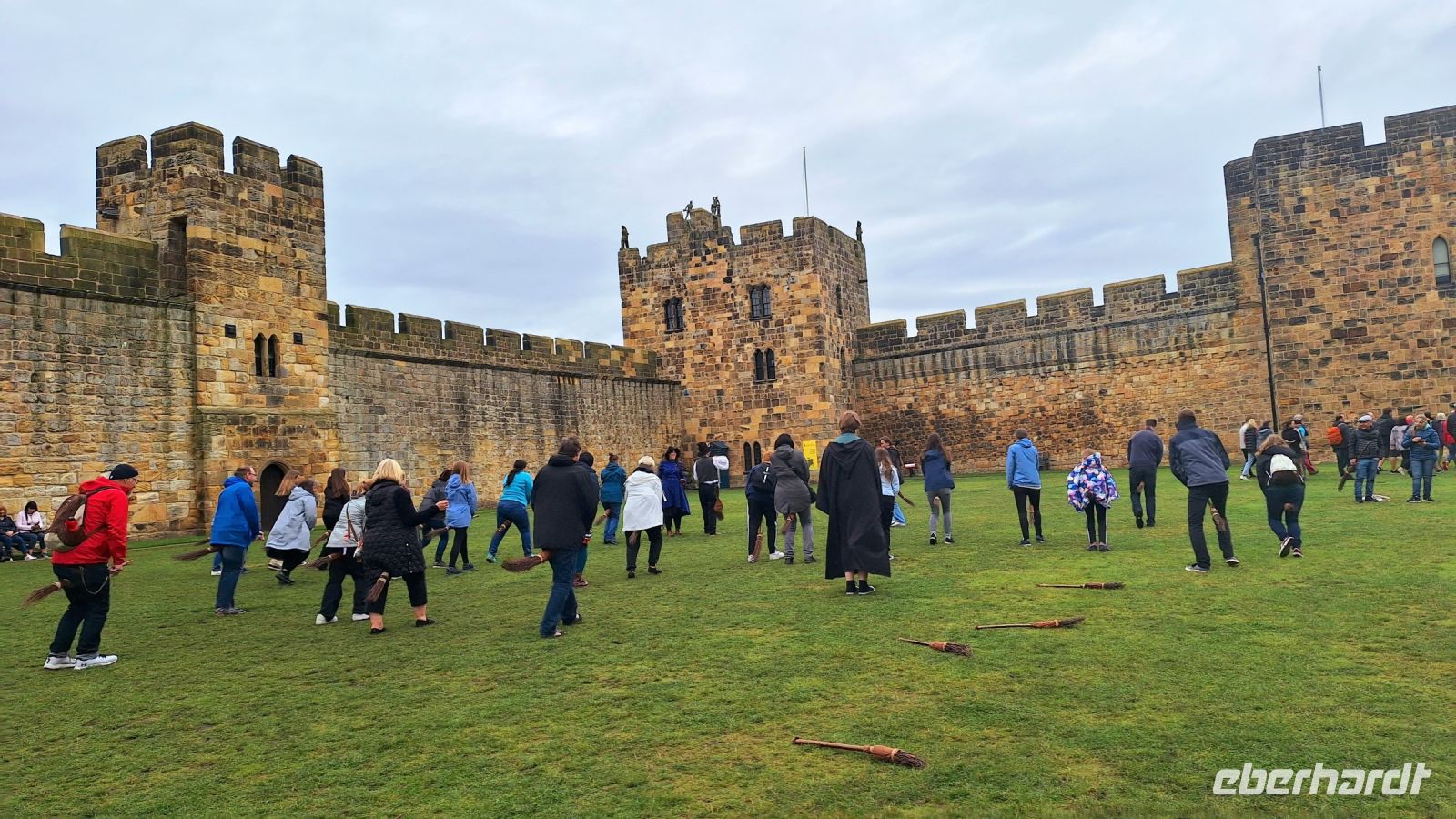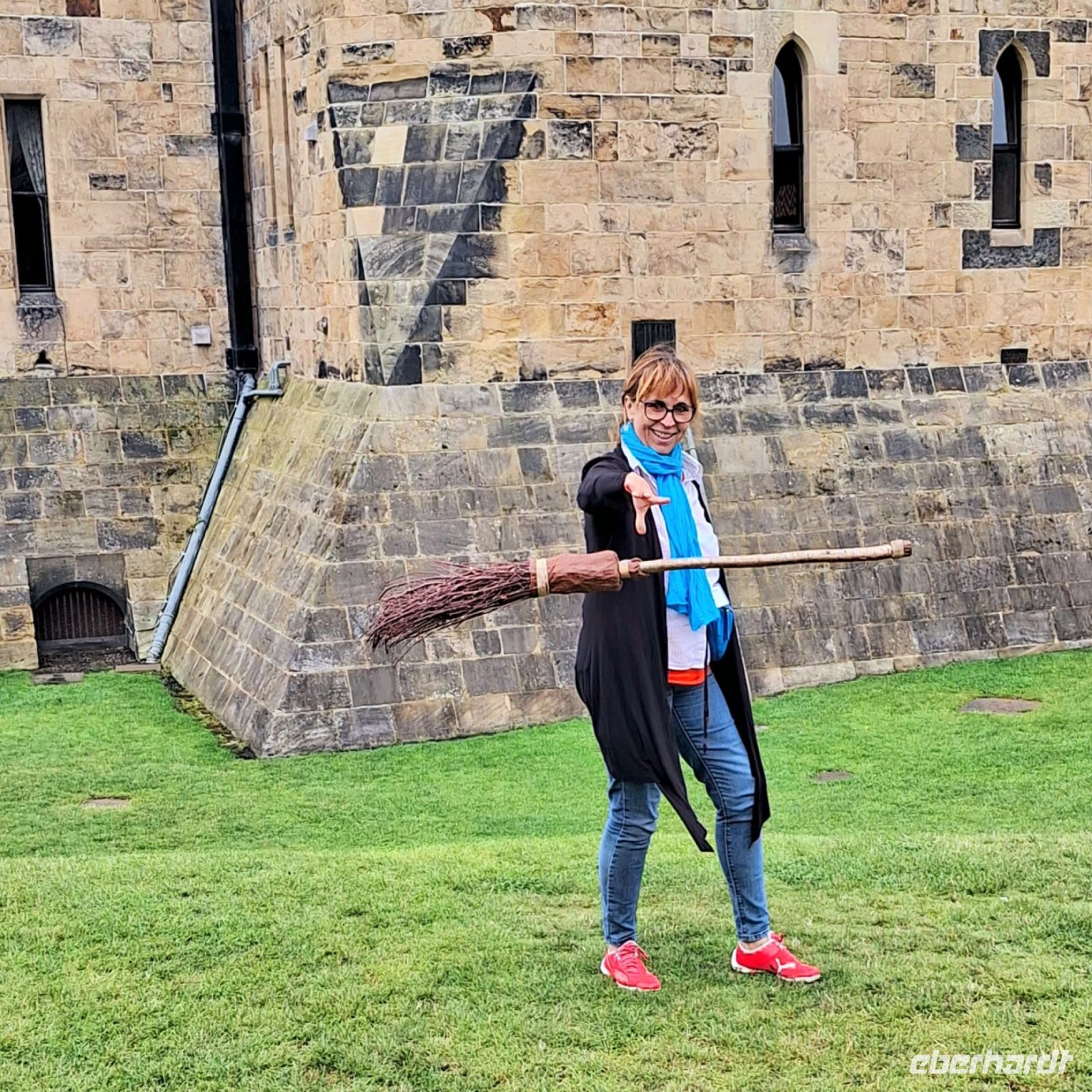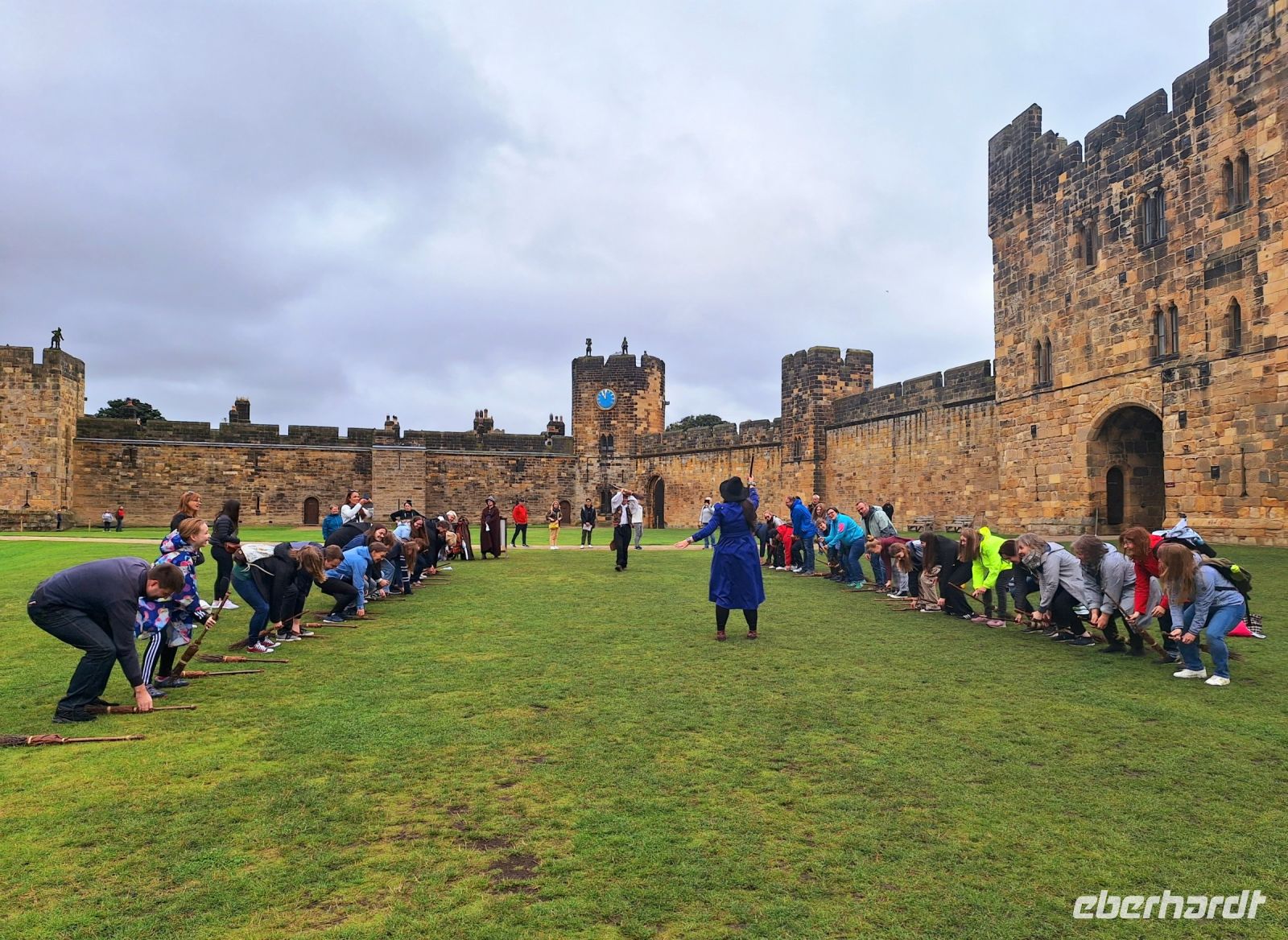 Der Tag der Abreise und der ersten Abschiede ist gekommen, aber vorher freuen wir uns auf ein weiteres, sehr wichtiges Ereignis unserer Reise. Wir müssen noch einmal zur Schule gehen und unsere Besenflug-Prüfung ablegen. Dazu fahren wir nach Alnwick Castle, dem zweitgrößten Adelssitz Englands (nach Windsor) und Stammsitz der Familie Percy.