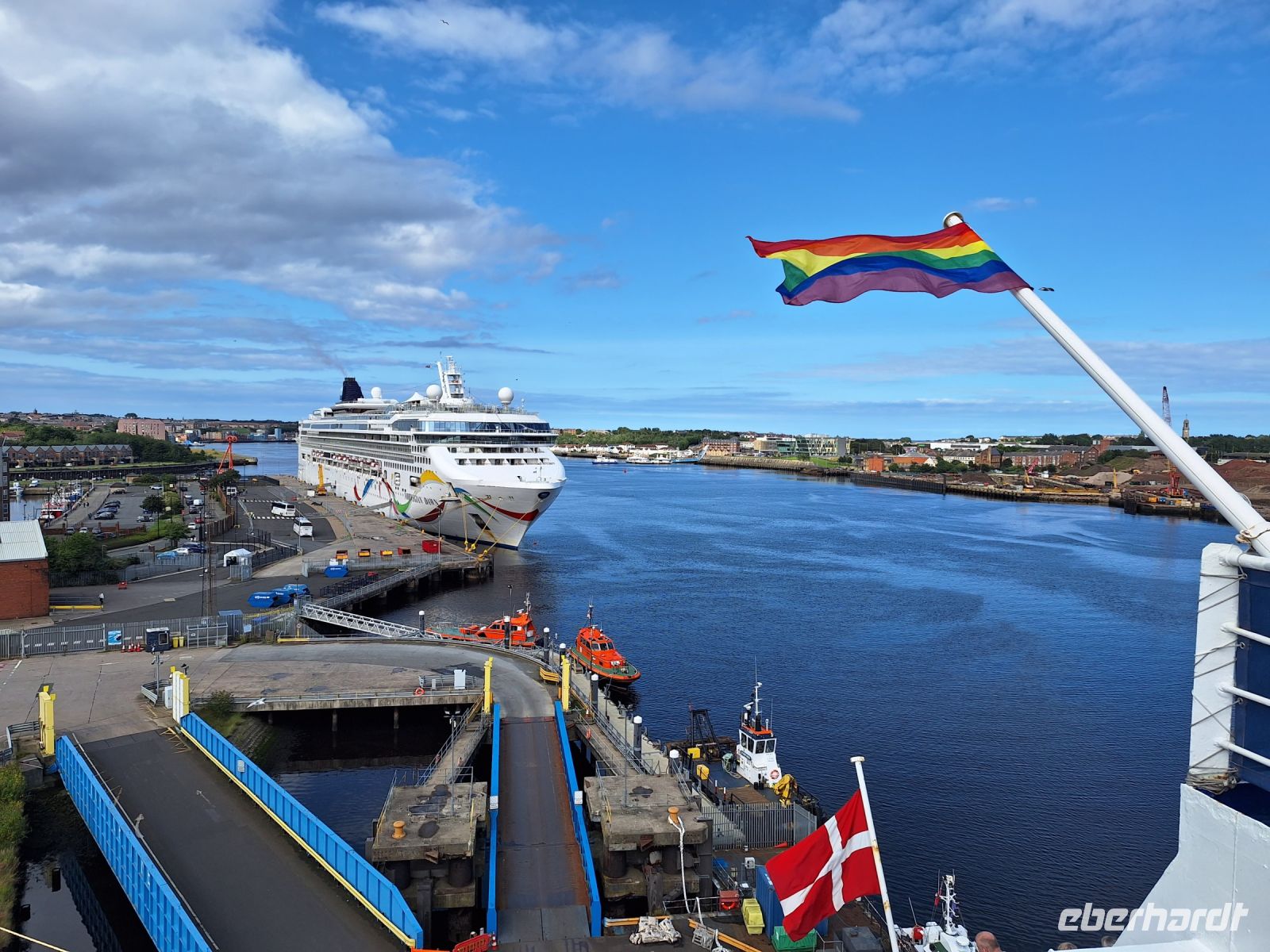 Alle anderen fahren weiter zum Fährhafen, wo wir uns der Pass- und Zollkontrolle unterziehen. Tatsächlich werden sechs Koffer willkürlich ausgewählt. Diese und ihre Besitzer sind die „Stichproben“ und werden etwas genauer kontrolliert. Natürlich ist alles in Ordnung und wir können auf der dänischen Fähre „Princess Seaways“ aus dem Jahr 1986 einchecken.