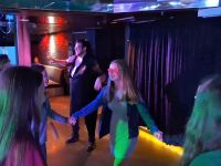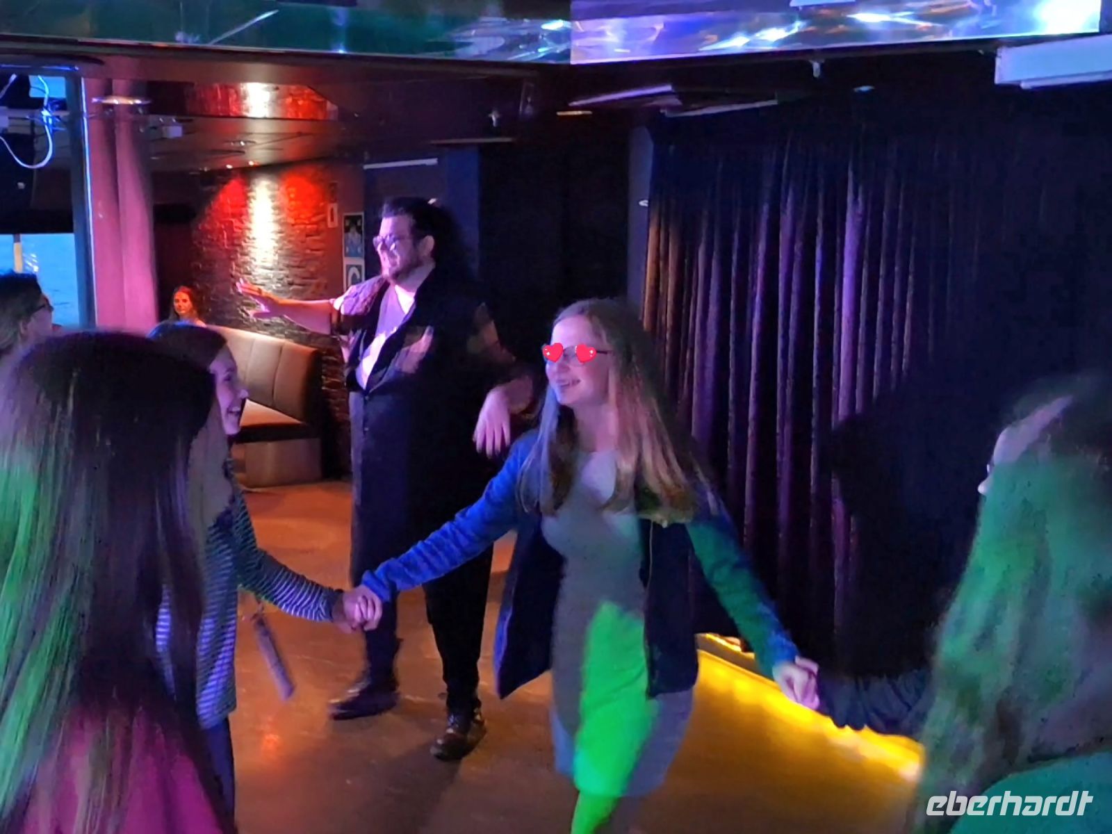 Hier gibt es ein vielfältiges und sehr leckeres Buffet zum Abendessen, für wirklich jeden Geschmack ist etwas dabei. Leider kann man nicht alles probieren, irgendwann ist der Bauch einfach voll. Aber das kann man sich ja später in der Disco wieder abstrampeln. Es gibt Live-Musik, Bingo-Quiz und verschiedene Unterhaltungsmöglichkeiten. Und dann entdecken wir „Hagrid“ auf der Tanzfläche! Nun gibt es kein Halten mehr und wir tanzen uns durch den Abend, bevor wir in unsere nun noch mehr schwankenden Kojen fallen.