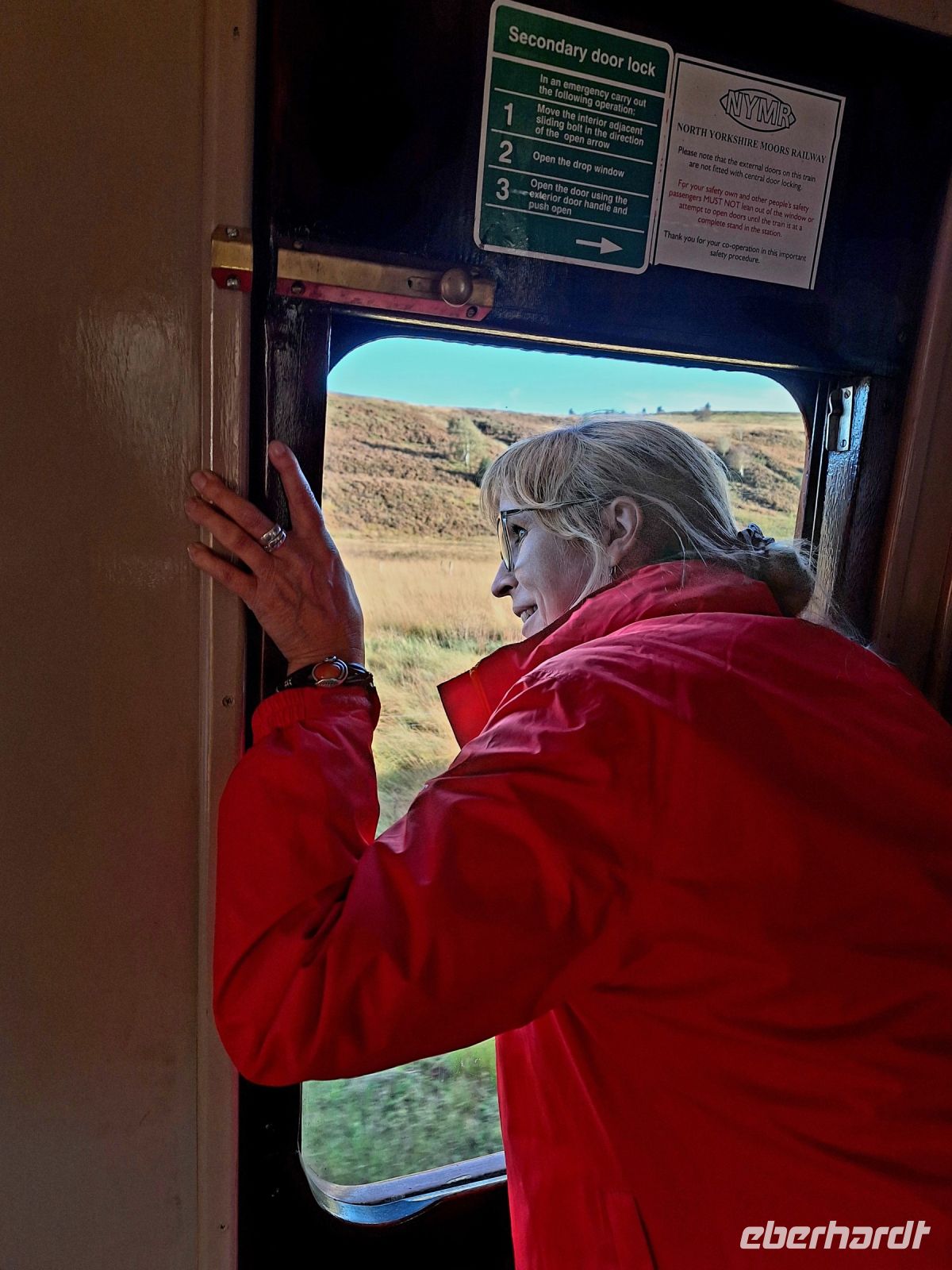 Als wir eintreffen, hören wir die Durchsage, daß der vorige Zug ca. 50 Minuten Verspätung hat und demnächst einfahren wird. Ob unser Zug auch verspätet sein wird? Dies wird bejaht und so macht der freundliche Bahnhofsvorsteher es möglich, daß wir schon in dem vorigen Zug mitfahren können und sogar einen Waggon für uns haben. Ganz vorn, so können wir das Ankoppeln der Dampflok genau beobachten. Und dann gibt´s unterwegs noch eine süße Überraschung von unserer Reiseleiterin. So kommen wir schon vor unserer eigentlichen Ankunftszeit an und haben in Goathland ausreichend Zeit, die rote Brücke und den Bahnhof von „Hogsmeade“ fotografisch festzuhalten. Auch unser Gruppenfoto entsteht hier.