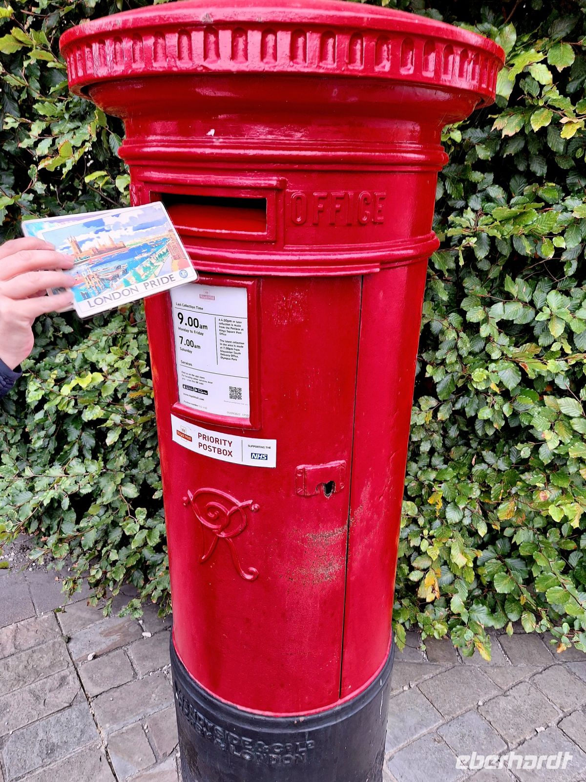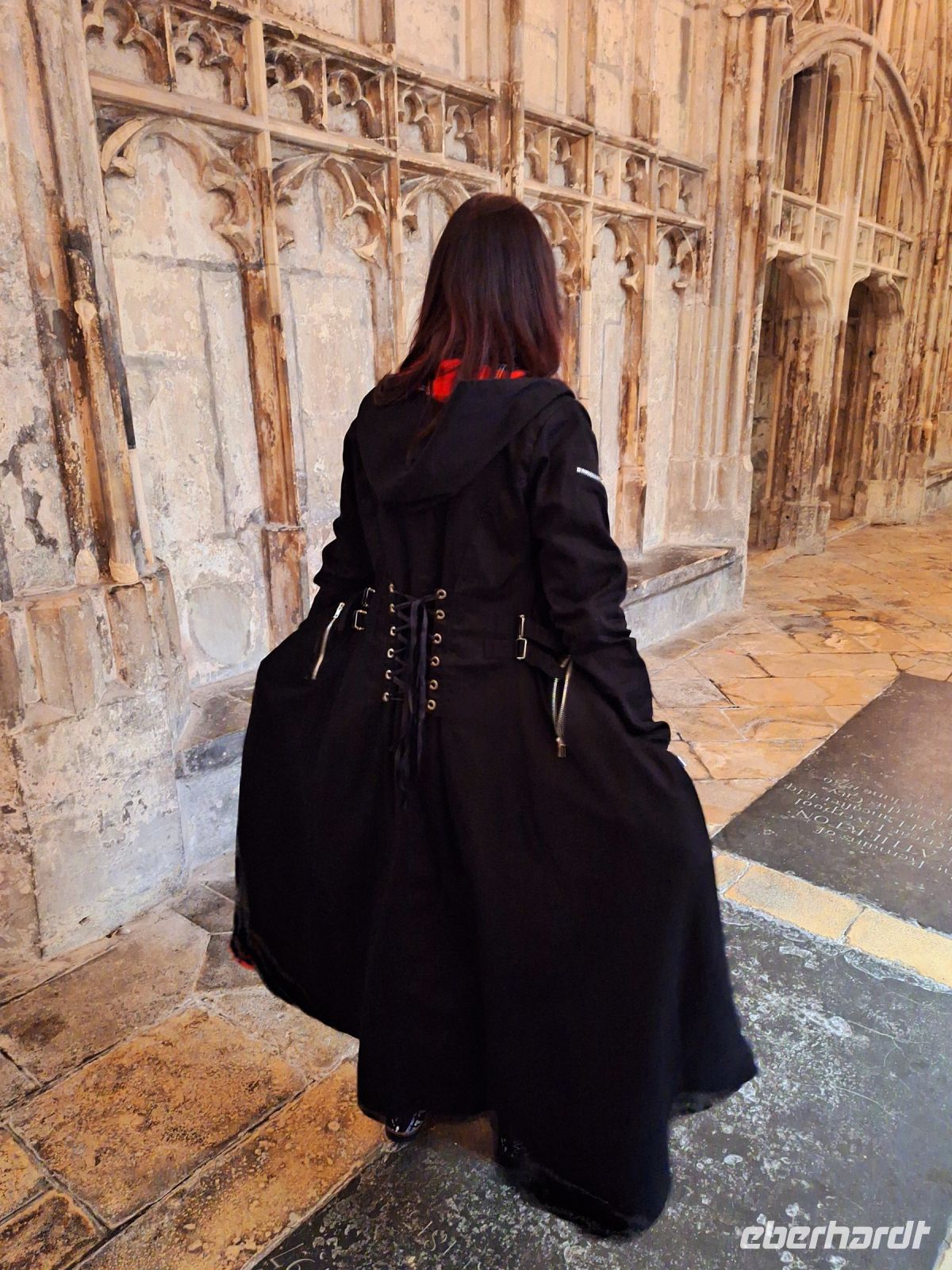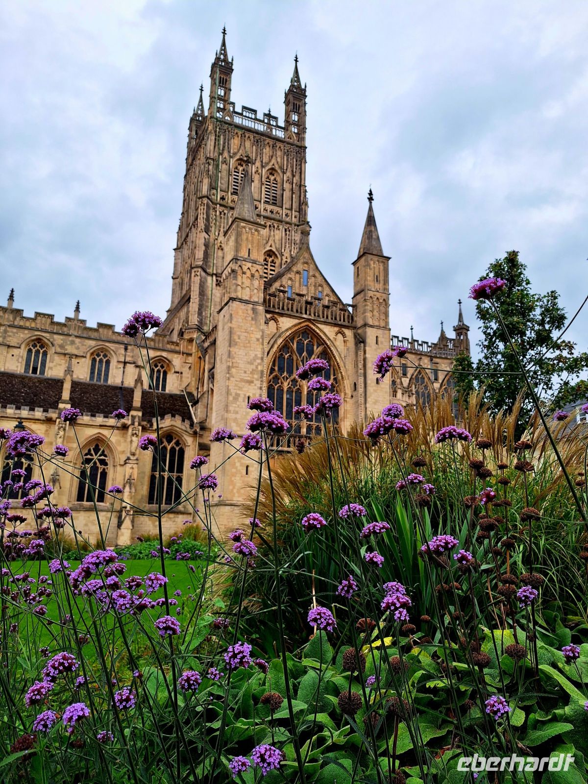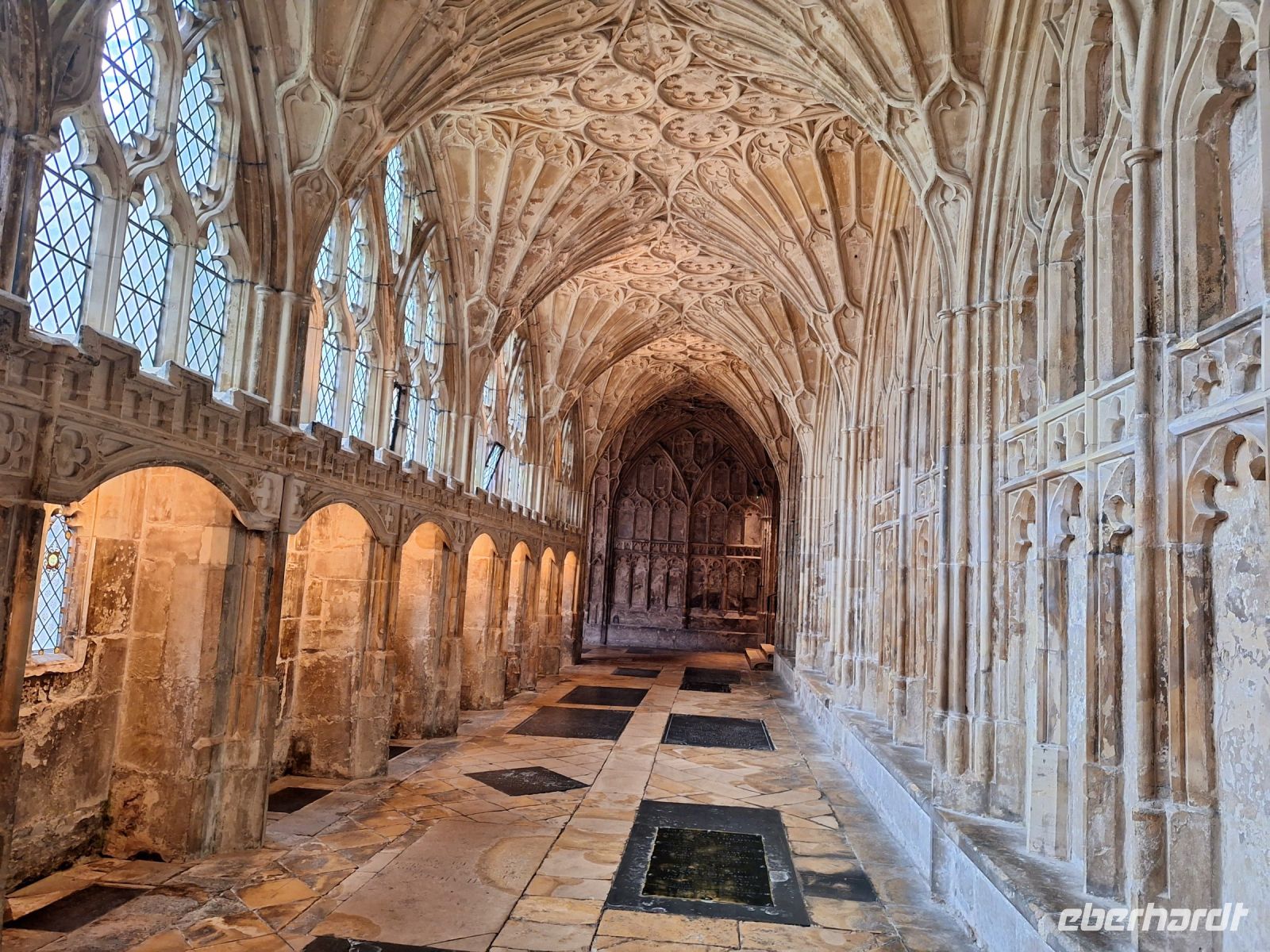Als wir etwas später in Gloucester ankommen, fallen die ersten Regentropfen. Wir gehen zur unglaublich imposanten Gloucester Cathedral, wo uns weitere Drehorte erwarten. Doch zunächst müssen noch die Postkarten in den roten Briefkasten aus viktorianischer Zeit geworfen werfen. In den Kreuzgängen der Kathedrale wurden viele in Hogwarts spielende Szenen gedreht. Auch wir nutzen diese perfekte Location für besondere Fotos und Videos.