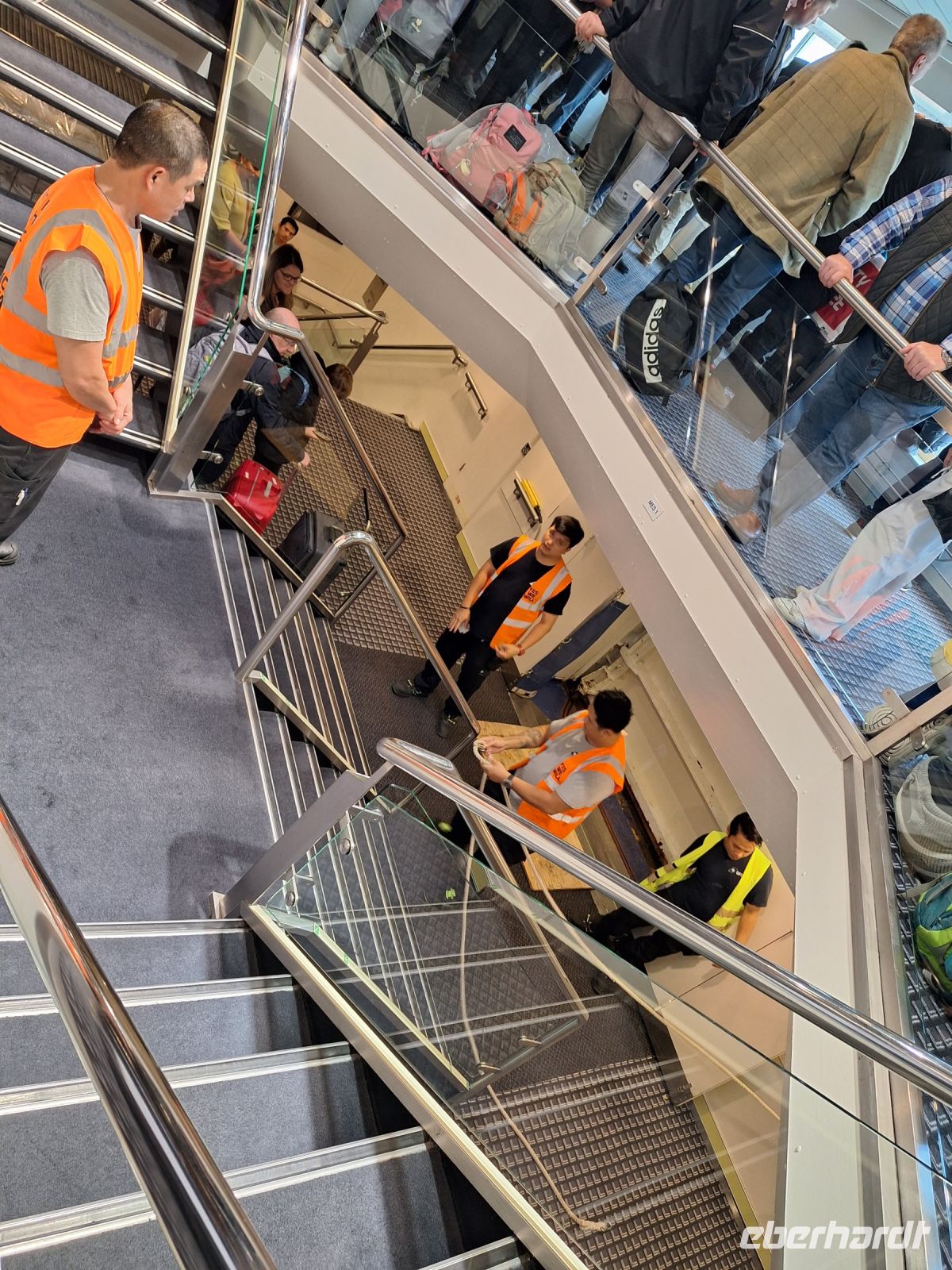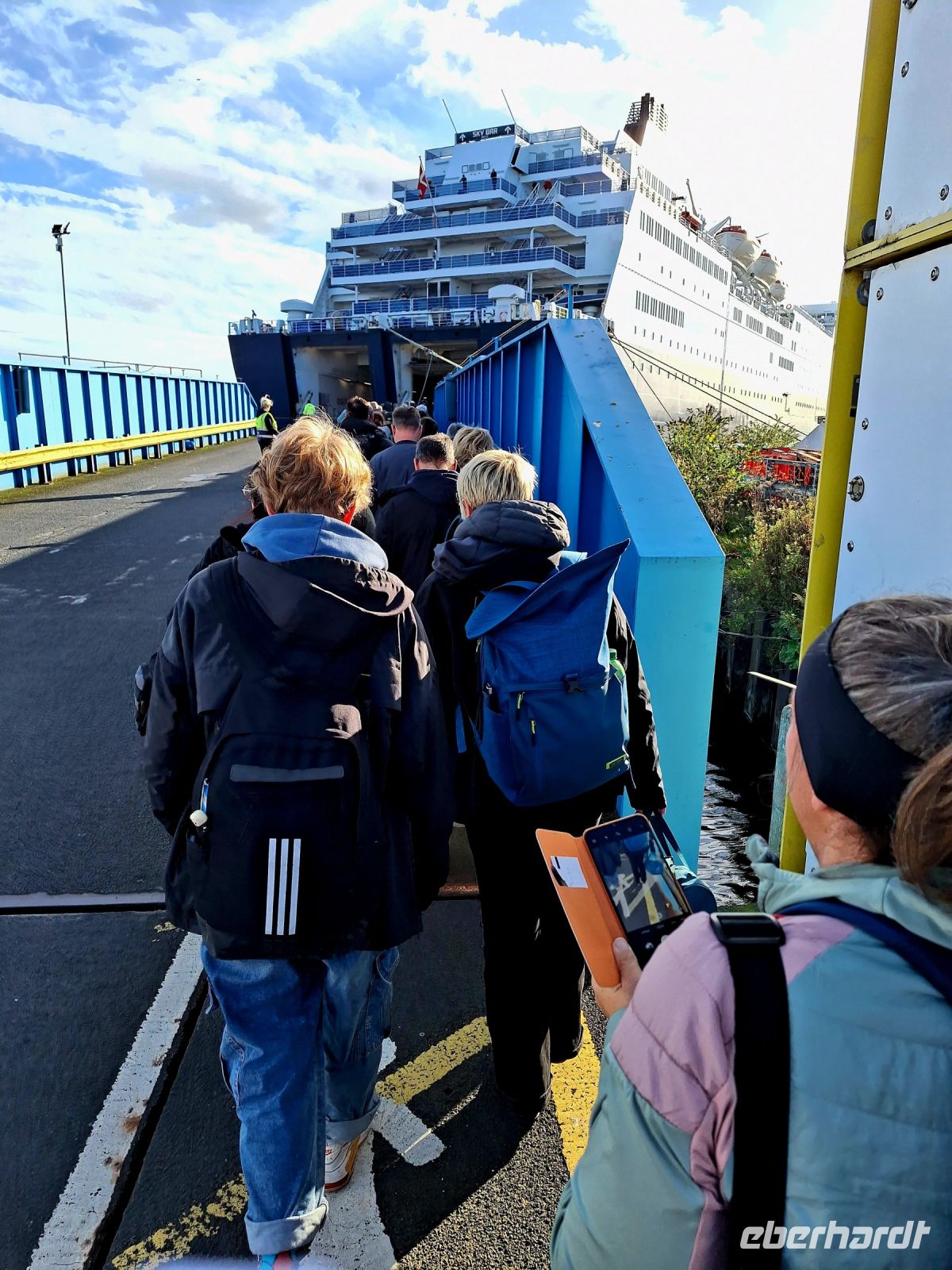 Und dann müssen wir warten und warten… Eine hektische Beamtin in Warnweste und mit Walkie Talkie springt um den Bus und gibt diverse Kommandos, doch endlich geht es zu Fuß über das Autodeck, weil wegen der Flut die Gangway nicht angelegt werden kann. Wir wundern uns, warum man das nicht vorher weiß.
