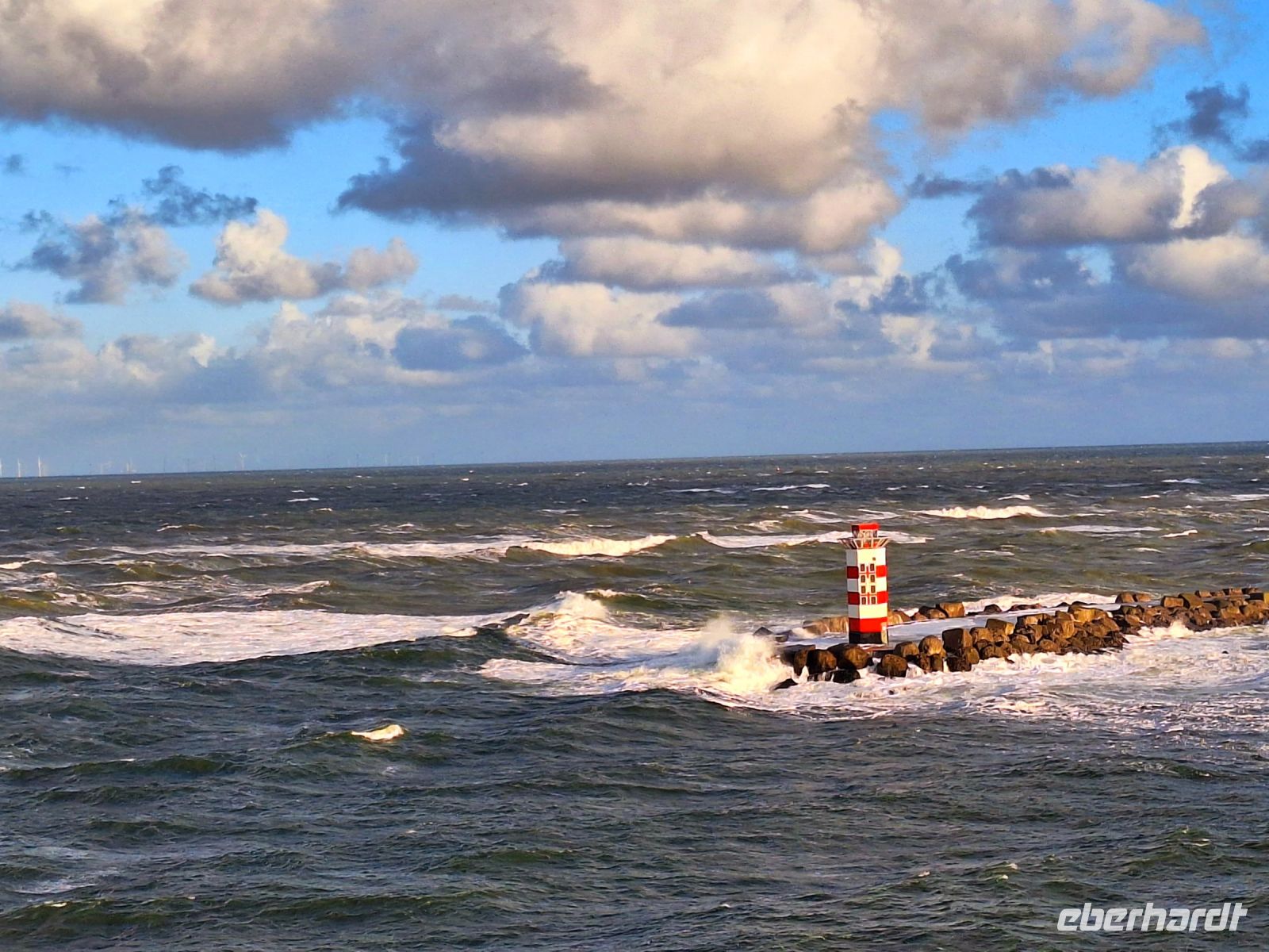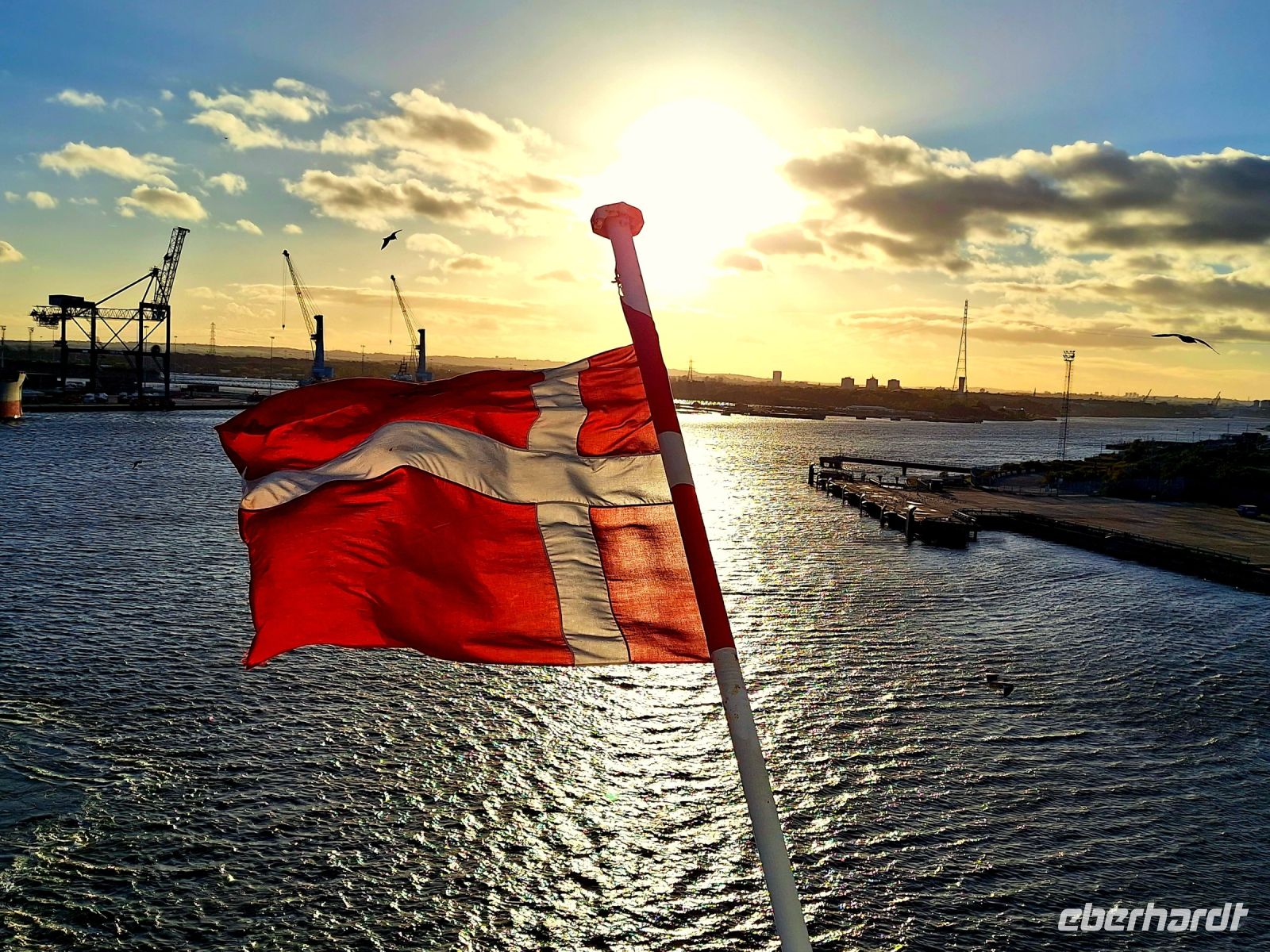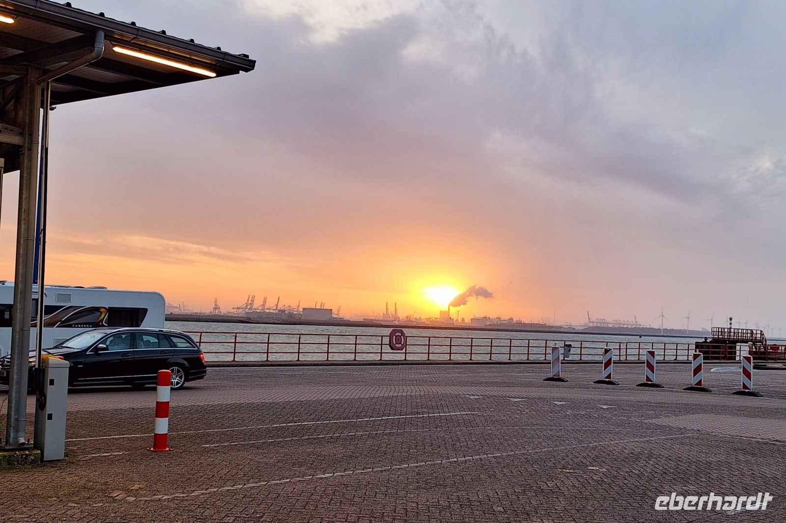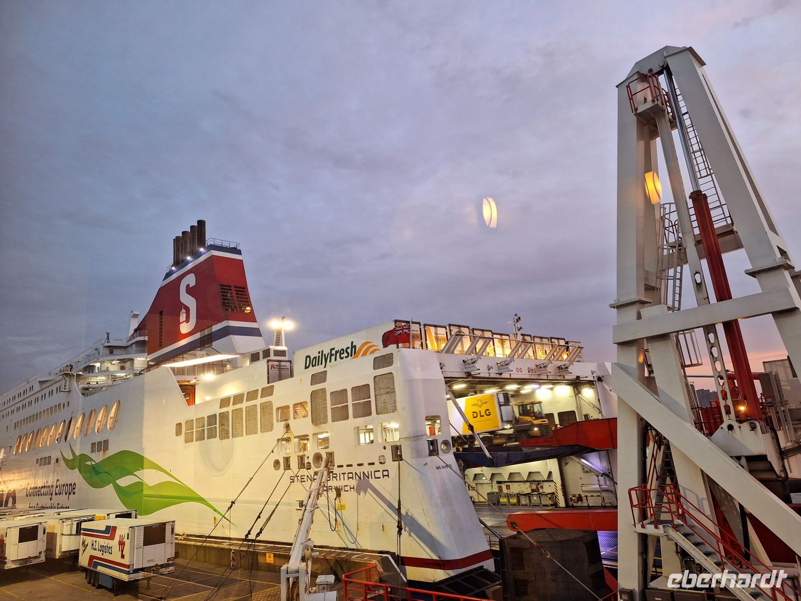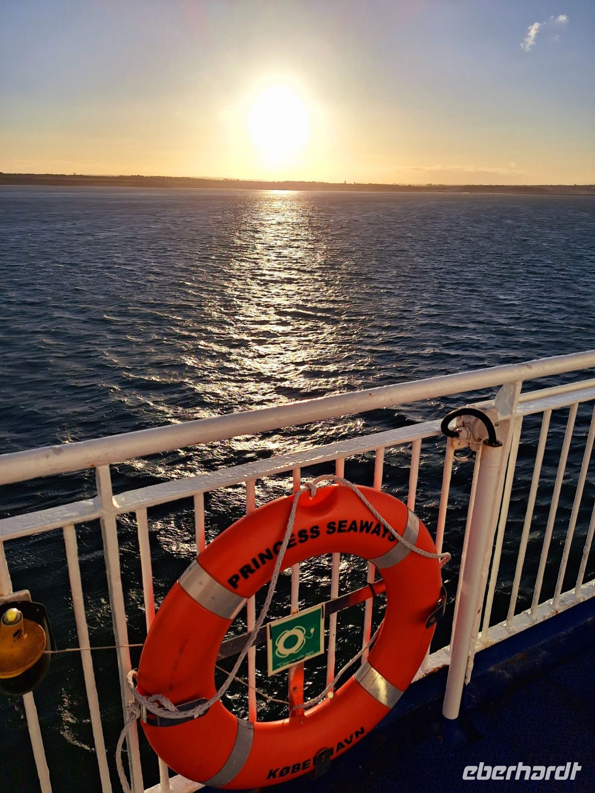 Auf der Fähre stellen wir die Zeit um (Hermines Timechanger funktioniert) und beobachten das Auslaufen der Fähre in der Abendsonne. Bye Bye England!