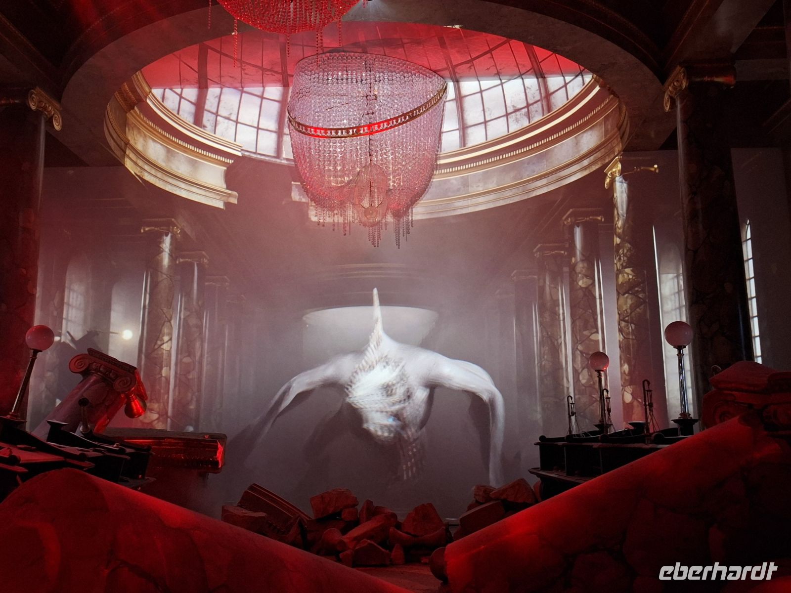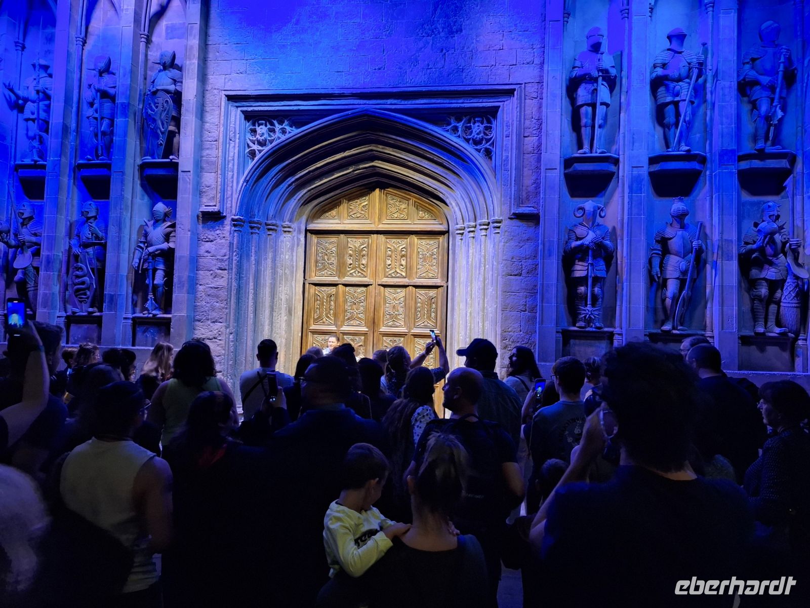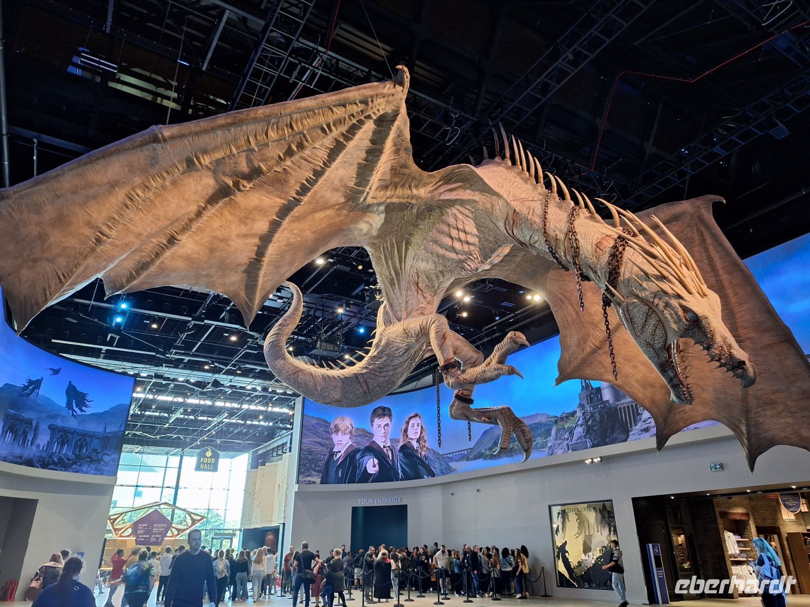 Das erste WOW können wir uns nicht verkneifen, als wir die gigantische Empfangshalle betreten. Der Ukrainische Eisenbauch-Drache schwebt über uns, an den Wänden sehen wir überlebensgroß die Protagonisten unserer Harry Potter – Welt auf gigantischen LED-Bildschirmen.