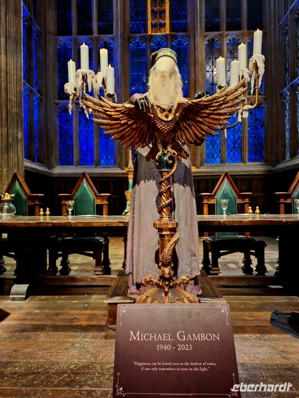 Am Ende des Raumes wird des kürzlich verstorbenen Dumbledore-Schauspielers Michael Gambon gedacht.
