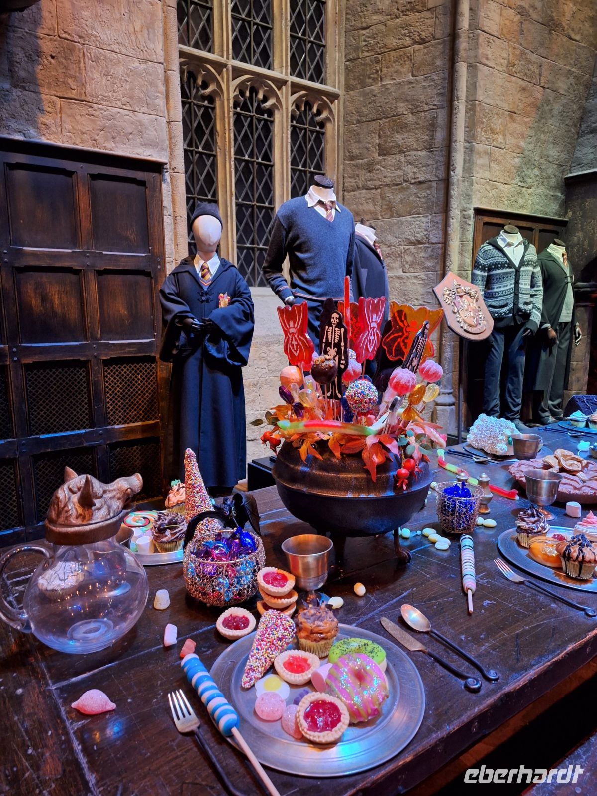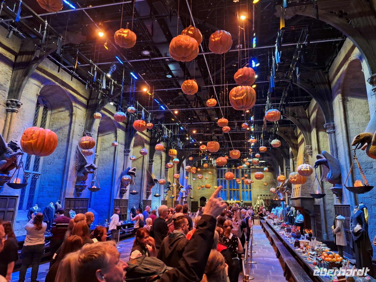 Und dann geht es los, nach filmischer Begrüßung dürfen wir die Tür zur Großen Halle durchschreiten. Zu unserer großen Überraschung ist hier alles passend zur Jahreszeit Halloween dekoriert. Statt Kerzen schweben Kürbisse an der Decke, die lange Tafel ist über und über mit Süßigkeiten bedeckt.