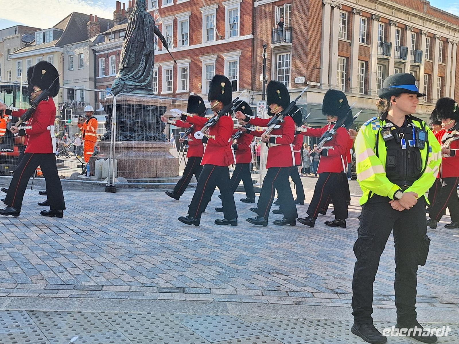 Gemeinsam spazieren wir durch Windsor, entdecken das schiefe Haus (Crooked House) und die kürzeste Straße von Großbritannien (Queen Charlotte Street) sowie die Windsor Guildhall mit den vier „Fakesäulen“. Über die Themse – Brücke hinweg geht es nach Eton und dann können wir den Aufmarsch der Königlichen Garde zur Wachablösung beobachten. Changing the Guard ist ein echt britisches Spektakel.