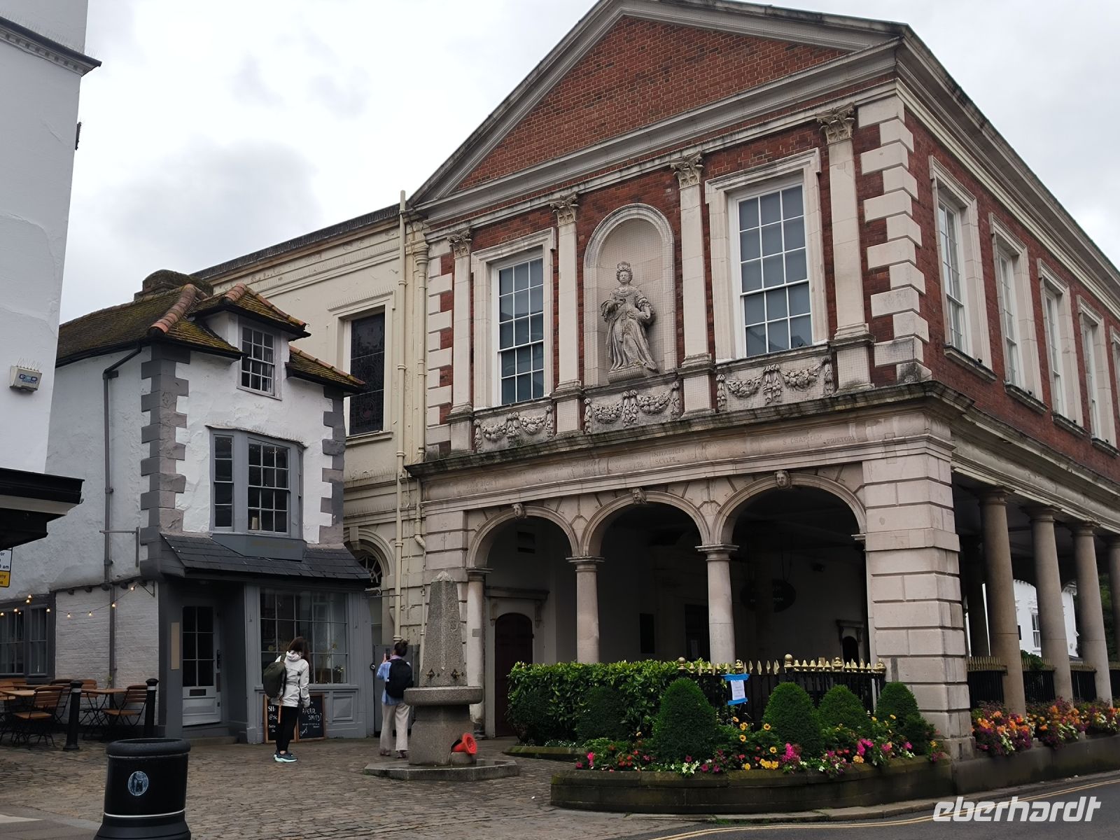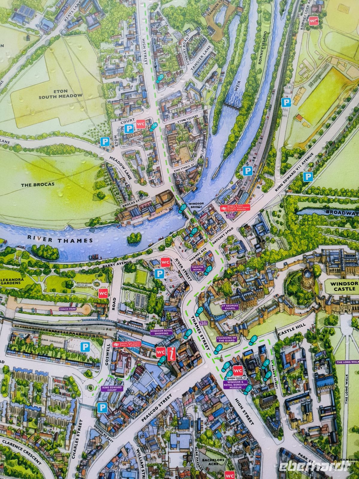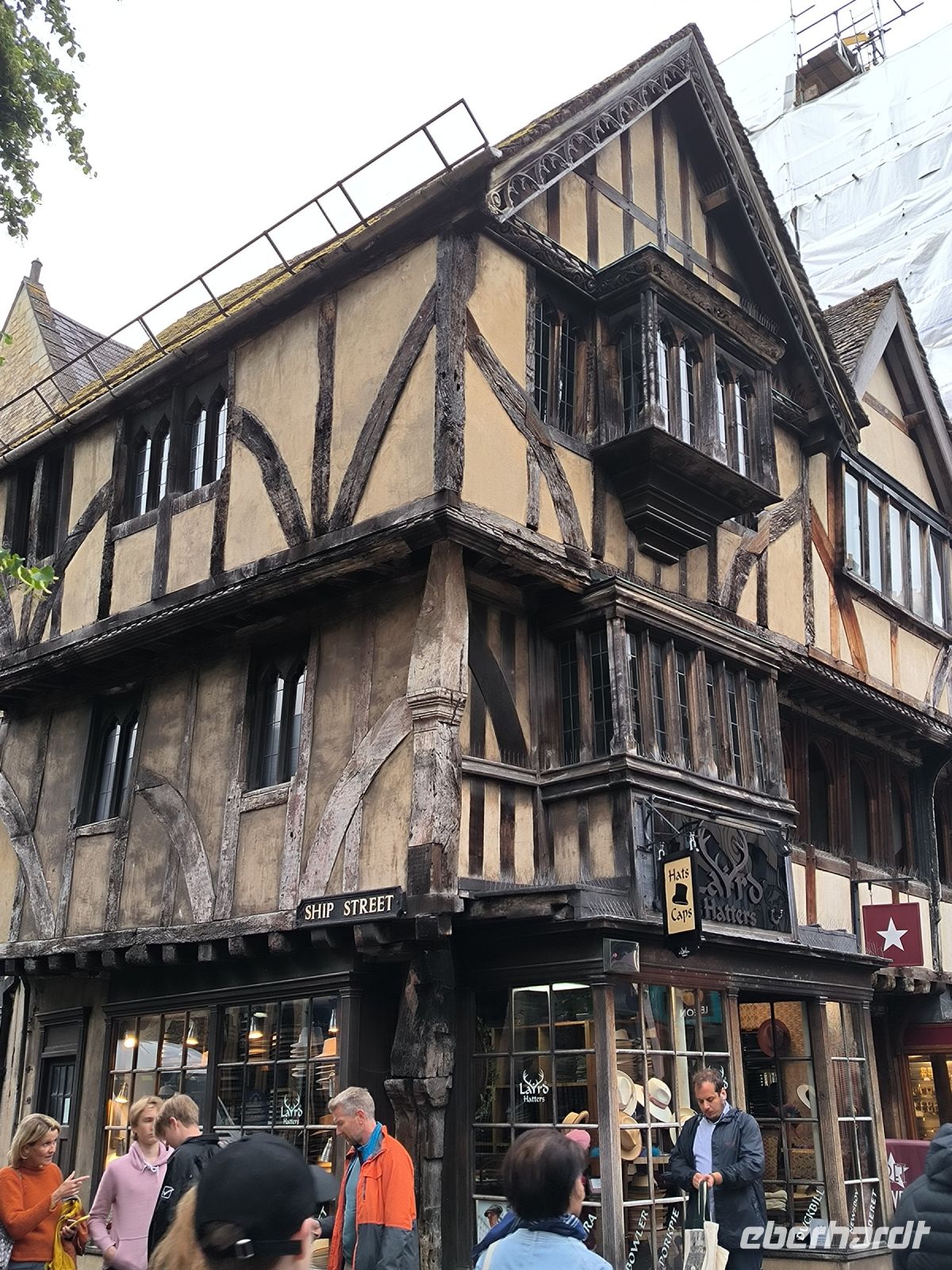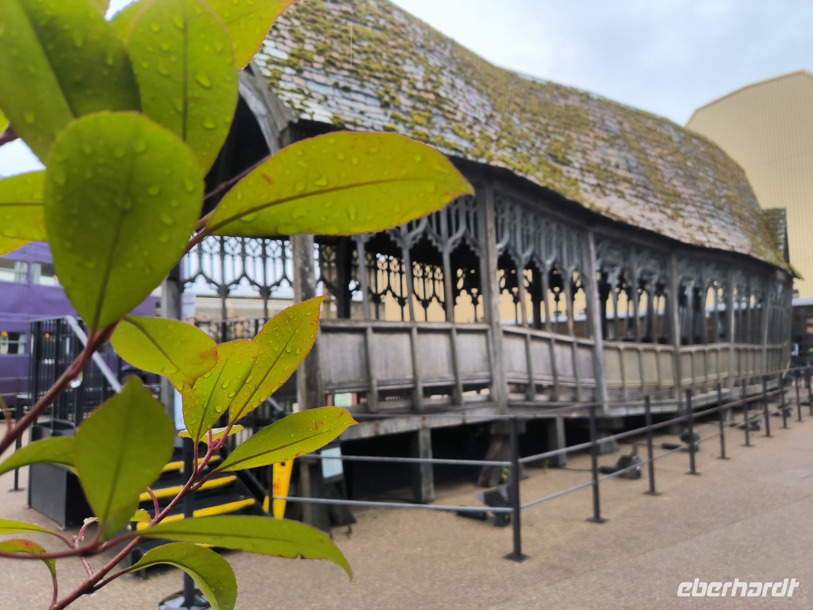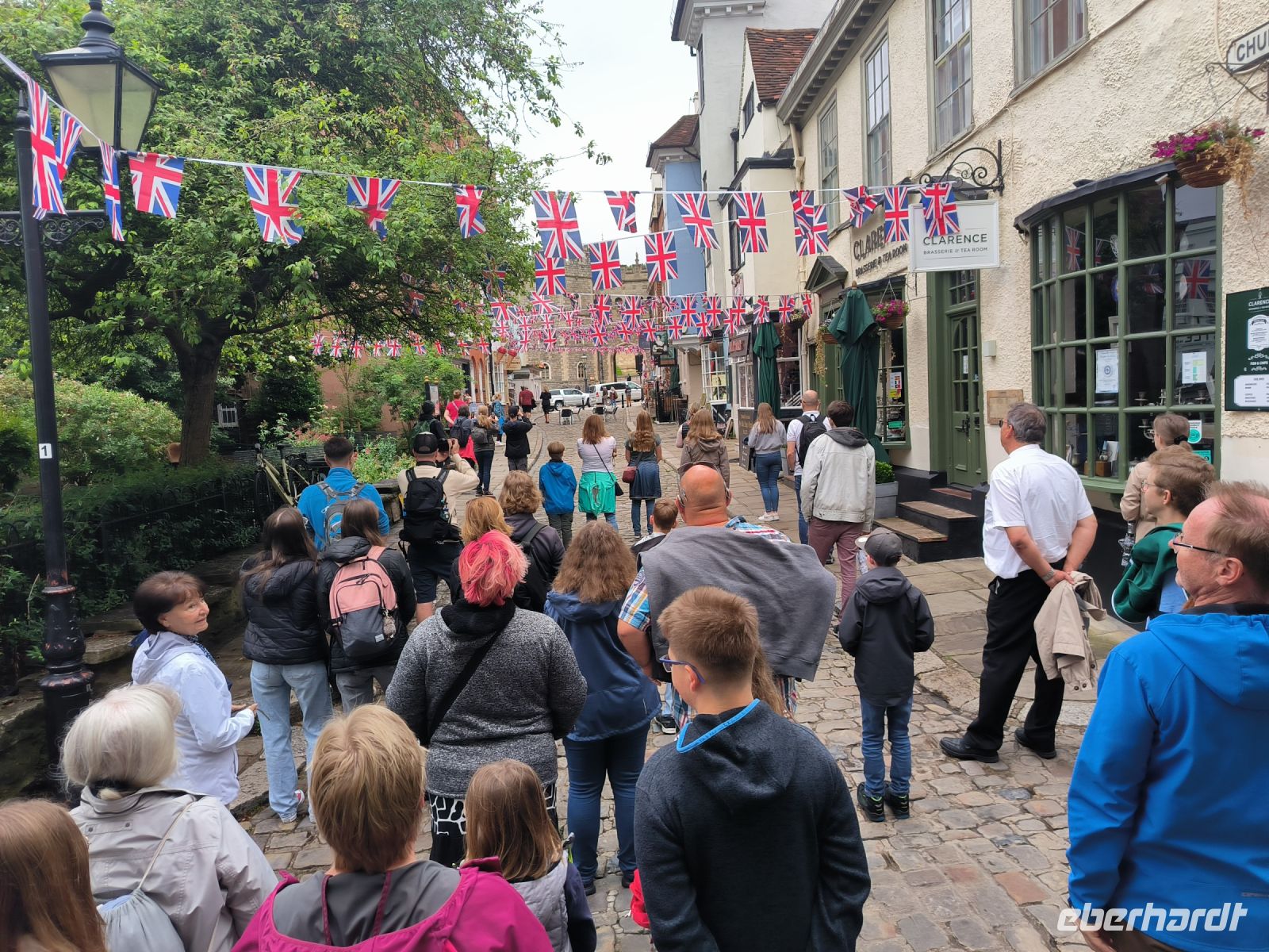 Bis zum geplanten Eintritt in die Filmstudios nutzen wir die Zeit und begeben uns zunächst auf den Weg nach Windsor, wo wir gemeinsam einen kurzen Spaziergang durch den Ort machen. Dort befindet sich Windsor Castle, das größte durchgängig bewohnte Schloss der Welt und eine der offiziellen Hauptresidenzen des britischen Monarchen King Charles, der heute sogar anwesend ist. Die Flagge ist gehisst und gerade treffen elegant gekleidete Gäste zu einem offiziellen Anlass auf Schloss Windsor ein. Außerdem hat Windsor neben einer hübschen Fußgängerzone und einem viktorianischen Bahnhofsgebäude noch ein paar kleine Sehenswürdigkeiten: Neben der Guildhall (Ehem. Zunfthalle, heute Museum) mit den „Fake Säulen“ und dem Crooked House (Schiefes Haus) sehen wir die Queen Charlotte Street. Mit knapp 16 Metern Länge ist sie die kürzeste Straße in England.