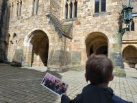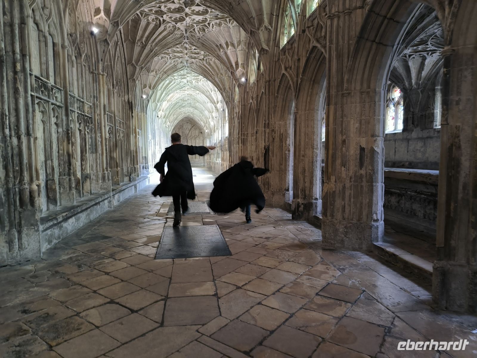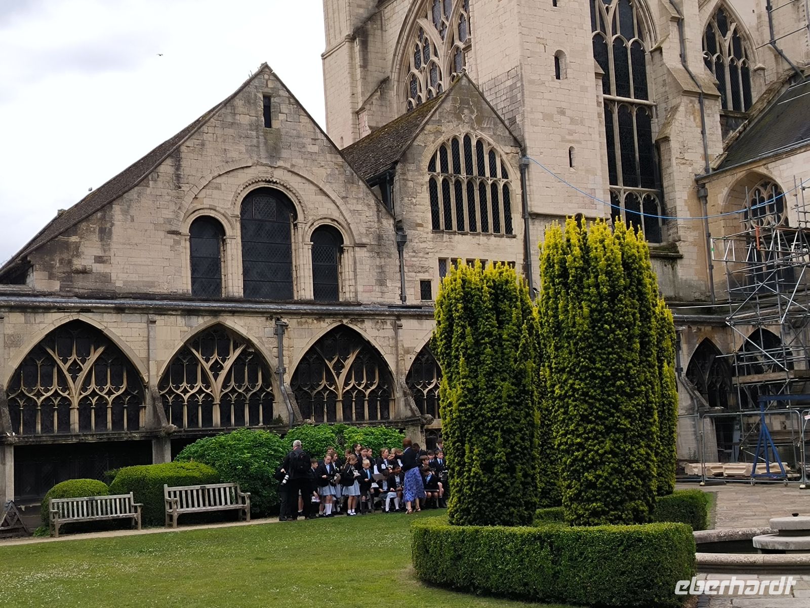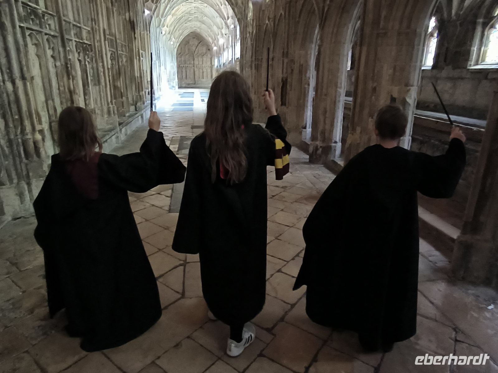 Die Kathedrale selbst ist heute wegen einer Schulveranstaltung geschlossen. Aber wir wollen ja sowieso vor allem in den Kreuzgang des Klosters, den wir durch das nette Café „Monks Kitchen“ betreten dürfen. Dort widmen wir uns den Drehorten, denn das Porträt der fetten Dame, Harrys Versteck, die Szenen mit Malfoy & Snape u.a. sind dort entstanden. Und dann werden unsere Kids selbst zu Filmstars. Mit Umhang und Zauberstab schweben sie durch den Kreuzgang und freuen sich über gelungene Videos für Freunde und Familie zu Hause.