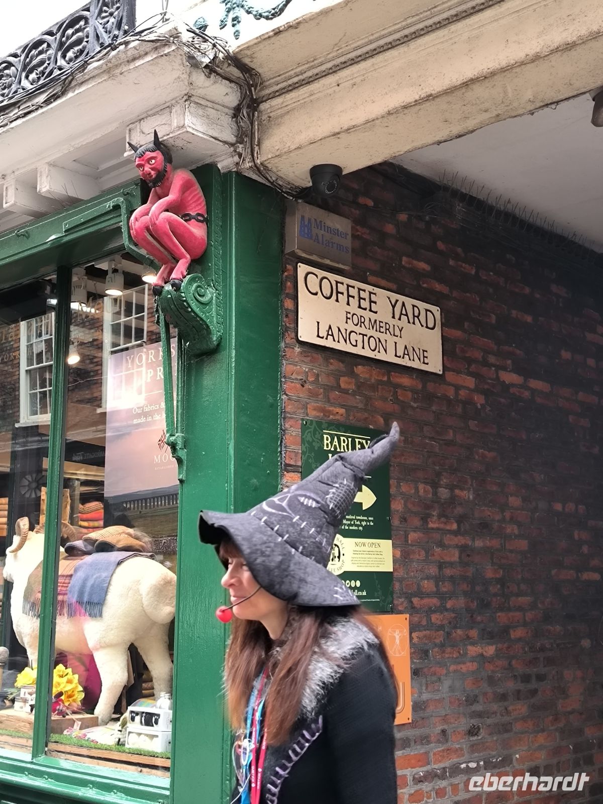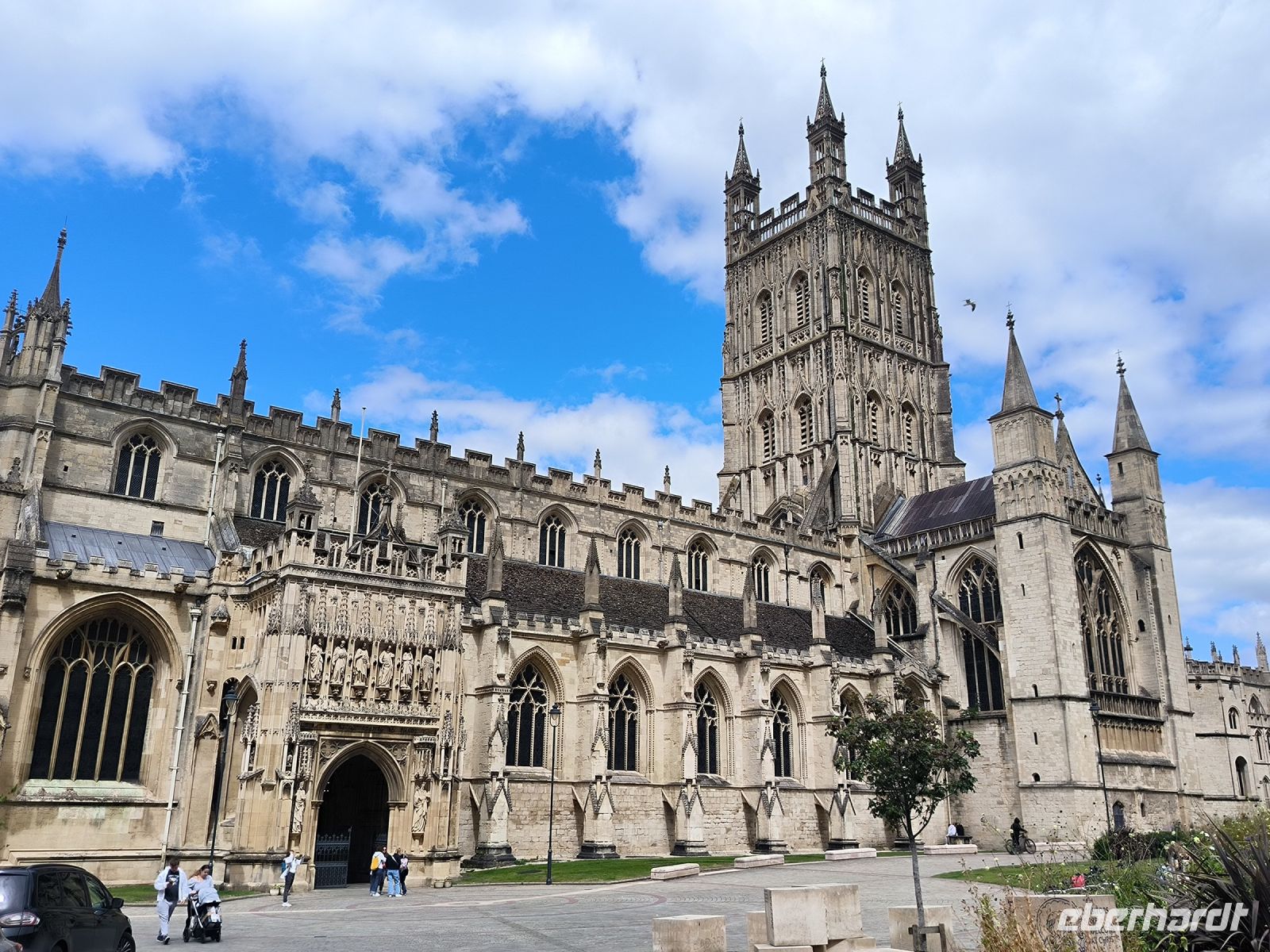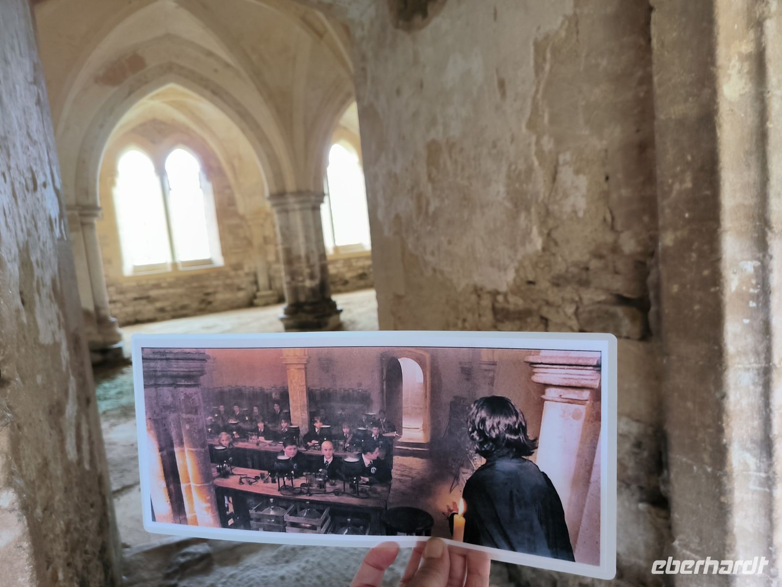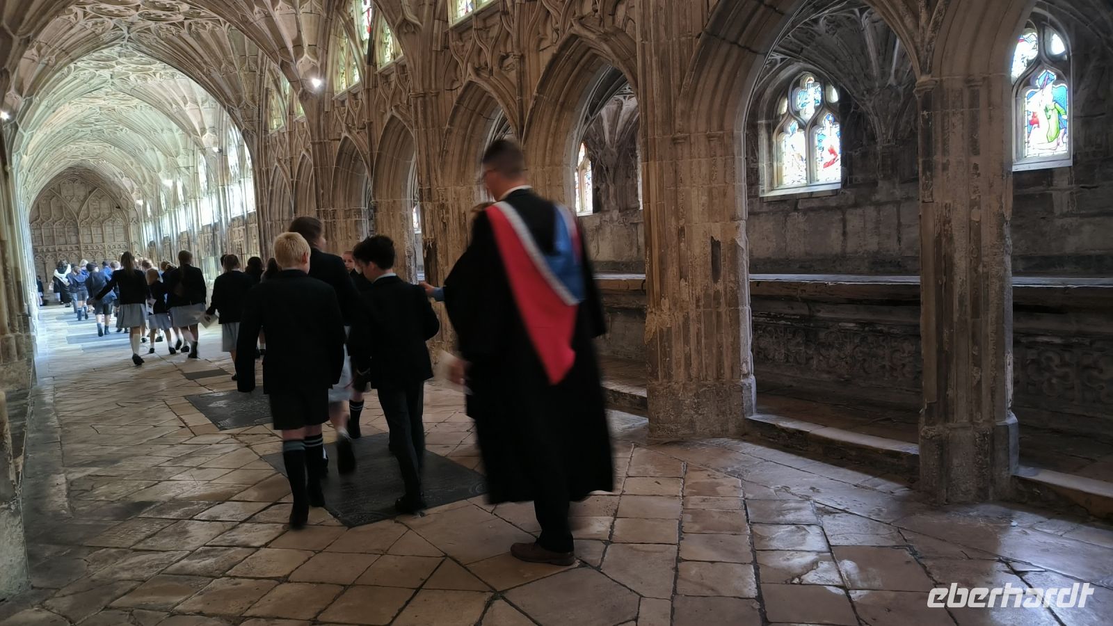 Die Kathedrale selbst ist heute wegen einer Schulveranstaltung geschlossen. Aber wir wollen ja sowieso vor allem in den Kreuzgang des Klosters, den wir durch das nette Café „Monks Kitchen“ betreten dürfen. Dort widmen wir uns den Drehorten, denn das Porträt der fetten Dame, Harrys Versteck, die Szenen mit Malfoy & Snape u.a. sind dort entstanden. Und dann werden unsere Kids selbst zu Filmstars. Mit Umhang und Zauberstab schweben sie durch den Kreuzgang und freuen sich über gelungene Videos für Freunde und Familie zu Hause.