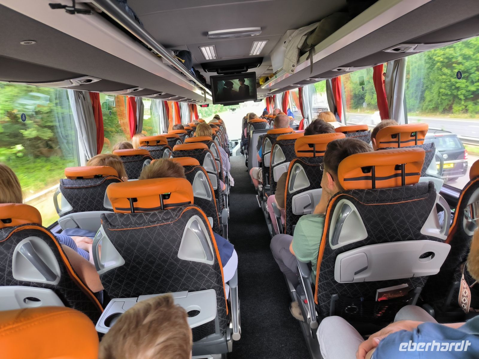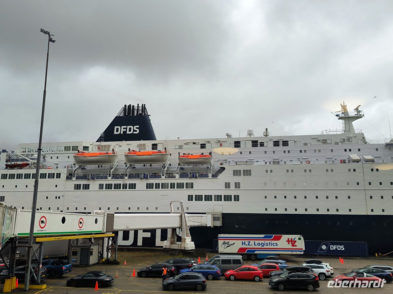 Im Fahrzeugdeck besteigen wir wieder unseren Bus und fahren durch die Pass- und Zollkontrolle. Beim Verlassen des Hafens stutzen wir, weil unser Busfahrer plötzlich „auf der falschen Straßenseite“ fährt. Aber ja, wir sind ja in England. Maik fährt eine Extrarunde – links um den Kreisverkehr.
