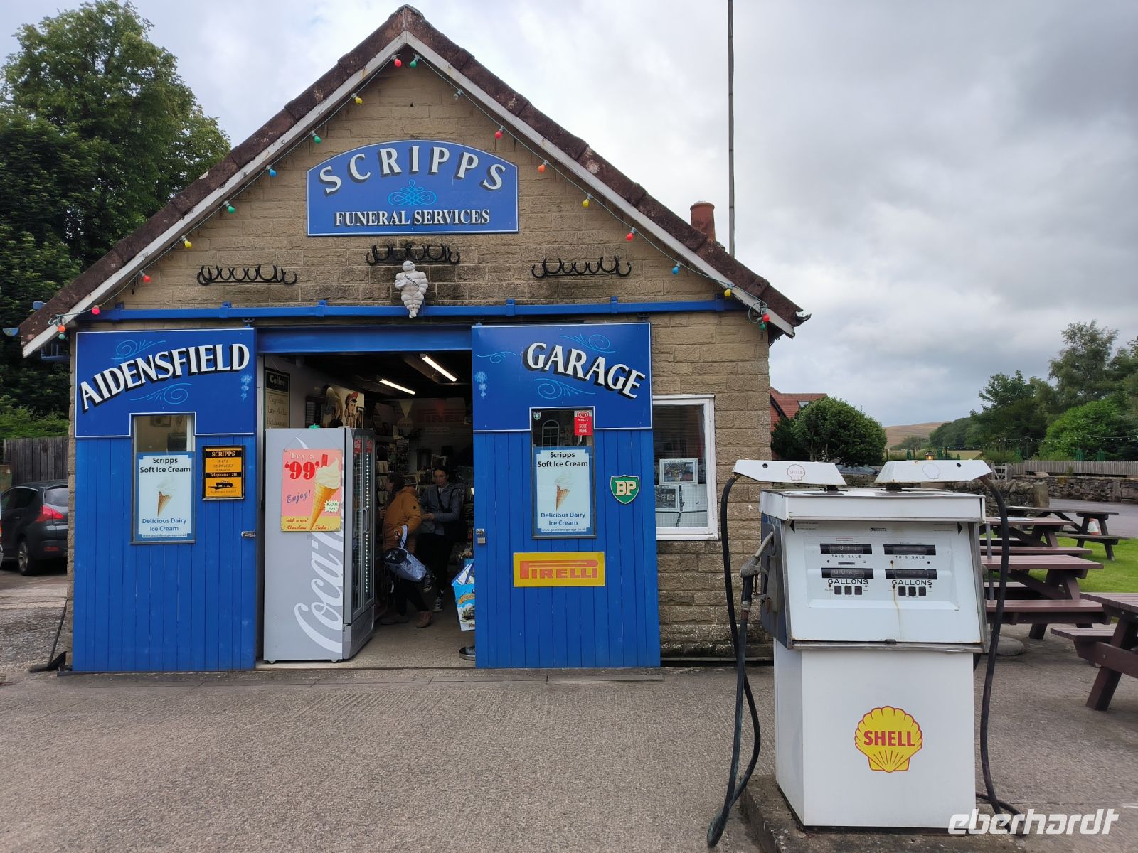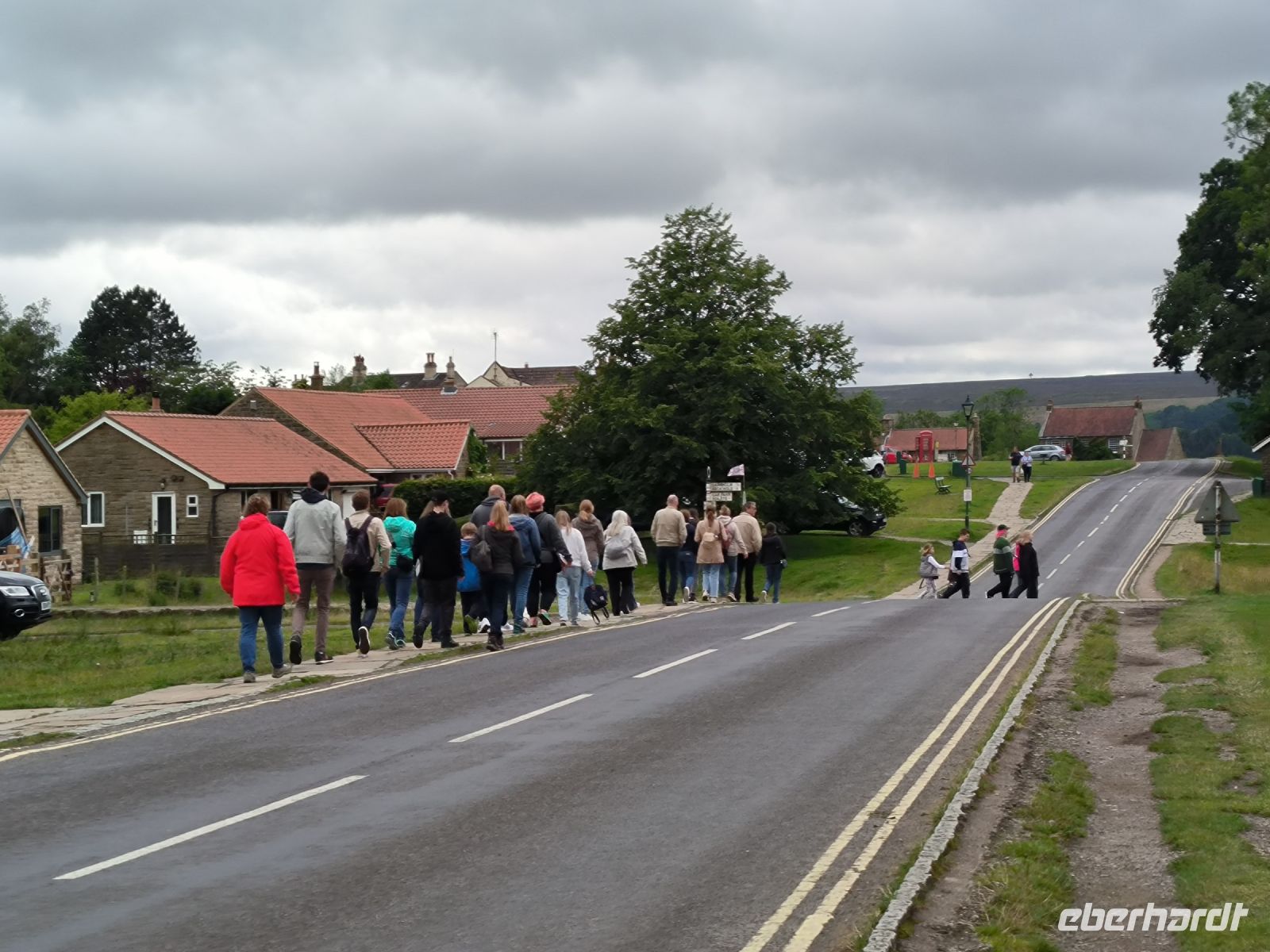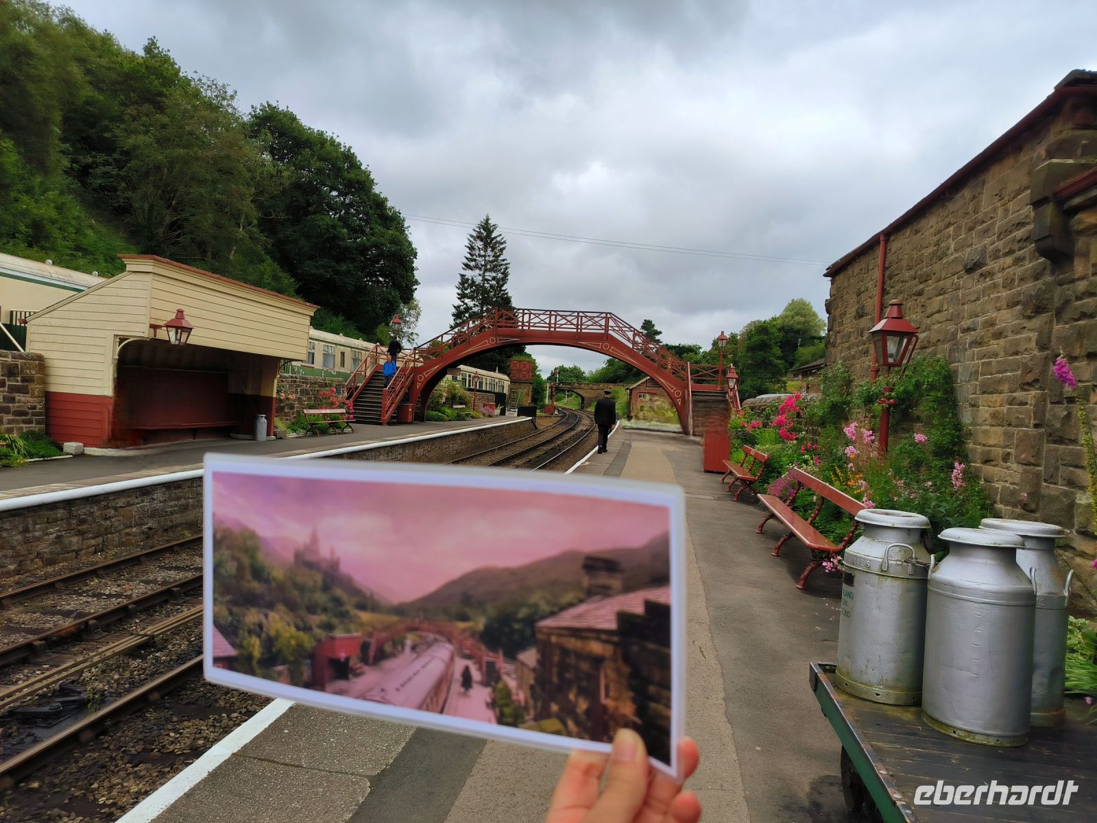 Viel zu schnell ist die Fahrt vorbei und wir kommen in Hogsmeade an, ach nein, das heißt bei den Muggeln ja Goathland. Hinter der roten Brücke versteckt sich Hogwarts im „Nebel“, aber das Fotomotiv wird vielfältig eingefangen. Unser Busfahrer Maik erwartet seine Gruppe auch schon sehnsüchtig und nach einem kurzen Spaziergang durch den Ort geht es weiter. Die Landschaft hat sich verändert, wir fahren über die fast baumlose und mit herrlich blühendem Heidekraut bewachsene Hochebene der North York Moors, die sich ca. 400m über dem Meer erhebt.