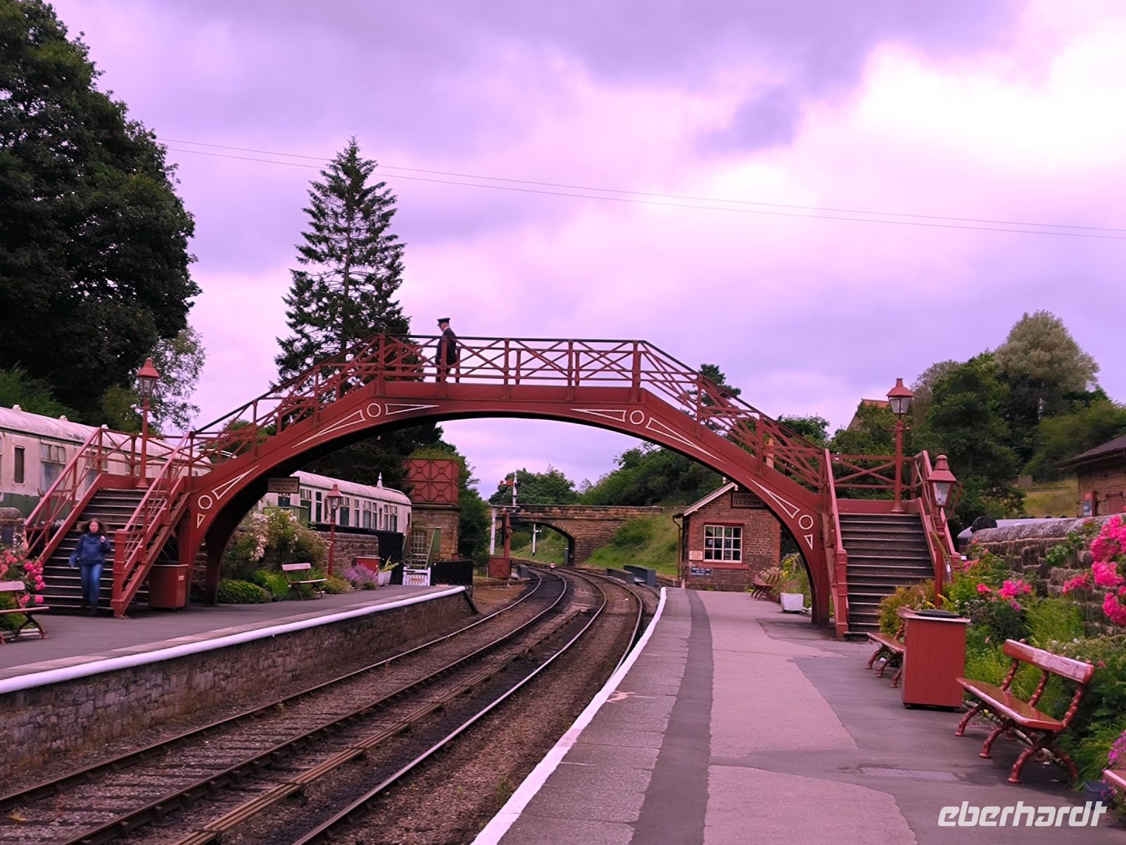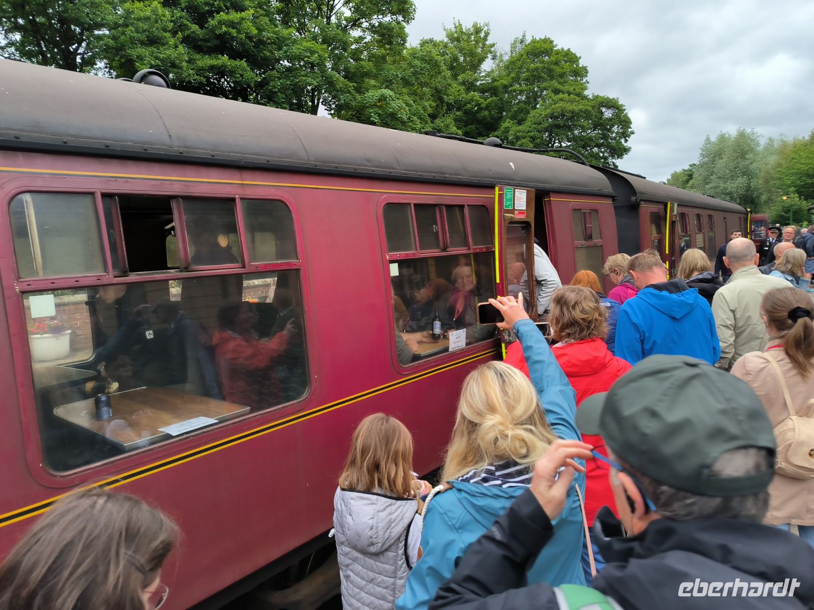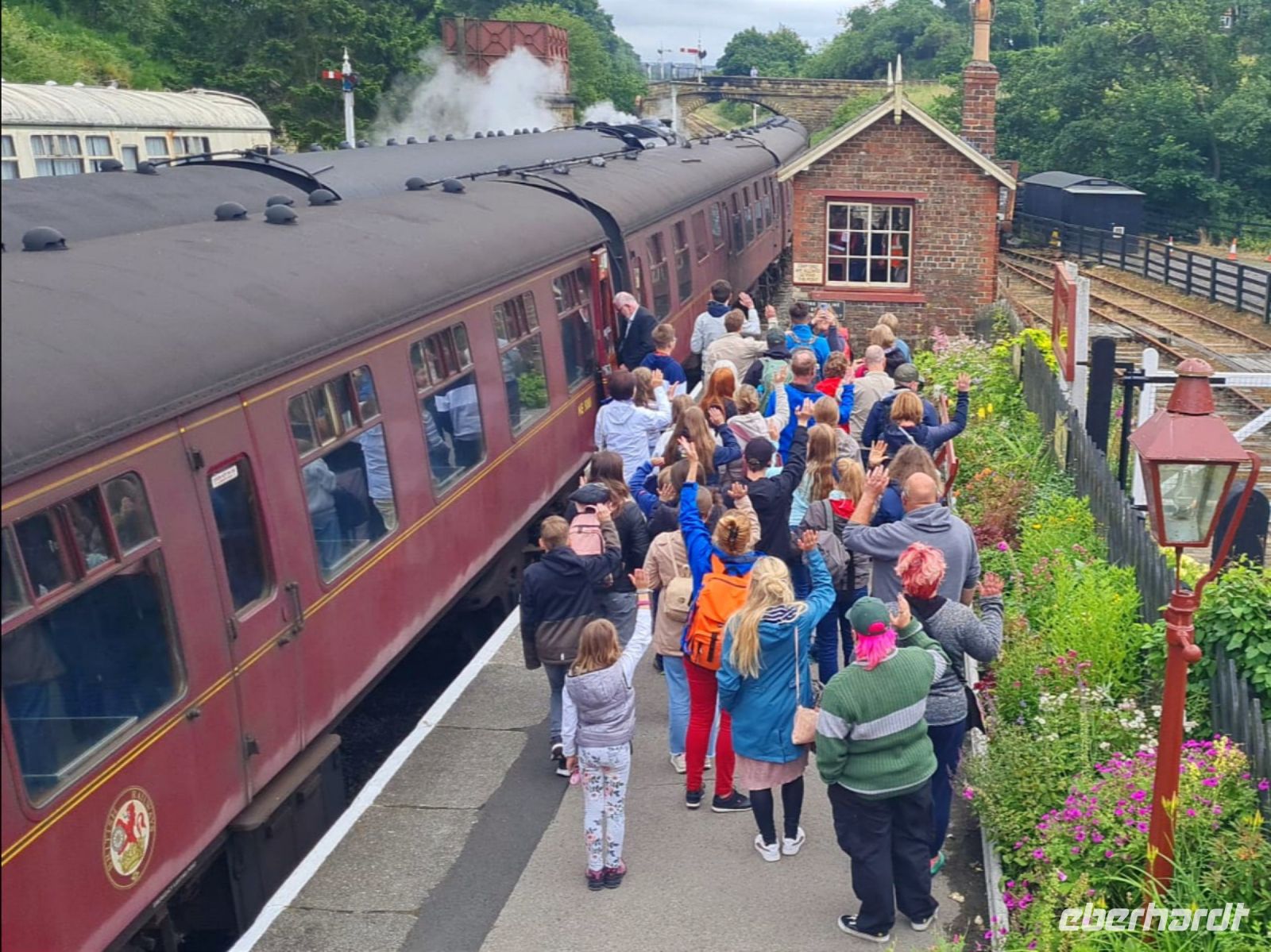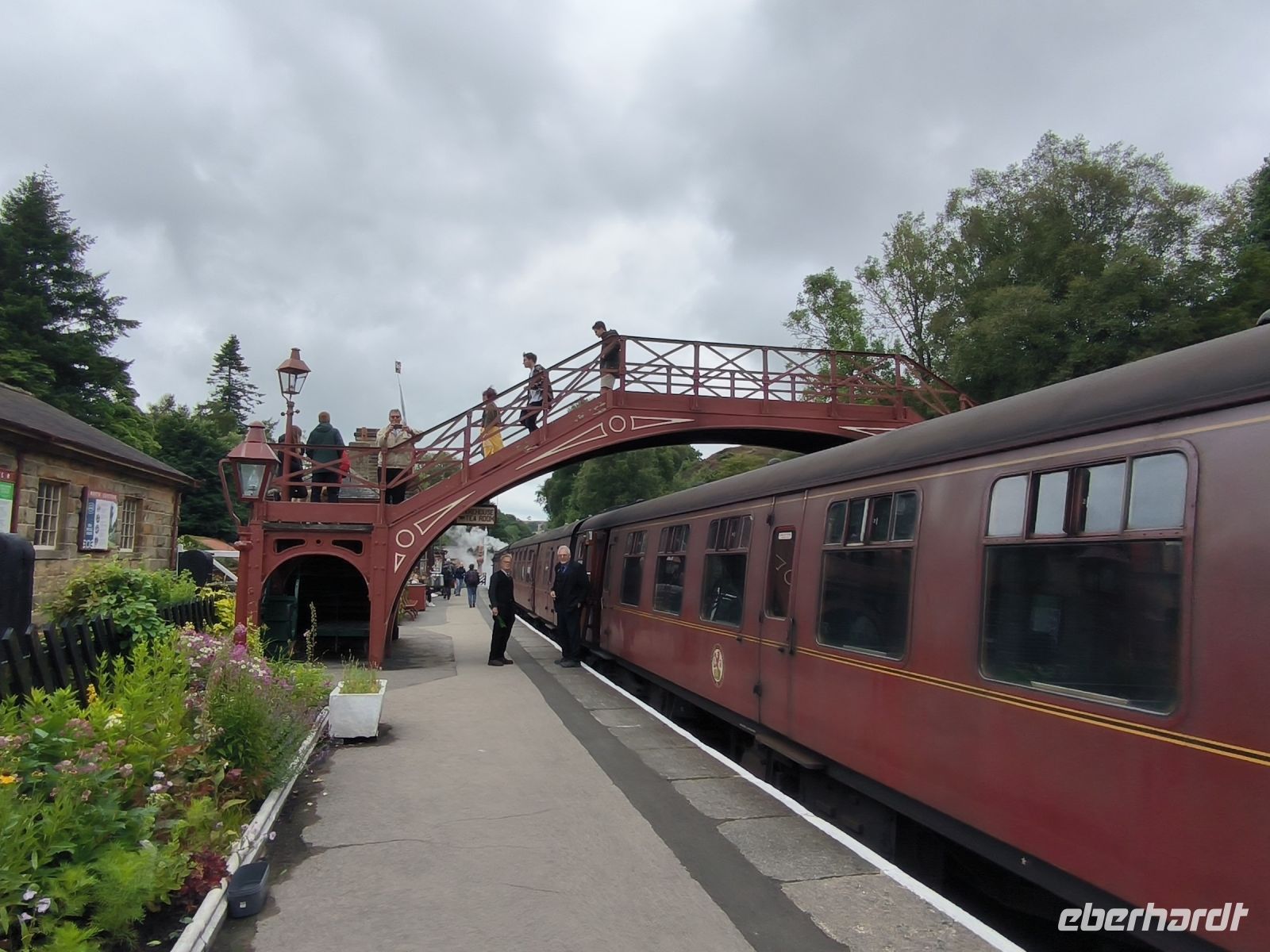 Ein weiteres Highlight erwartet uns. In Pickering ist wieder einmal die Zeit stehen geblieben. Die Station der North Yorkshire Moors Railway ist mit ihren historischen Accessoires die perfekte Kulisse für Film und Fernsehen. Der Stationsvorsteher begrüßt uns herzlich. Ca. 300 ehrenamtlich Engagierte kümmern sich hier um den Erhalt dieser Bahnlinie. Bald schon hören, sehen und riechen wir die Dampflok. Der Zug fährt ein. Fast ein ganzer Waggon ist für unsere Gruppe reserviert.