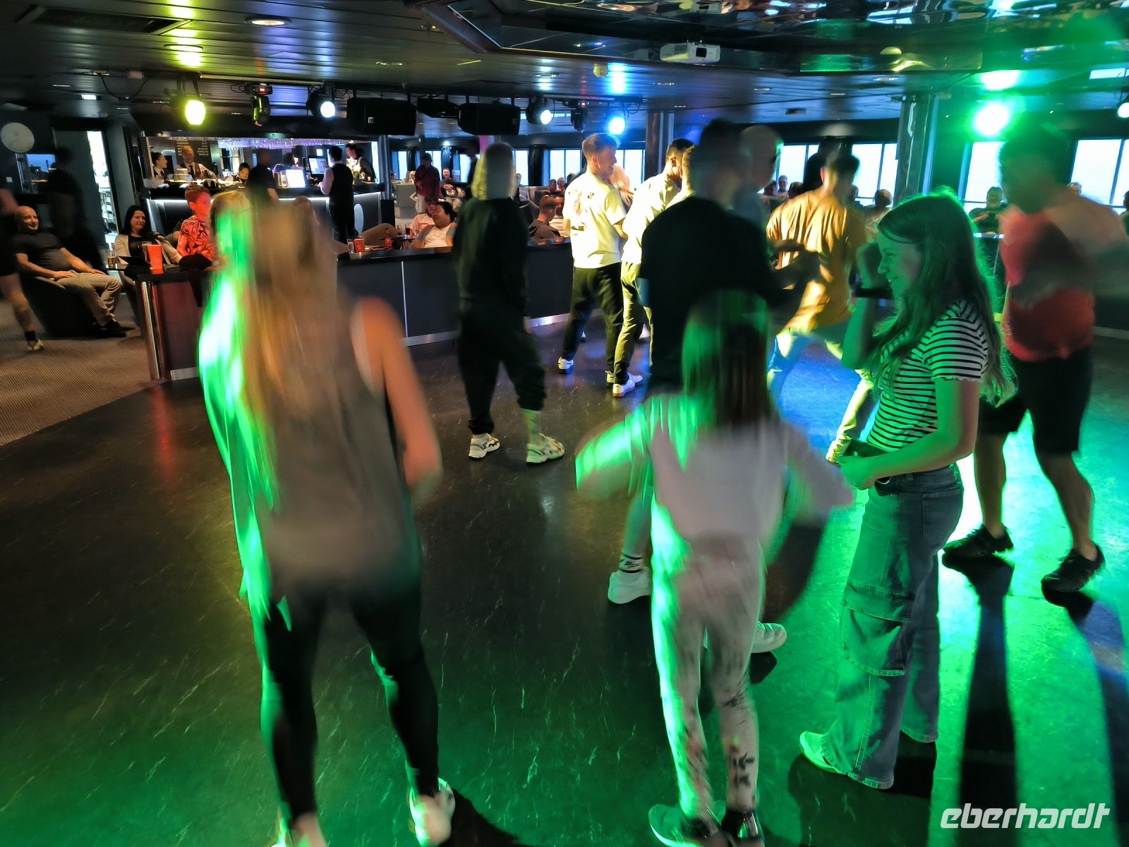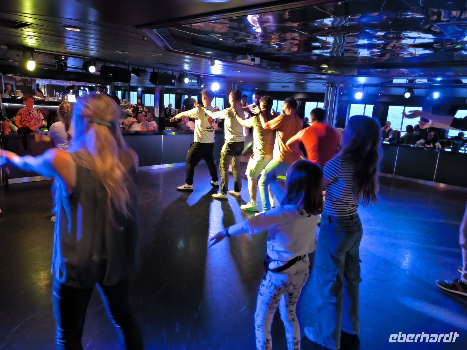 Es gibt ein vielfältiges und sehr leckeres Buffet zum Abendessen, für wirklich jeden Geschmack ist etwas dabei. Leider kann man nicht alles probieren, irgendwann ist der Bauch einfach voll. Aber das kann man sich ja später in der Disco wieder abstrampeln. Es gibt Live-Musik, Bingo-Quiz und verschiedene Unterhaltungs-möglichkeiten. Eine Gruppe junger Briten macht uns vor, wie man tanzt. Irgendwann gibt es kein Halten mehr und einige von uns tanzen durch den Abend, bevor alle in ihre nun noch mehr schwankenden Kojen fallen.