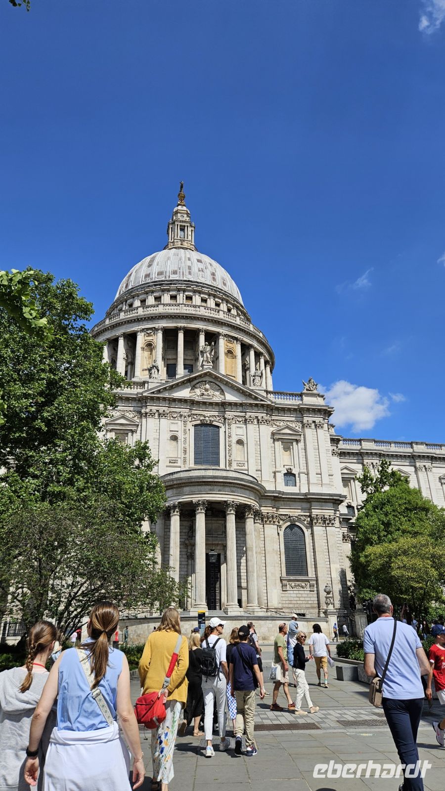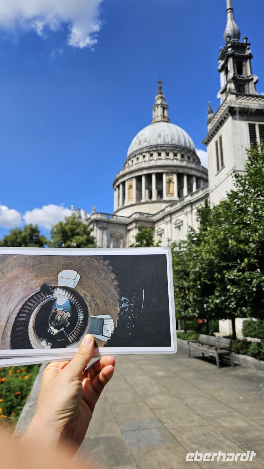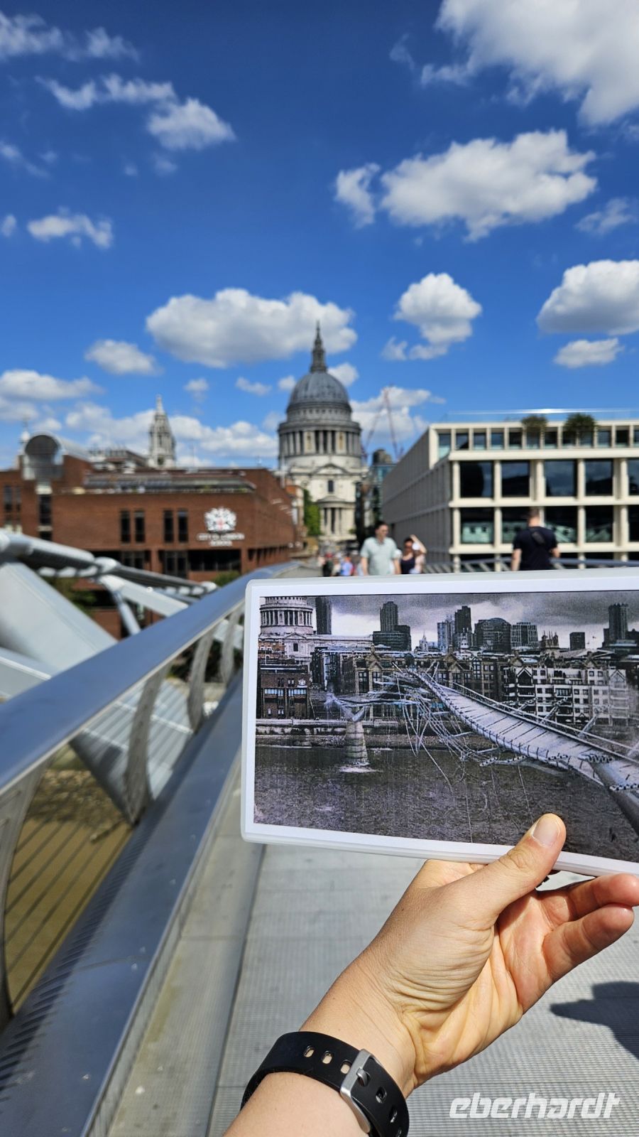 In King´s Cross führte uns Ulla an dem schicken Gebäude von St. Pancras Station vorbei, an dem Harry und Ron im zweiten Teil mit dem fliegenden Auto vorbei geflogen sind. Natürlich ging es für uns danach zum Gleis 9 3/4 und Ulla zeigte uns, wo die Dreharbeiten dafür stattfanden. Danach ging es direkt weiter mit unserem „Fahrenden Ritter“. Leider war auch heute wieder ein Fahrradrennen in London, aber Ulla manövrierte uns gut drum herum und gab uns einige Informationen über London mit auf den Weg. Der nächste Stopp, war ein herrlicher Blick auf die Themse, den Tower, die Tower Bridge und das Bankenviertel. Aber wir sind ja hier wegen Harry Potter- also auf zum nächsten Drehort! Dieser befindet sich in Leadenhall Market. Hier findet heute ein kleiner Flohmarkt statt, durch den wir kurz durchgehen und zur Tür gehen, die als Eingang zum „Tropfenden Kessel“ diente und die gleiche Straße langlaufen, die Harry und Hagrid auf ihrem Weg zur Winkelgasse gingen. Danach geht es direkt weiter mit unserem Bus in Richtung St. Pauls Cathedral. Dort finden wir einen schönen Parkplatz und schlendern erstmal zur Millenium Bridge, die in „Harry Potter und der Halbblutprinz“ von Todessern zerstört wurde. Auf dem Weg dorthin liegt auch die alte Schule von Daniel Radcliffe. Heute wird die Brücke zum Glück nicht attackiert und wir können schöne Bilder machen und den Ausblick genießen. Dann führt uns Ulla vorbei an der beeindruckenden St. Pauls Cathedral, die auch kurz als Drehort diente.