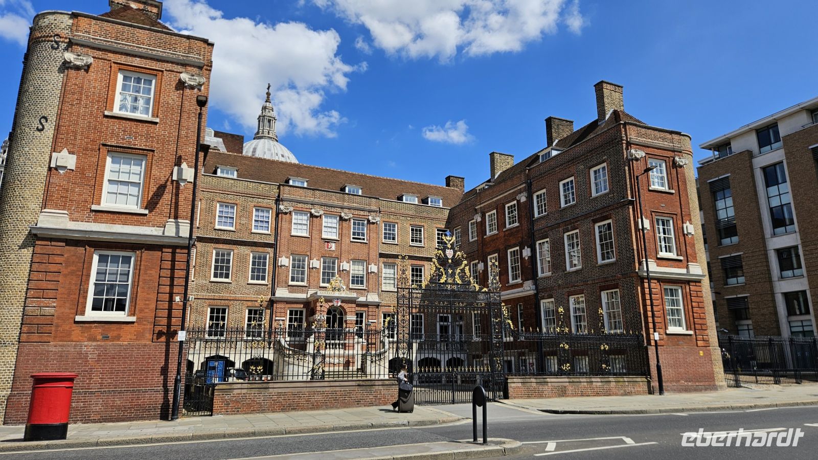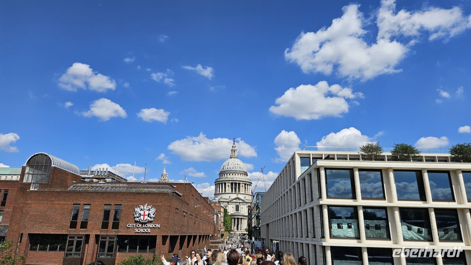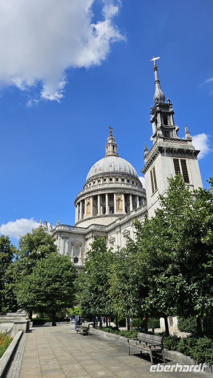 In King´s Cross führte uns Ulla an dem schicken Gebäude von St. Pancras Station vorbei, an dem Harry und Ron im zweiten Teil mit dem fliegenden Auto vorbei geflogen sind. Natürlich ging es für uns danach zum Gleis 9 3/4 und Ulla zeigte uns, wo die Dreharbeiten dafür stattfanden. Danach ging es direkt weiter mit unserem „Fahrenden Ritter“. Leider war auch heute wieder ein Fahrradrennen in London, aber Ulla manövrierte uns gut drum herum und gab uns einige Informationen über London mit auf den Weg. Der nächste Stopp, war ein herrlicher Blick auf die Themse, den Tower, die Tower Bridge und das Bankenviertel. Aber wir sind ja hier wegen Harry Potter- also auf zum nächsten Drehort! Dieser befindet sich in Leadenhall Market. Hier findet heute ein kleiner Flohmarkt statt, durch den wir kurz durchgehen und zur Tür gehen, die als Eingang zum „Tropfenden Kessel“ diente und die gleiche Straße langlaufen, die Harry und Hagrid auf ihrem Weg zur Winkelgasse gingen. Danach geht es direkt weiter mit unserem Bus in Richtung St. Pauls Cathedral. Dort finden wir einen schönen Parkplatz und schlendern erstmal zur Millenium Bridge, die in „Harry Potter und der Halbblutprinz“ von Todessern zerstört wurde. Auf dem Weg dorthin liegt auch die alte Schule von Daniel Radcliffe. Heute wird die Brücke zum Glück nicht attackiert und wir können schöne Bilder machen und den Ausblick genießen. Dann führt uns Ulla vorbei an der beeindruckenden St. Pauls Cathedral, die auch kurz als Drehort diente.