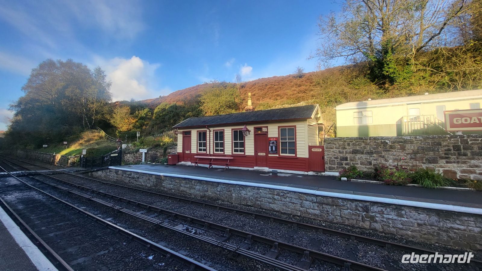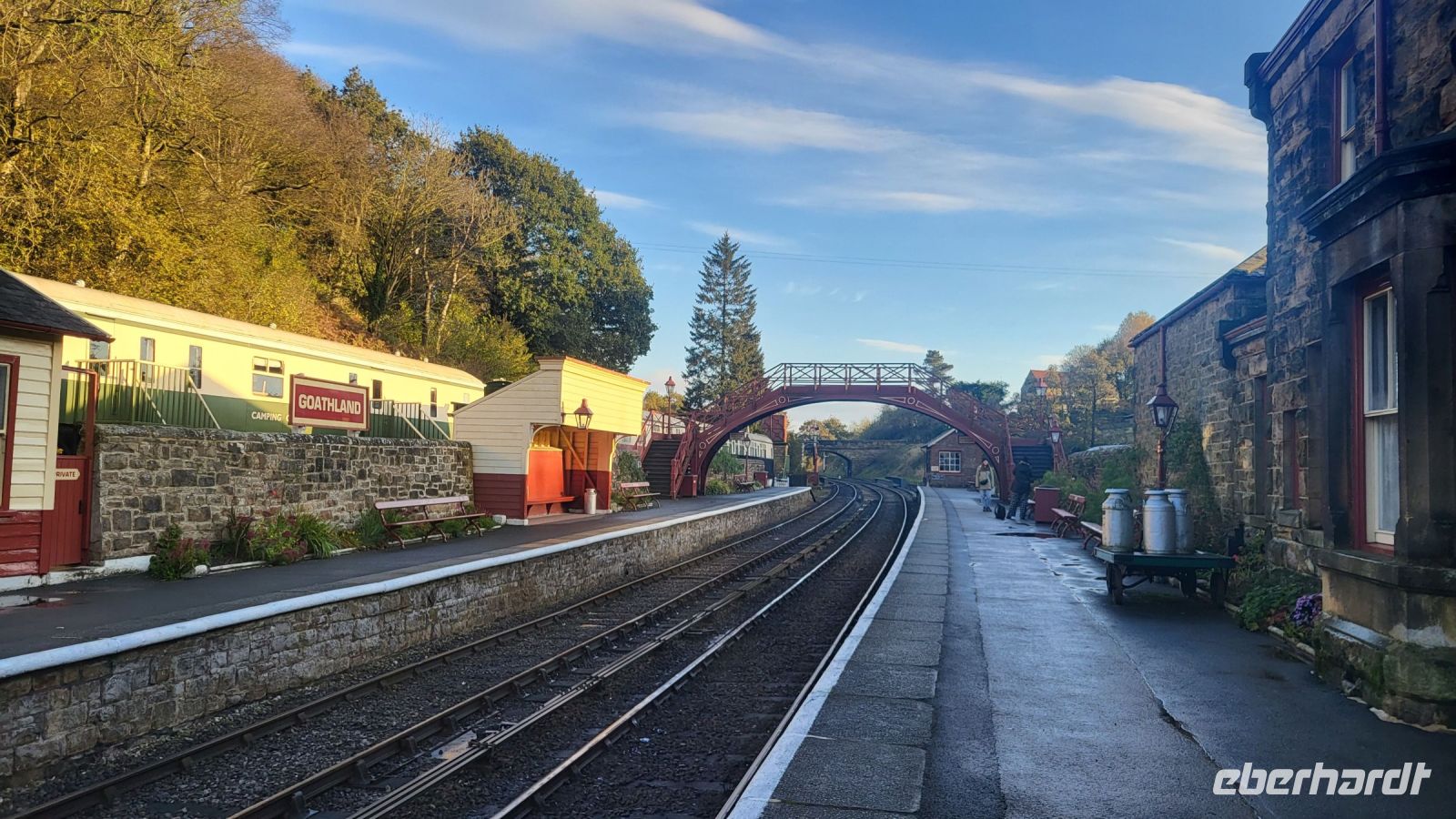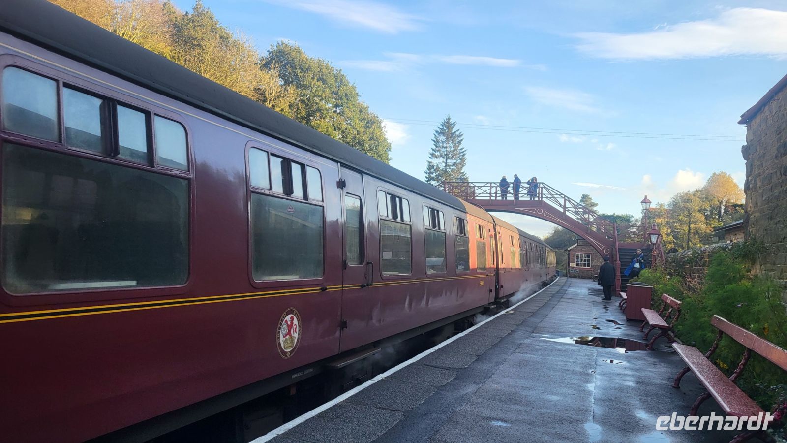 Unser Ziel ist der Bahnhof von Goathland, der vielen von uns sofort bekannt vorkommt: Hier befindet sich der Drehort für den Bahnhof von Hogsmeade, das einzige Dorf Englands, das ausschließlich von Zauberern bewohnt wird. Als wir aus dem Zug steigen, scheint es, als hätte sich seit den Dreharbeiten nichts verändert. Wir können uns gut vorstellen, wie Harry und seine Freunde hier ankamen, um den Hogwarts-Express zu verlassen und sich auf den Weg zur Schule zu machen.