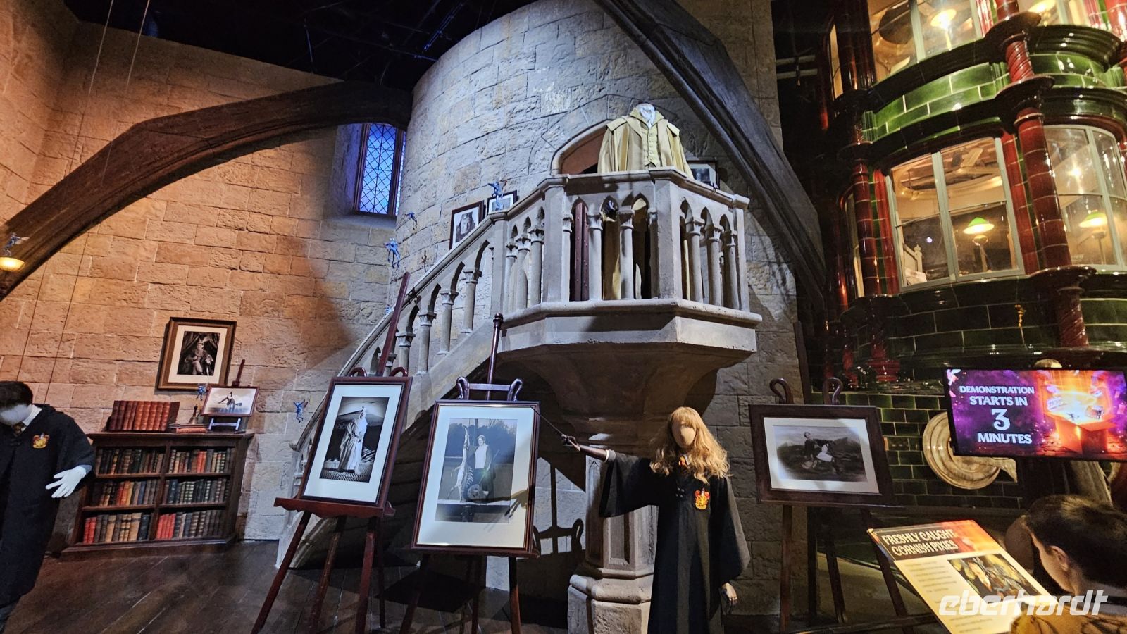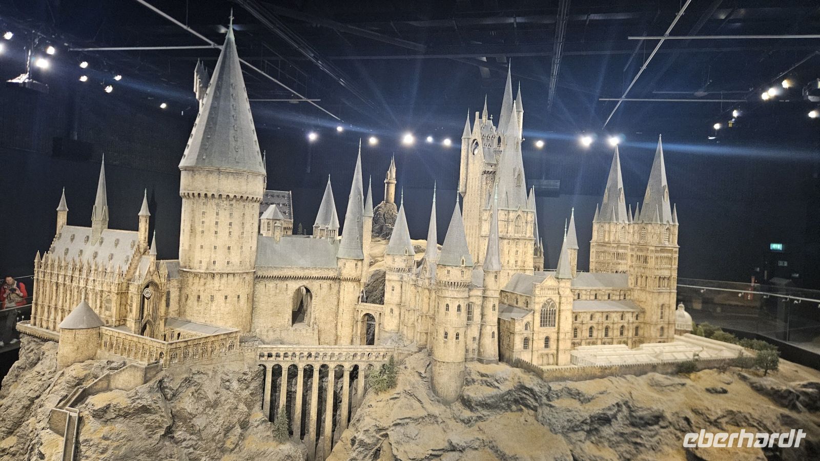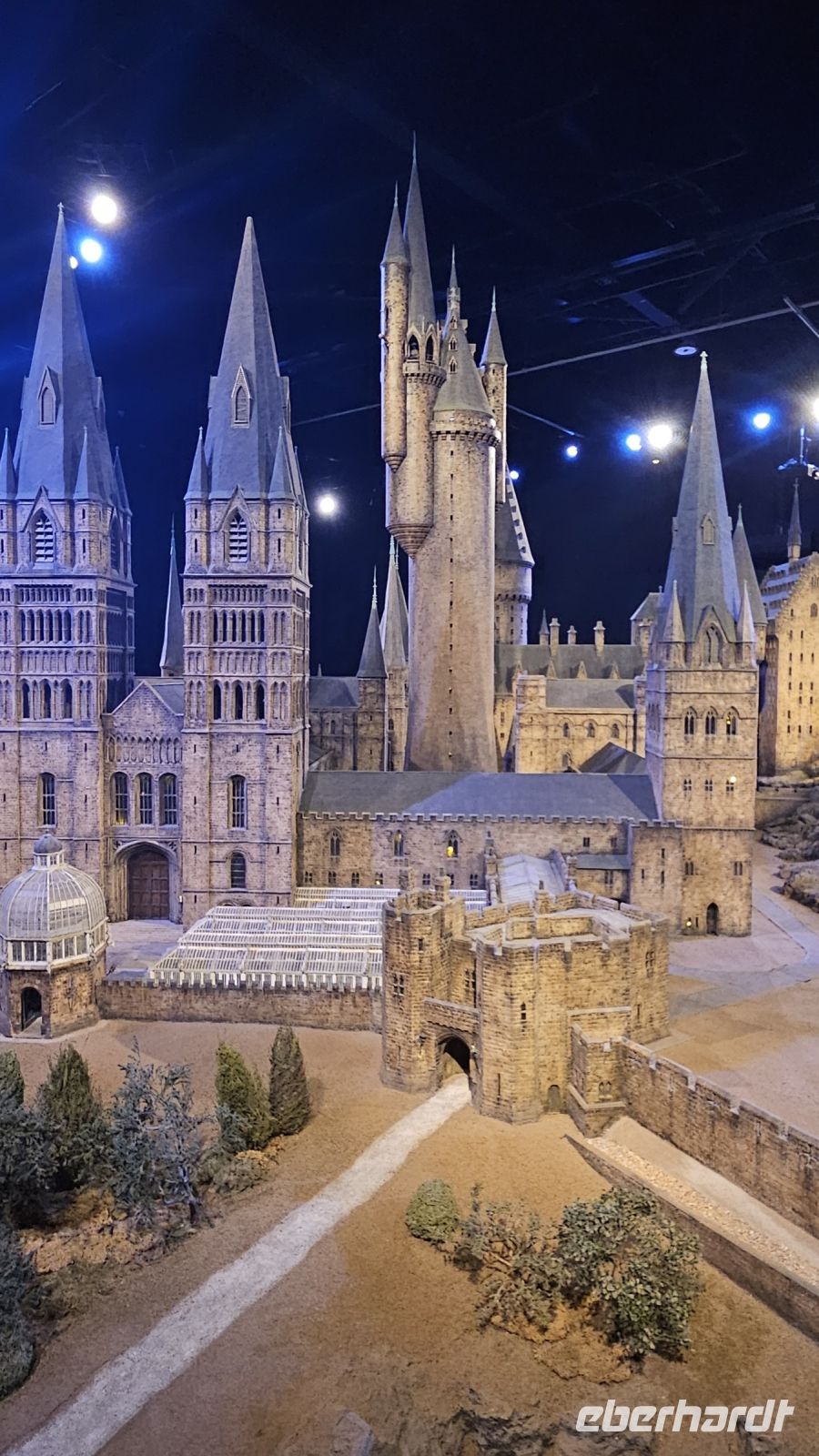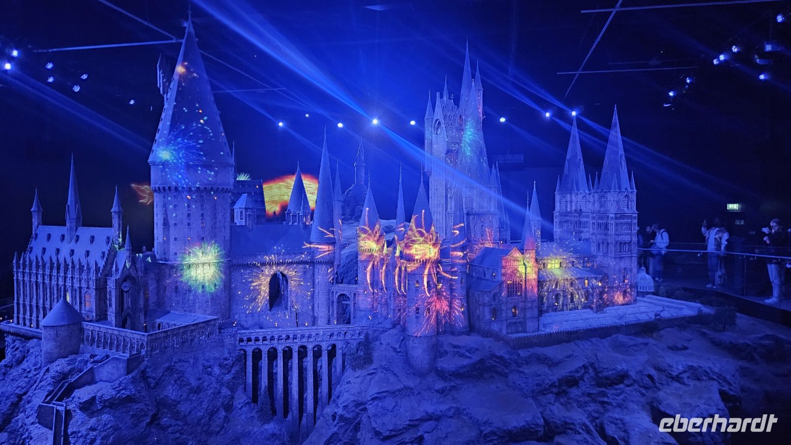 Danach geht es weiter in die zweite Halle, Halle K. Hier lernen wir viel über Maskendesign und allgemein alle Raffinessen hinter unseren geliebten Filmen. Außerdem faszinieren und die Sets von Gingrotts und der Winkelgasse. Schließlich kommen wir am riesigen Hogwarts Modell an und bestaunen es in seiner ganzen Pracht. Diesmal jedoch entzünden Fred und George ein Feuerwerk, was uns ein prächtiges Farbenspiel beschert.