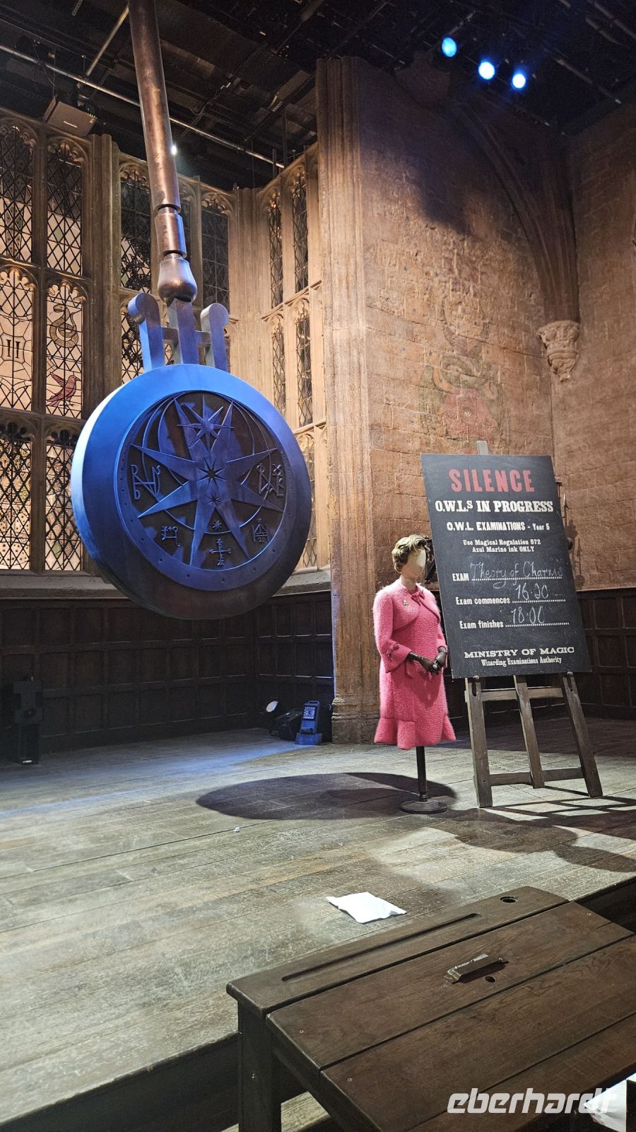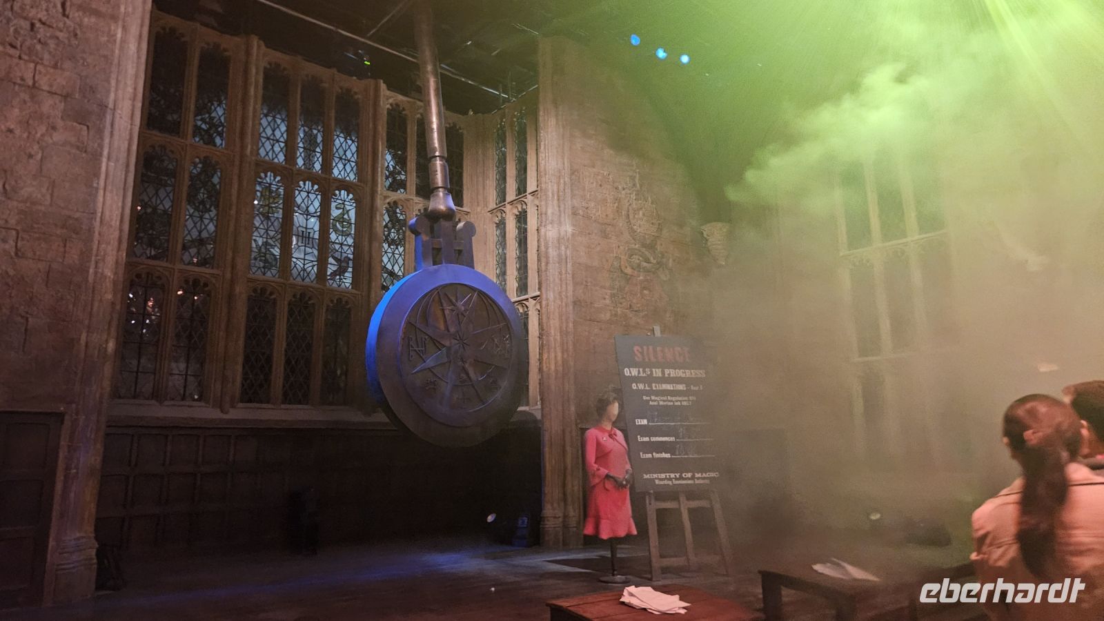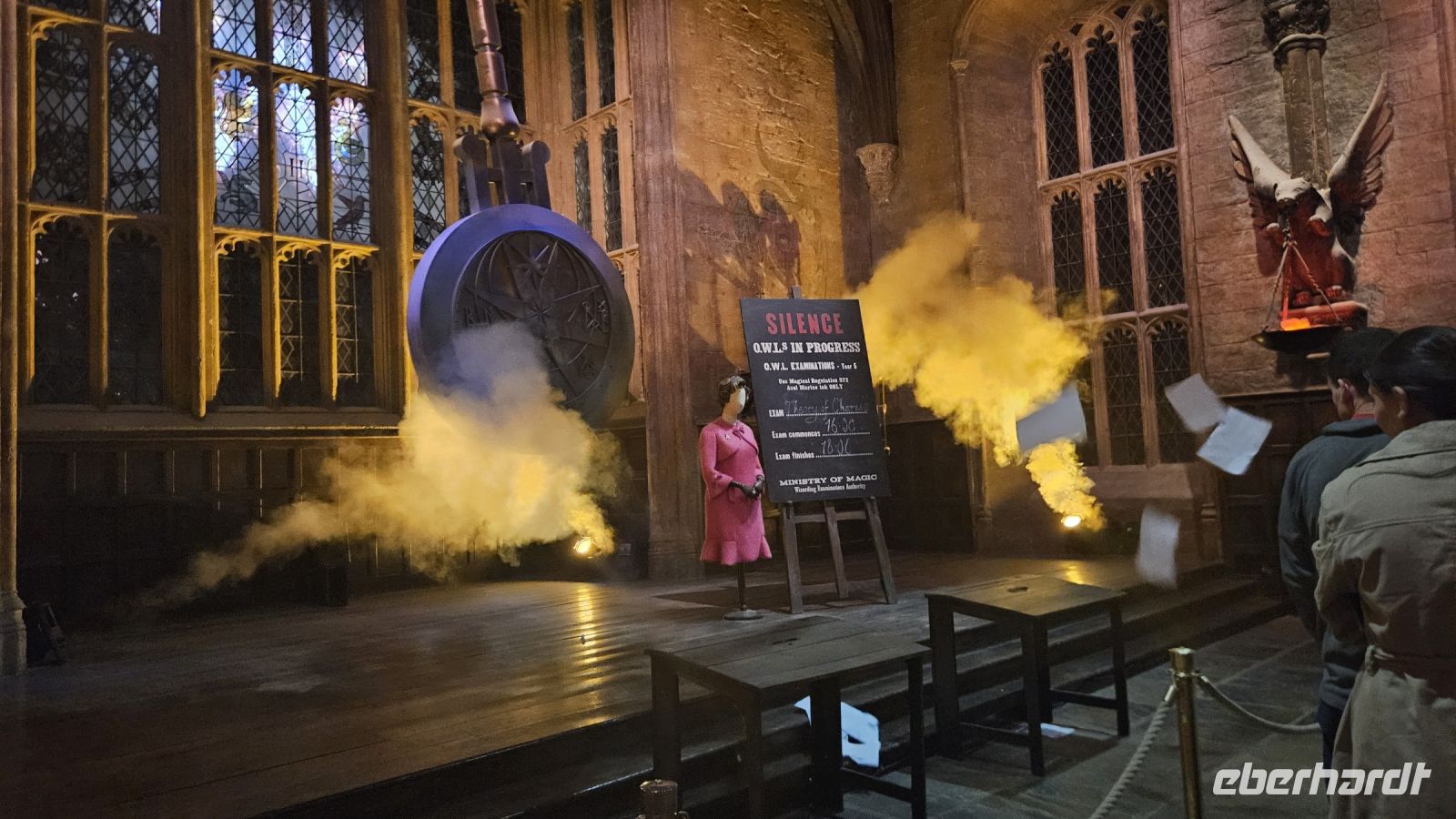 Nach einer kleinen Kinovorstellung werden wir emotional bei unserem Eintritt in die große Halle! Diese ist größer als wir uns vorgestellt haben. Gerade findet die Sonderausstellung "Magical Mischief" statt und wir werden begrüßt von Dolores Umbridge, den Weasley Zwillingen und einem großen Feuerwerk.