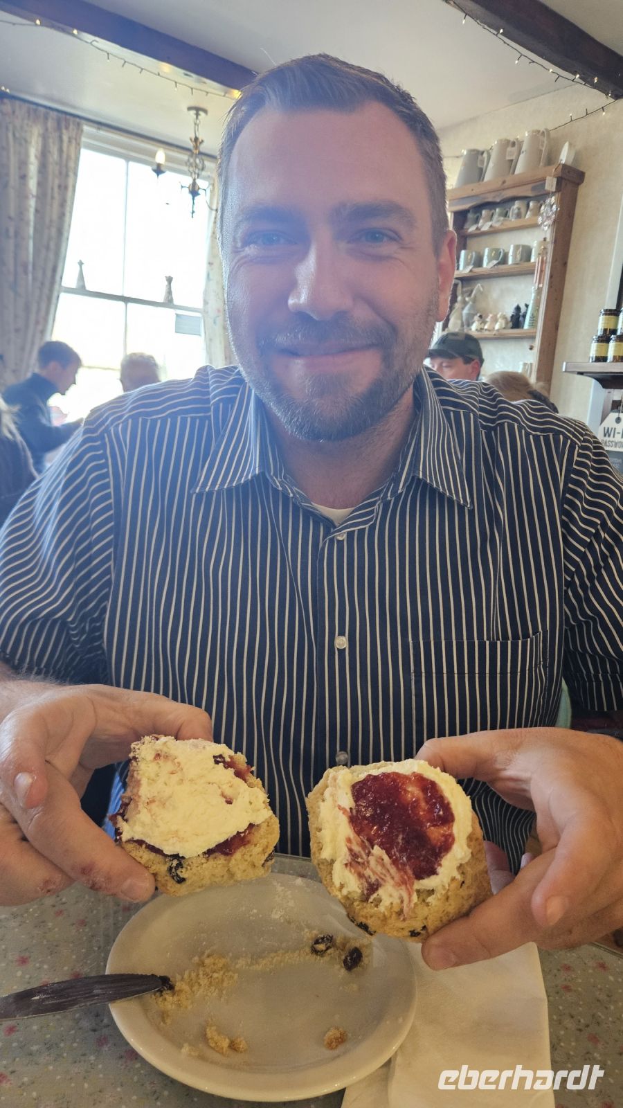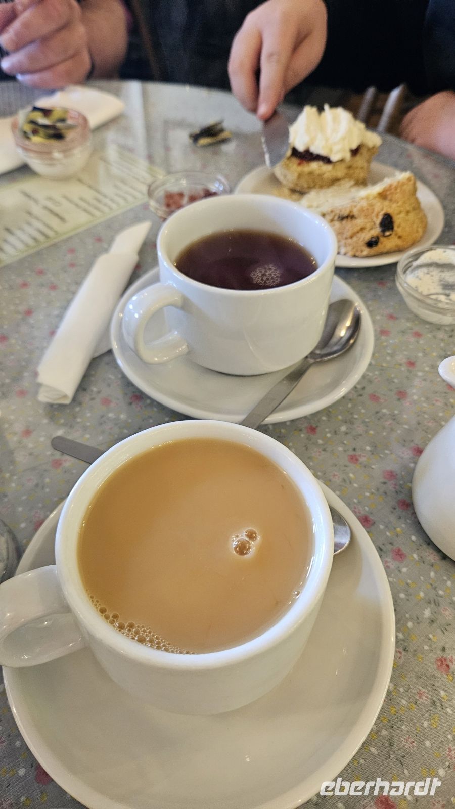 Leider fährt unser Hogwarts Zug heute nicht und so fahren wir mit unserem Ritter durch den beeindruckenden North Yorkshire Moors Nationalpark und sehen ganz viele Schafe auf unserem Weg nach Goathland. In der wunderbaren Landluft gehen wir zuerst zu unserem Cream Tea. Für einige ist es der erste British Tea und Scones. Die Frage ist nur, ob zuerst die Creme oder die Marmelade. Fast alle probieren beide Varianten. Zu unserer großen Freude sind die Scones sehr lecker und gut gestärkt gehen wir dann in Richtung Bahnstation.