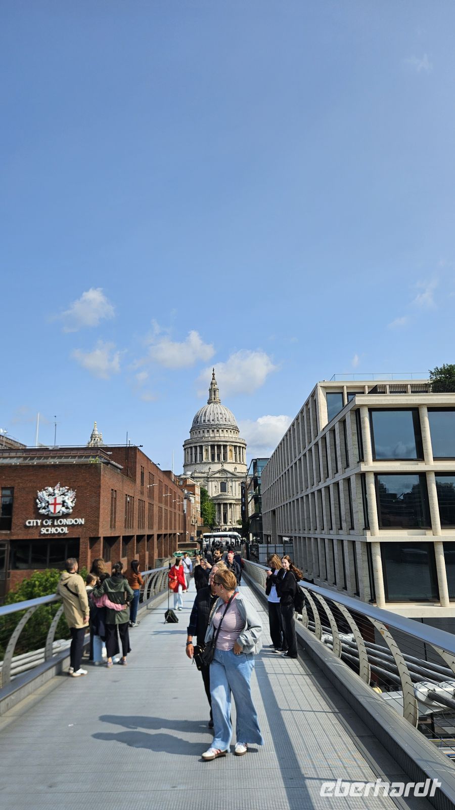 Für uns geht es heute bereits früh am Morgen los und gemeinsam mit unserem Bus rollen wir auf englischen Boden. Nach der Passkontrolle müssen wir uns erstmal kurz an den Linksverkehr gewöhnen, fahren dann aber dank David ganz entspannt in Richtung London. Vorbei an Hochhäusern kommen wir am Tower von London an, wo wir nun endlich komplett sind. Nach einem kurzen Sightseeing von Tower Bridge und dem Tower, treffen wir auf unsere heutige Stadtführerin Ulla. Ulla führt uns zuerst zur sogenannten „Wackelbrücke“, vorbei an der „School of London“, an der Daniel Radcliffe war. Zum Glück steht die Millenium Bridge noch und wurde nicht von Todessern zerstört. Bei bestem Wetter haben wir einen wunderschönen Blick.