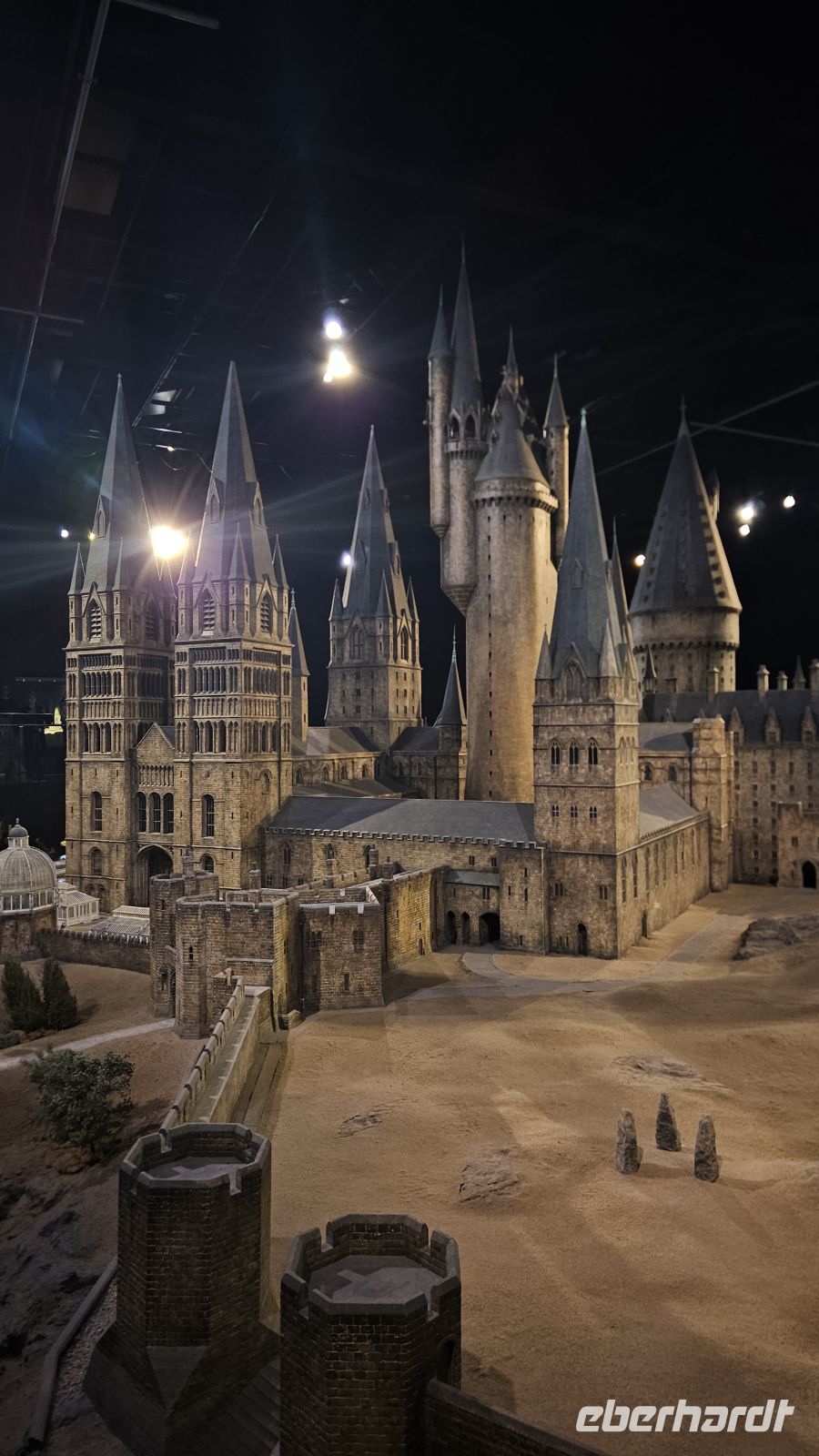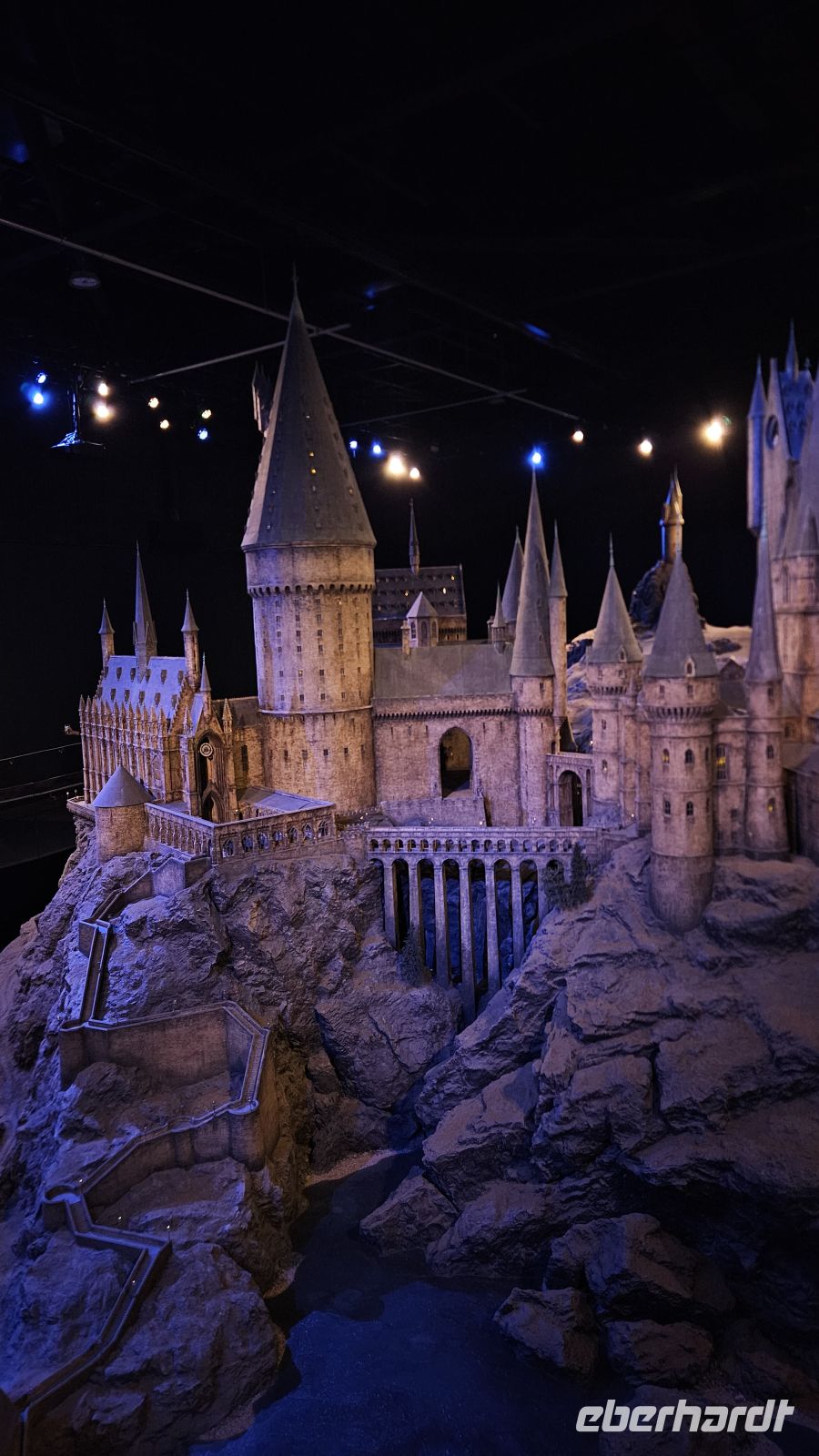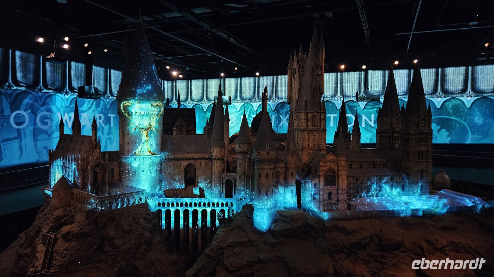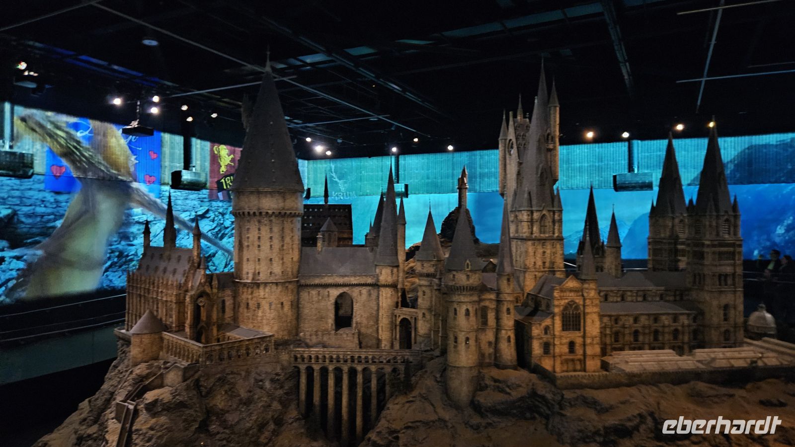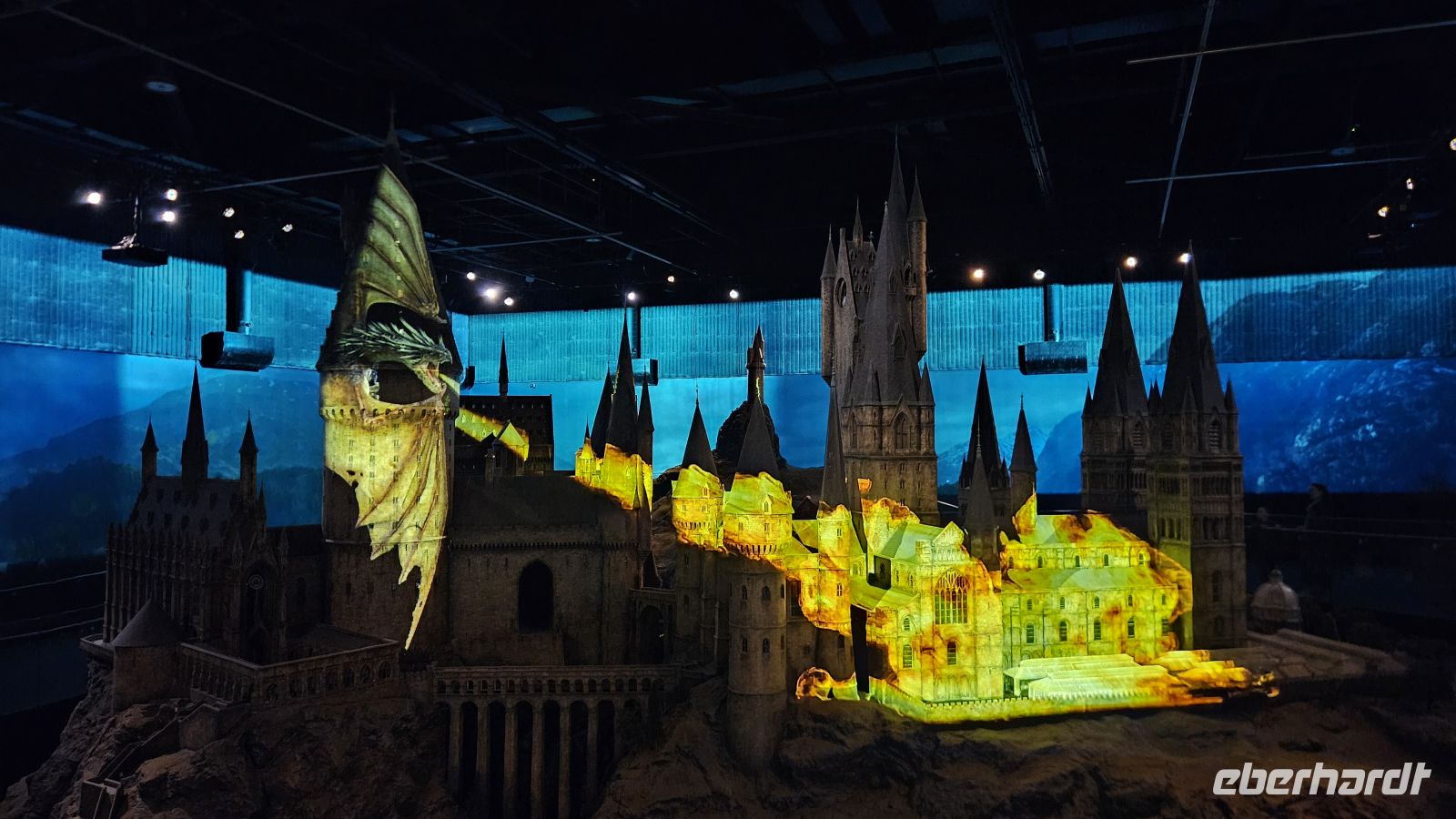 Danach geht es weiter in die zweite Halle, Halle K. Hier lernen wir viel über Maskendesign und allgemein alle Raffinessen hinter unseren geliebten Filmen. Außerdem faszinieren und die Sets von Gingrotts und der Winkelgasse. Schließlich kommen wir am riesigen Hogwarts Modell an und bestaunen es in seiner ganzen Pracht. Diesmal jedoch sehen wir die Jagd des Hornschwanz und Harry. Wirklich ein Spektakel!