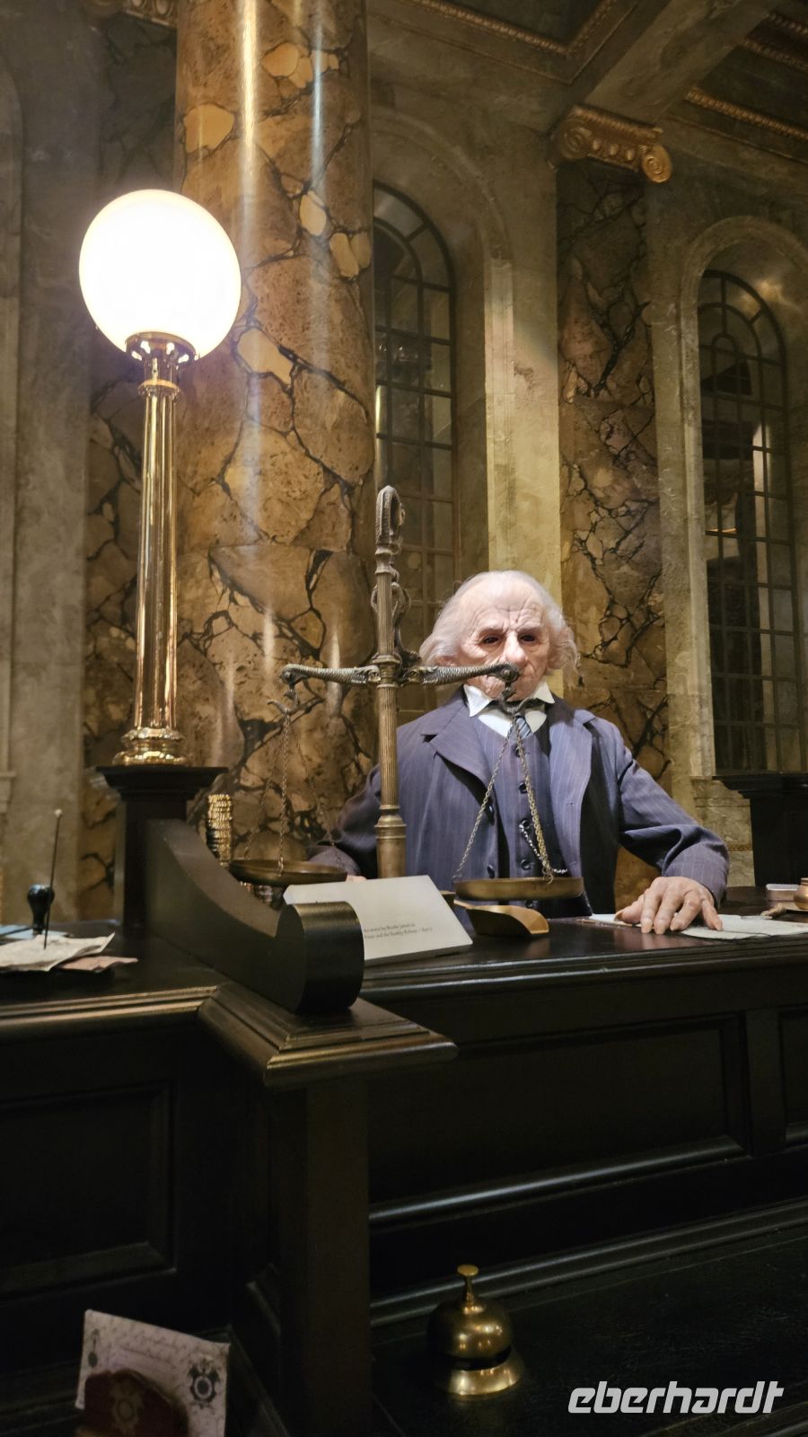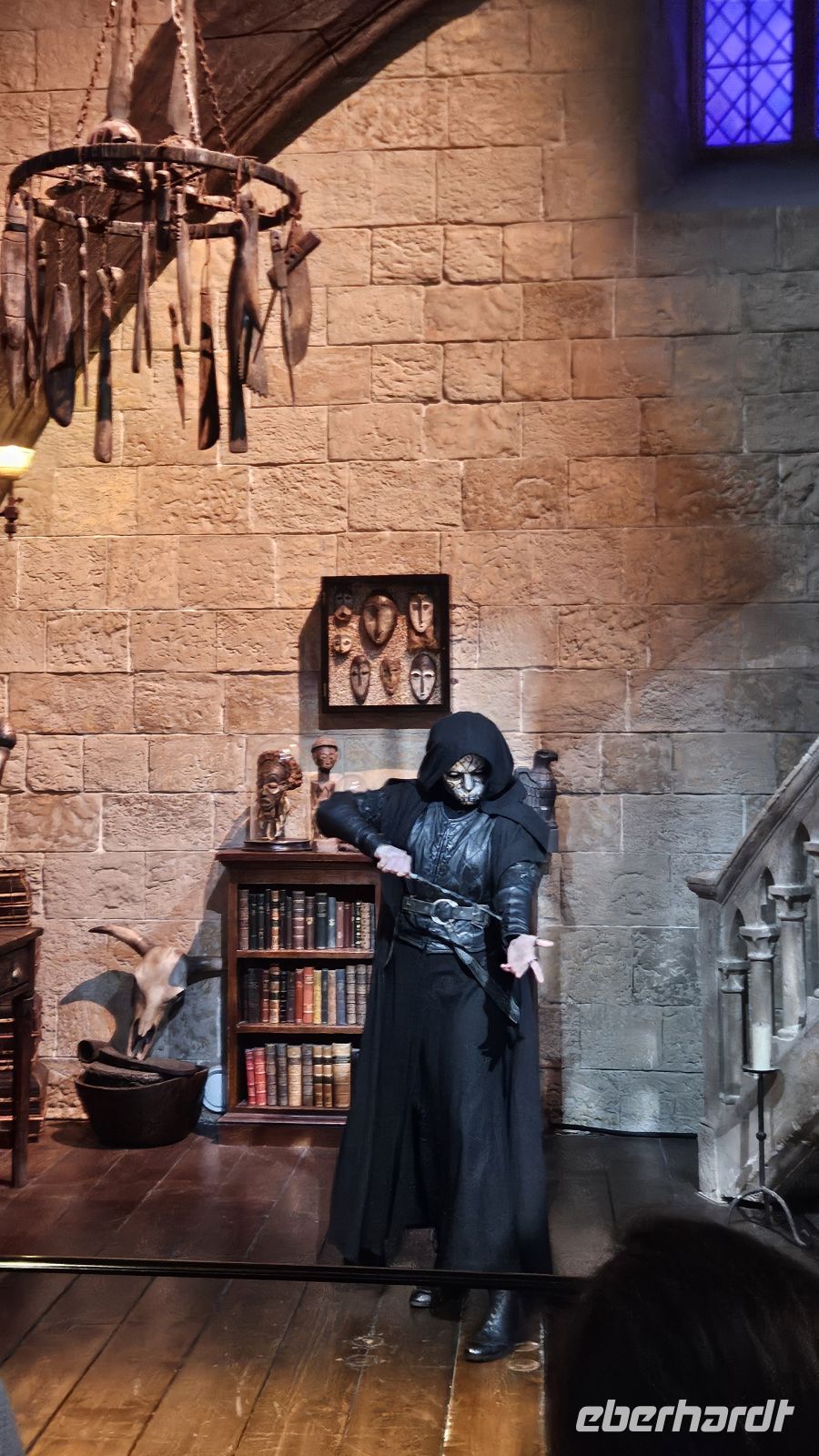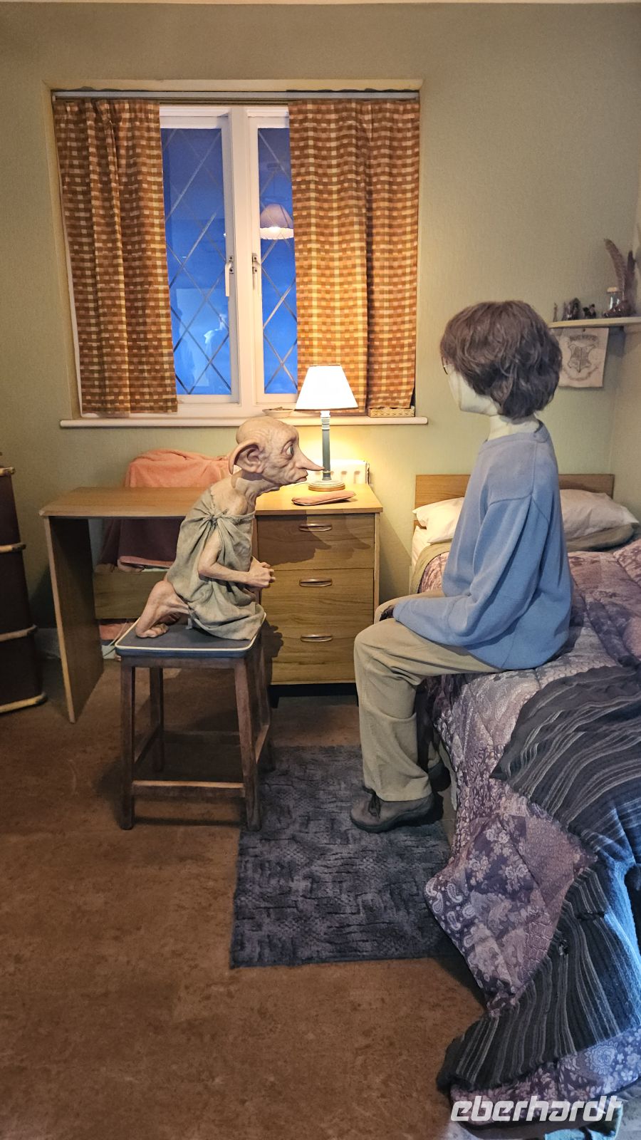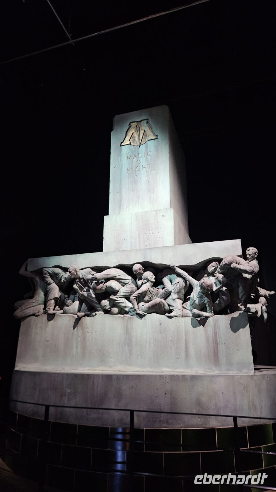 Danach geht es weiter in die zweite Halle, Halle K. Hier lernen wir viel über Maskendesign und allgemein alle Raffinessen hinter unseren geliebten Filmen. Außerdem faszinieren und die Sets von Gingrotts und der Winkelgasse. Schließlich kommen wir am riesigen Hogwarts Modell an und bestaunen es in seiner ganzen Pracht. Diesmal jedoch sehen wir die Jagd des Hornschwanz und Harry. Wirklich ein Spektakel!