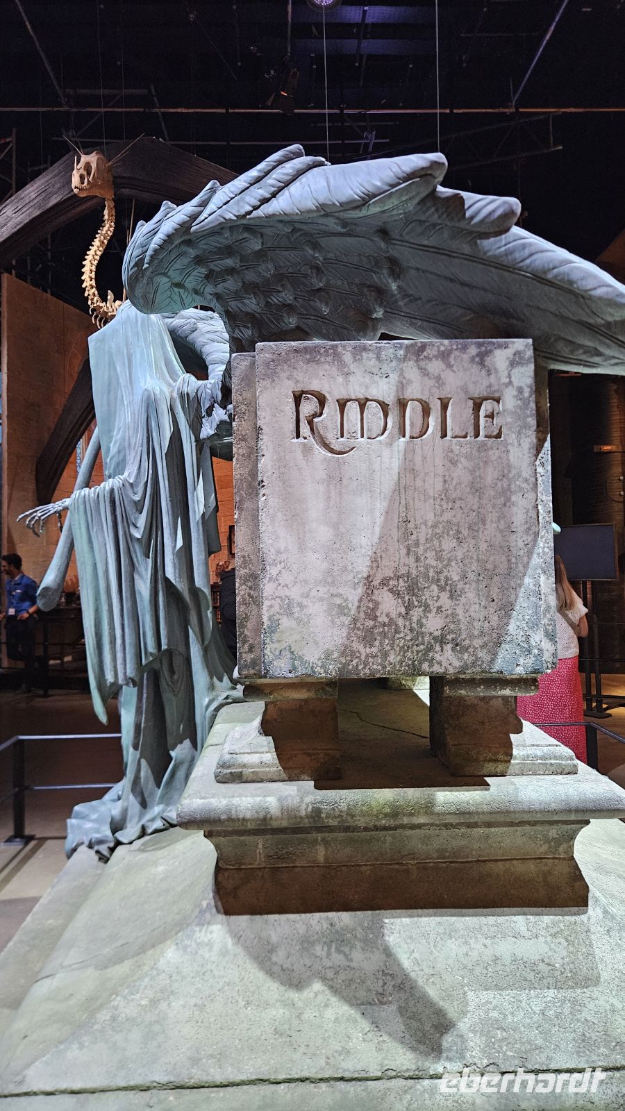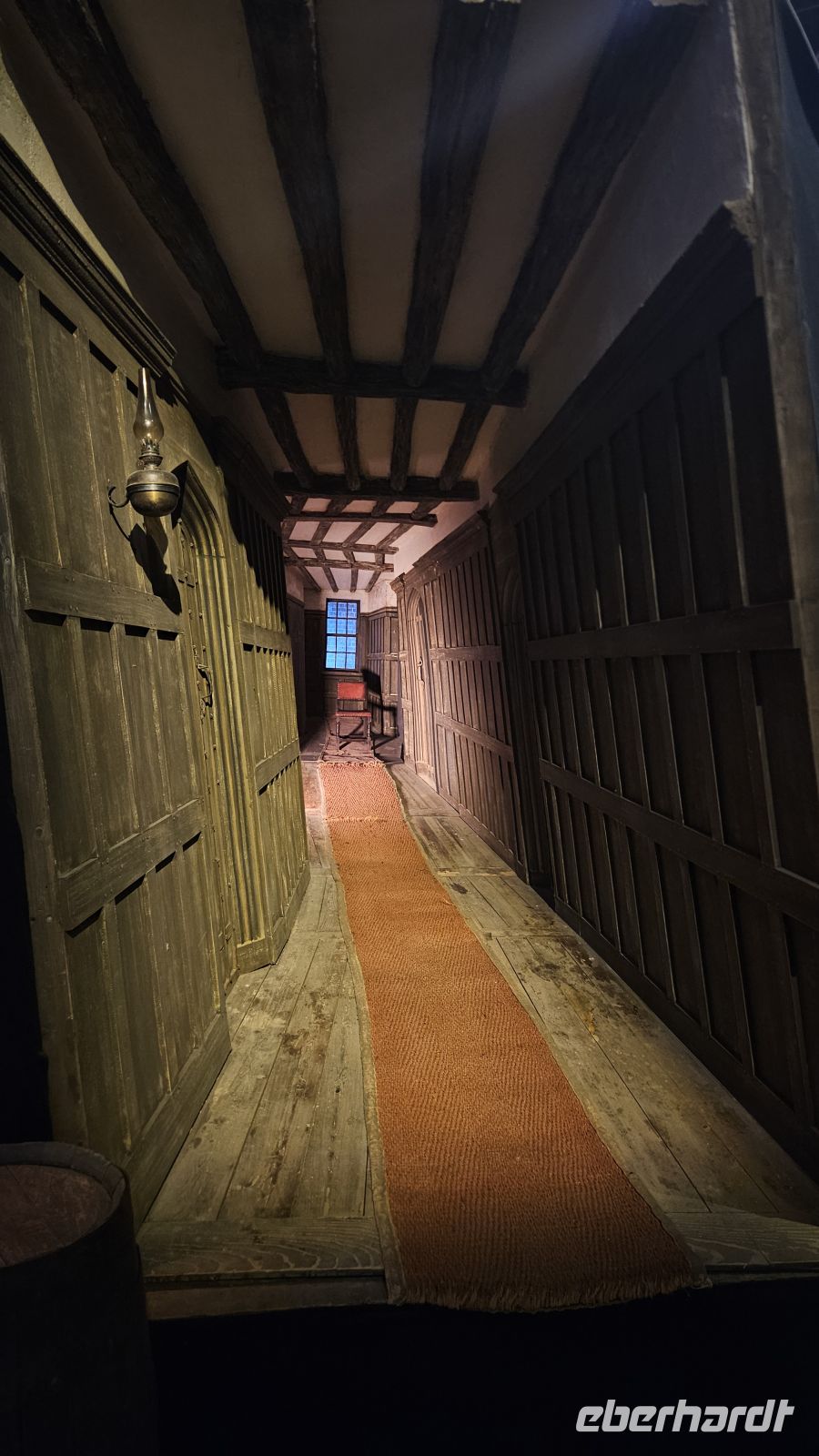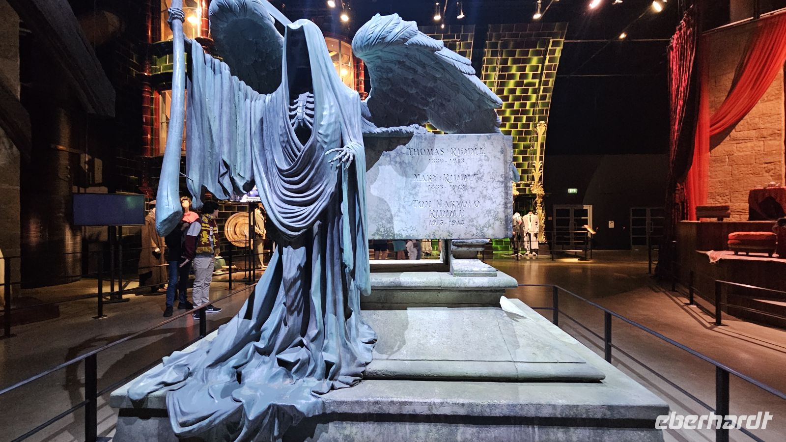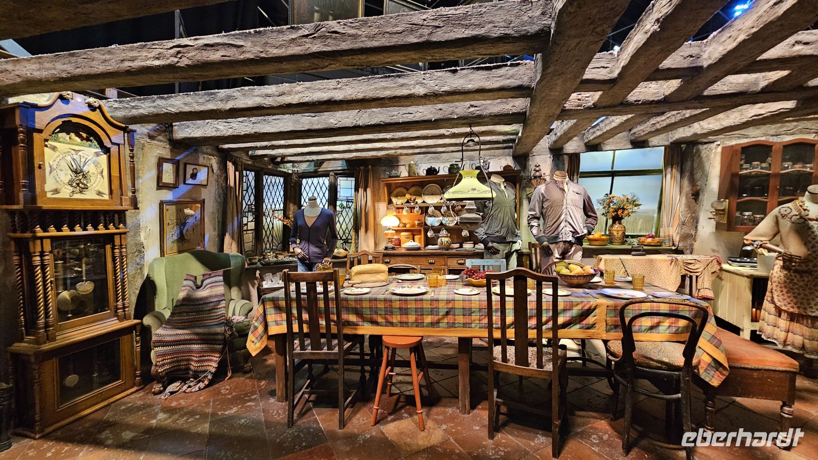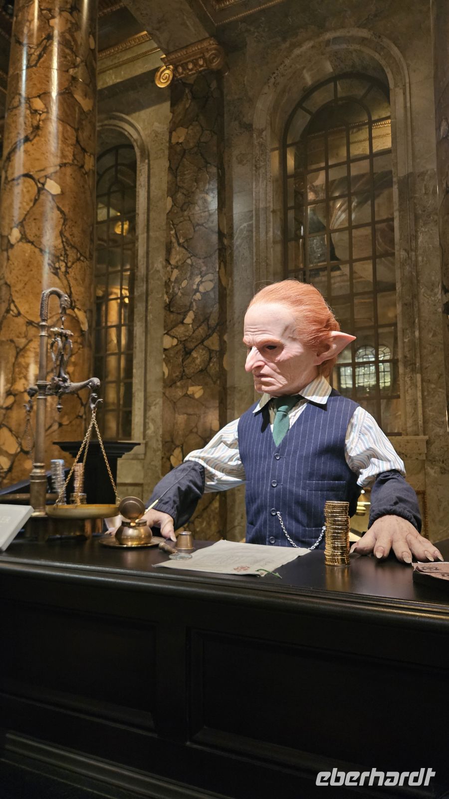 Danach geht es weiter in die zweite Halle, Halle K. Hier lernen wir viel über Maskendesign und allgemein alle Raffinessen hinter unseren geliebten Filmen. Außerdem faszinieren und die Sets von Gingrotts und der Winkelgasse. Schließlich kommen wir am riesigen Hogwarts Modell an und bestaunen es in seiner ganzen Pracht. Diesmal jedoch sehen wir die Jagd des Hornschwanz und Harry. Wirklich ein Spektakel!