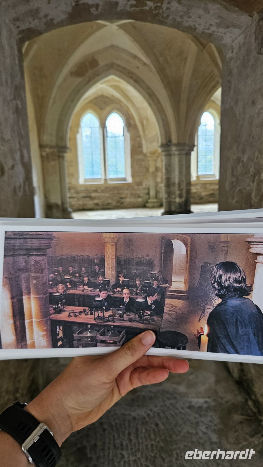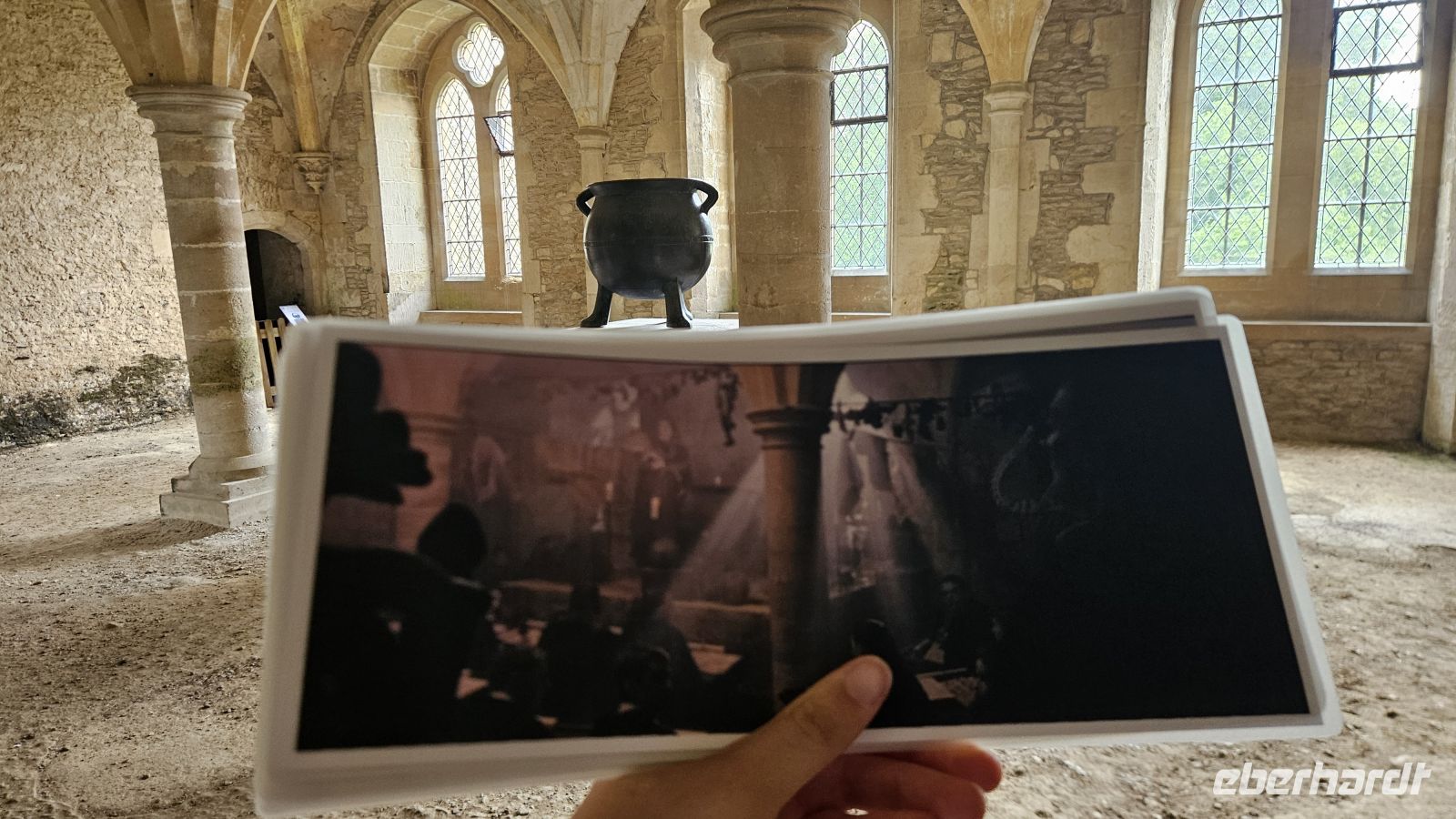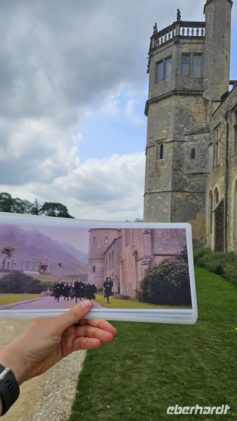 Angekommen machen wir einen Spaziergang durch das schöne englische Dorf und gehen vorbei am Haus von Professor Slughorn und dem Haus der Potters. Vorbei an verschiedenen kleinen Läden und Harry Potter Pins, gehen wir zur Abtei von Lacock. Diese wurde für diverse Hogwarts Klassenzimmer verwendet. Die Szene in der Professor McGonagall Oliver Wood aus Professor Quirrels Klassenzimmer holt, um ihn den neuen Gryffindor Sucher vorzustellen- hier gedreht. Zudem steht Harry hier vor dem Spiegel „Nerhegeb“ und das Klassenzimmer von Professor Snapes war wiederum in einem anderen Raum. Auch in „Phantastische Tierwesen“ wurde die Abtei erneut verwendet, unter anderem für Außenansichten. Hier lachen wir über die Tricksereien der Filmemacher, denn um uns herum sind definitiv nicht die schottischen Highlands, sondern nur das flache England.