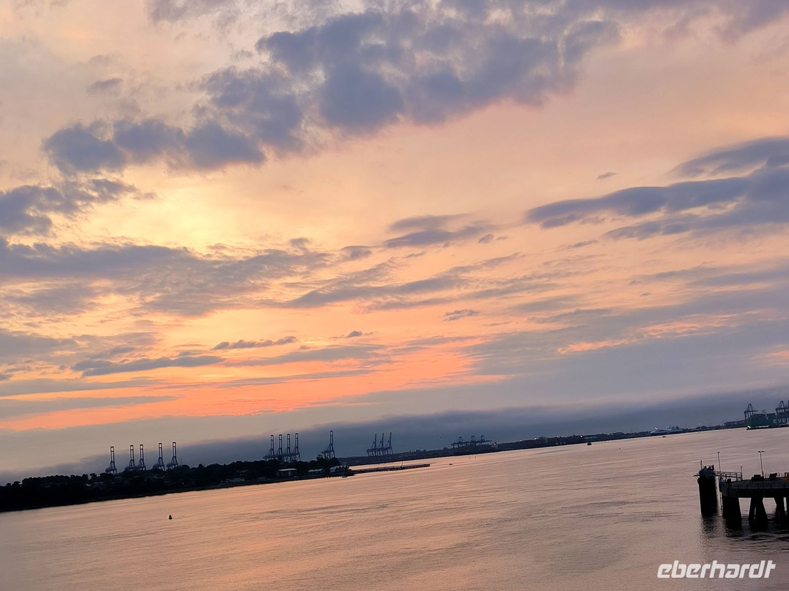 Das Anlegen in Amsterdam dauert etwas länger als sonst. Einige nehmen nun einen Shuttle zum Amsterdamer Hauptbahnhof und setzen dort ihre Reise fort. Unser Bus wird an der niederländischen Grenze tatsächlich angehalten. Ein freundlicher Bundespolizist fragt nach unserer Reise, schaut kurz in den Bus hinein und meint "Das sieht ja gut aus." Wie auch immer er das gemeint hat, wir dürfen weiter fahren.