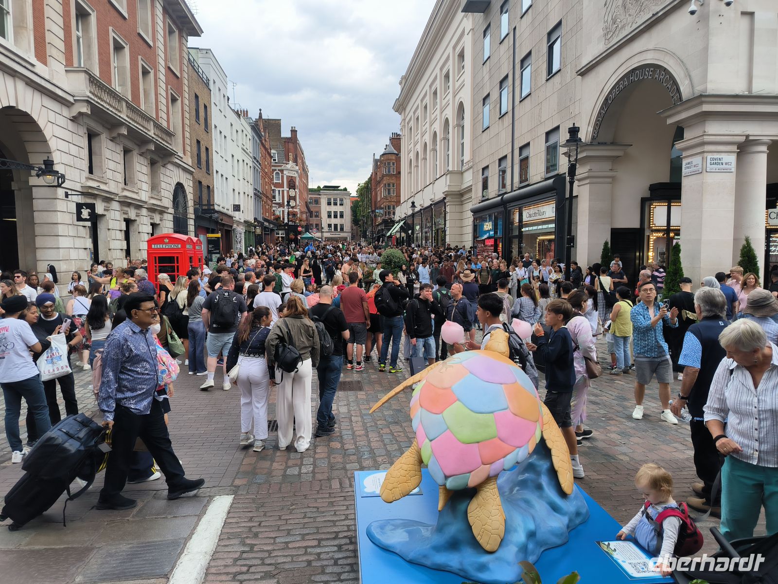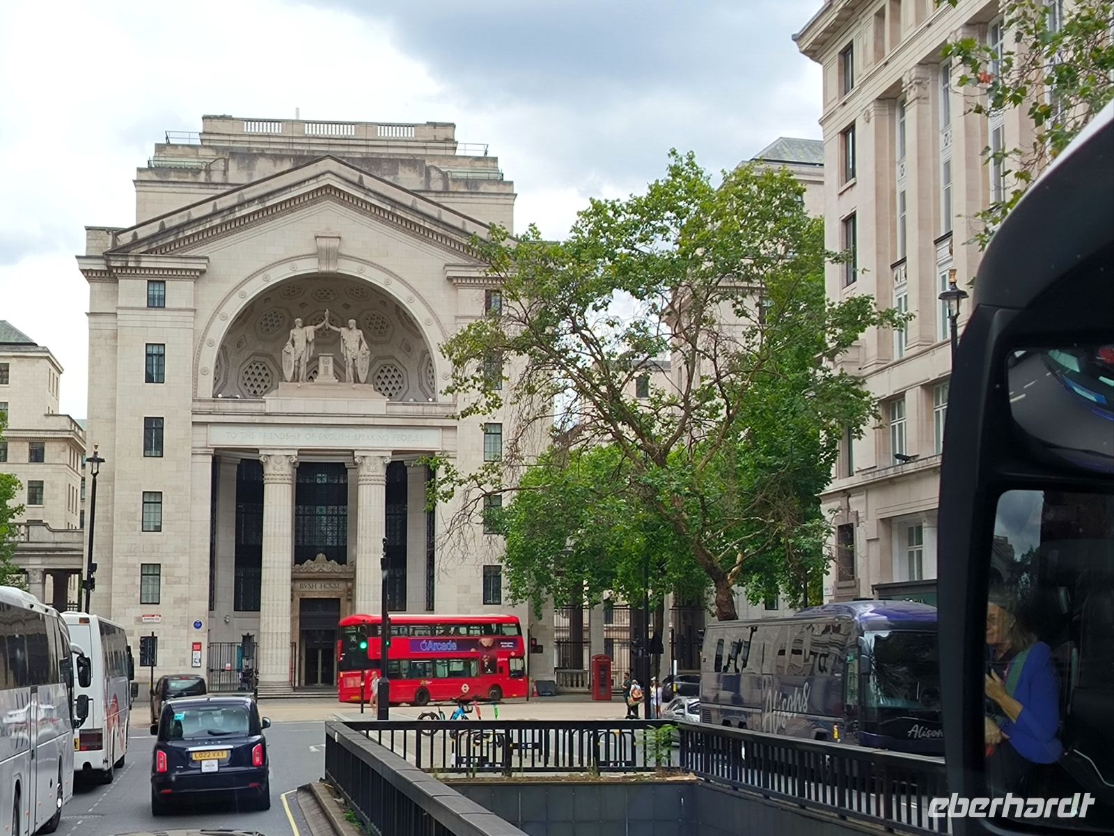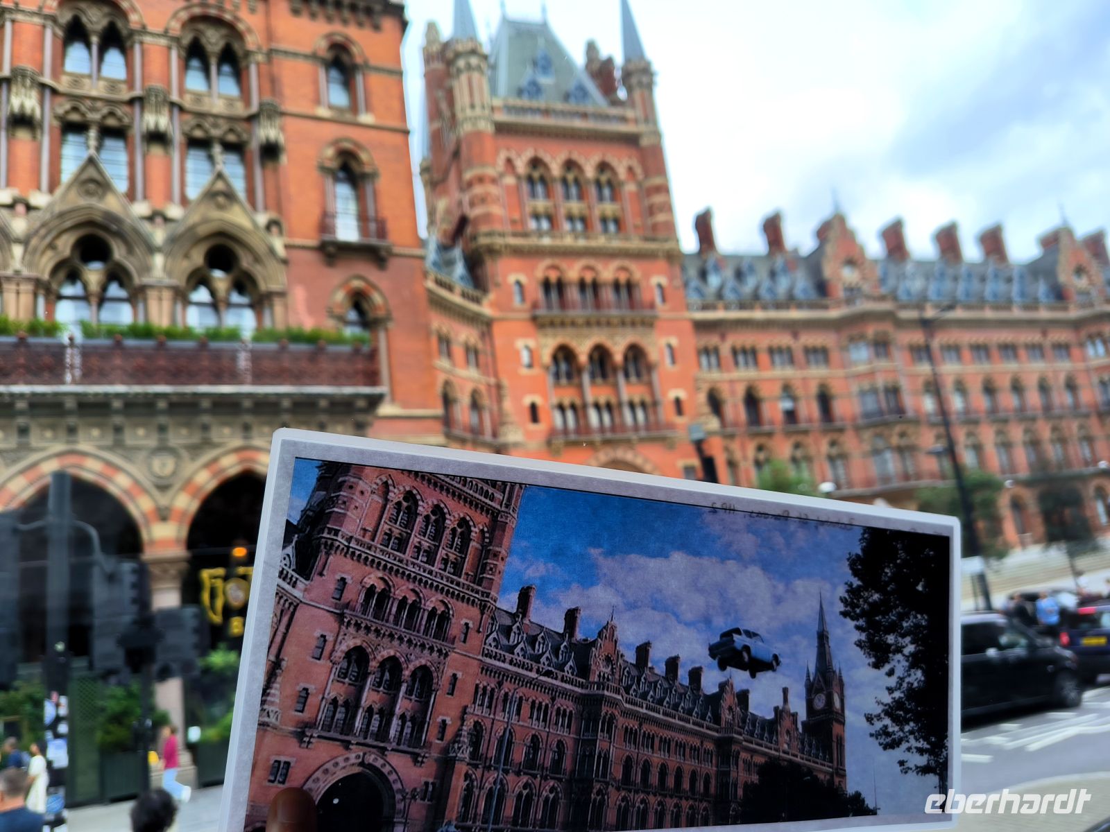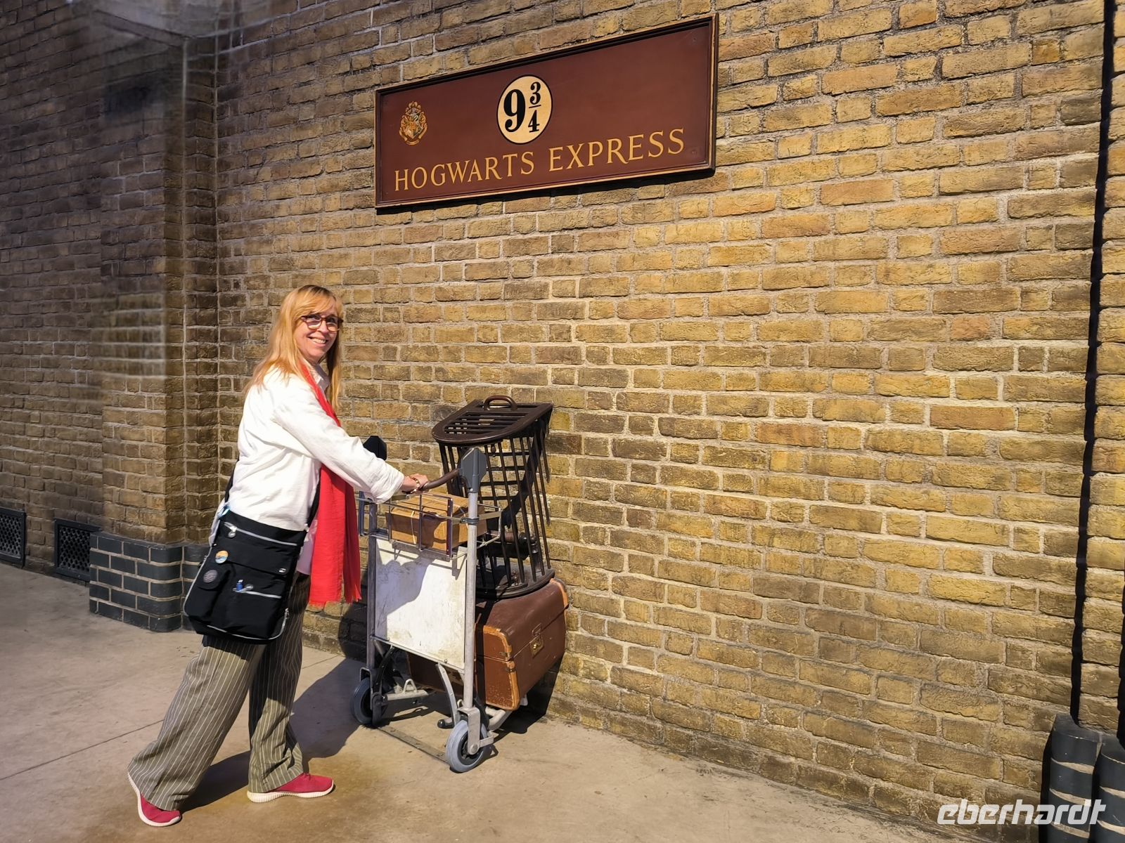 Die Nacht ist kurz. Ein Weckruf schickt uns zum Frühstück, das wir in der Driverslounge einnehmen dürfen, obwohl keiner von uns Bus oder LKW fahren kann. Über die gelbe Treppe erreichen wir Deck 3, wo der Bus auf uns wartet. Zügig verlassen wir das Schiff, absolvieren die freundliche Passkontrolle und fahren auf der nun "falschen" Straßenseite Richtung London. Am Themseufer mit Blick auf den Tower und die Tower Bridge erwartet uns Ulla, die örtliche Stadtführerin. Mit dem Zustieg der Gäste, die bereits am Vortag mit dem Flugzeug in London gelandet sind, ist die Reisegruppe komplett. Es kann losgehen. Ulla kennt sich aus, navigiert Daniel souverän durch den Verkehr und erzählt uns viele interessante Details über die Geschichte von London. Zwischendurch gehen wir mit Heike, unserer Reiseleiterin, zu Fuß zum Shakespeare Globe Theatre. Dies wurde vom amerikanischen Regisseur und Schauspieler Sam Wanamaker wieder aufgebaut, dessen Tochter Zoë Wanamaker bei Harry Potter die Fluglehrerin Madame Hooch spielt. Weiter geht es über die Millenium Bridge, die im 6. Teil von den Todessern heimgesucht wird. Diese sind nicht zu sehen, deshalb können wir Ben Wilsons Kaugummikunst auf dem Boden bewundern. An Daniel Radcliffes Schule vorbei, können wir einen Blick auf die imposante St. Pauls Kathedrale werfen. Nun fahren wir zum Leadenhall Market, wo sich der Eingang zum tropfenden Kessel befindet. Riesige Menschenmengen versammeln sich am Bahnhof Kings Cross. Ja, auch Harry Potter Fans sind auf der Jagd nach Fotos darunter. Aber wir erfahren, dass aufgrund eines Stromausfalls fast alle Züge nicht fahren und deshalb so viele Fahrgäste hier gestrandet sind.