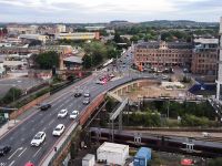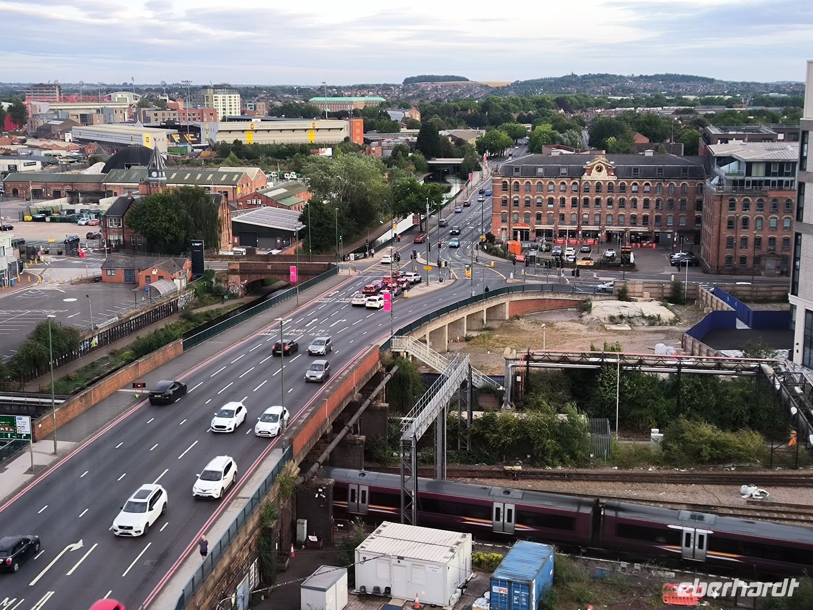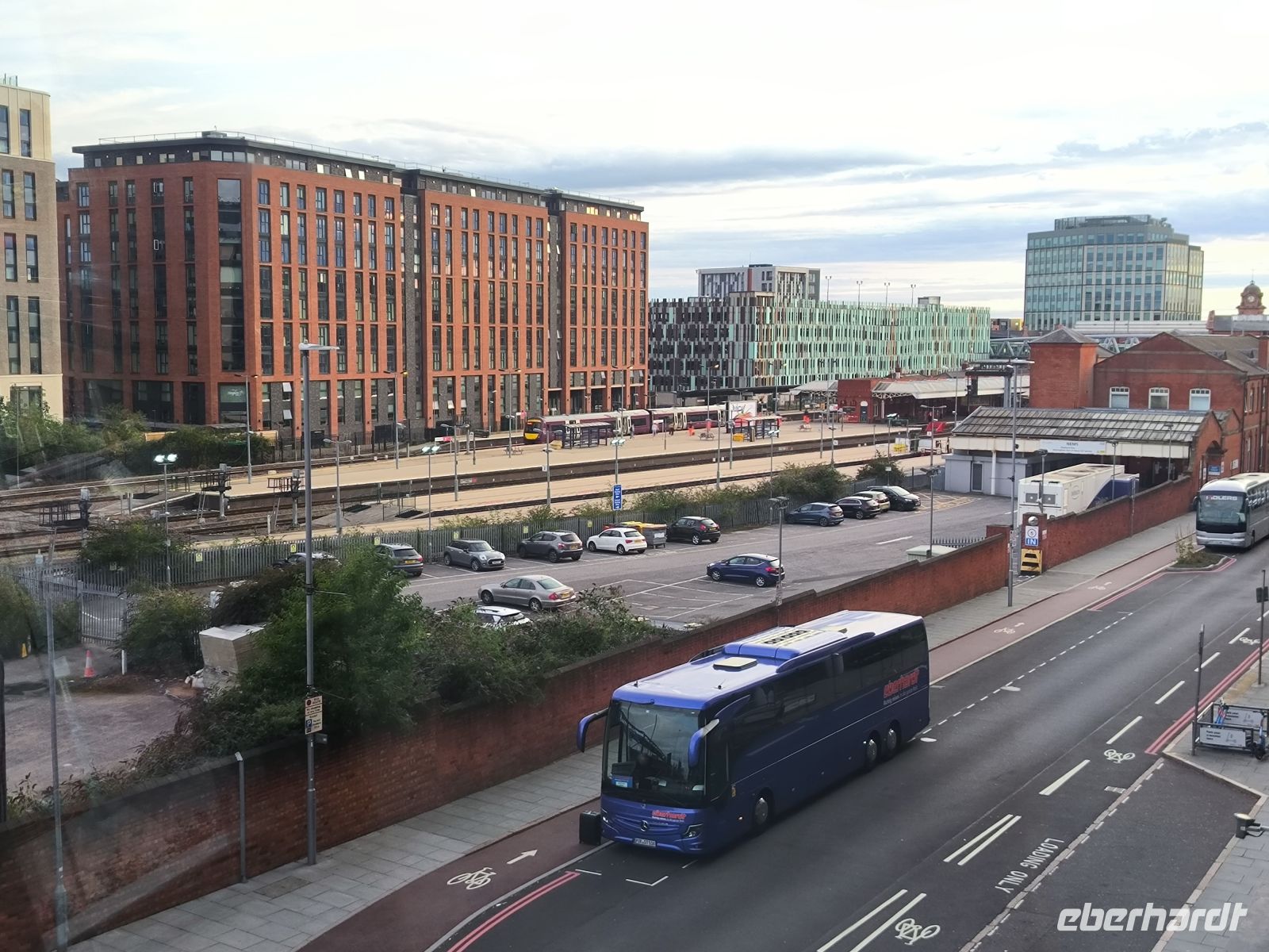 Der Bus ist inzwischen auf dem Parkplatz im Dorf angekommen und wir überqueren das Hochmoor mit den freilaufenden Schafen, entdecken die Nordsee am Horizont und fahren nach Stockton on Tees. Hier werden wir auf unserer Reise die letzte gemeinsame Nacht an Land verbringen.