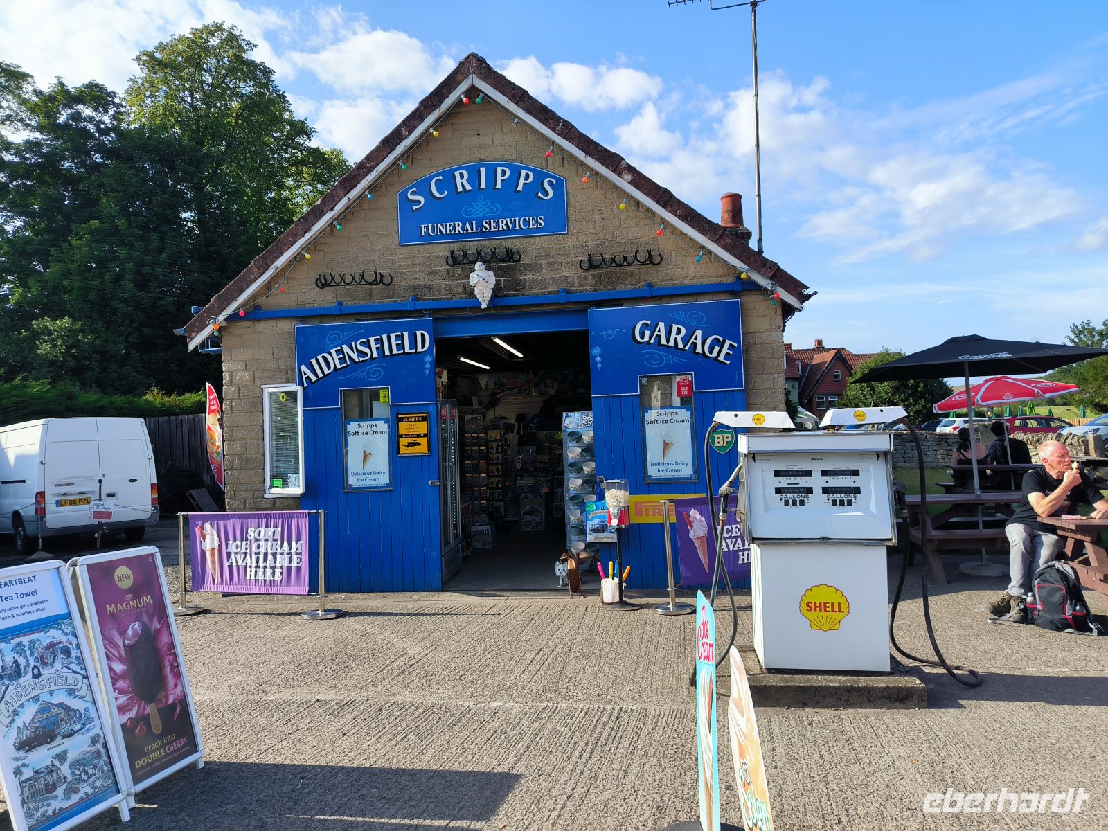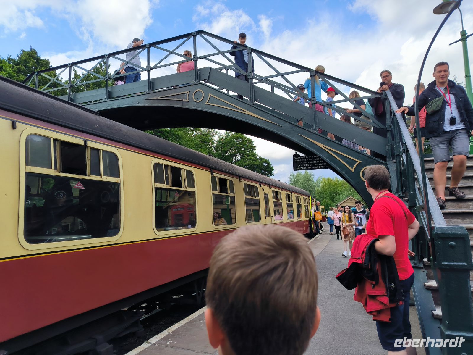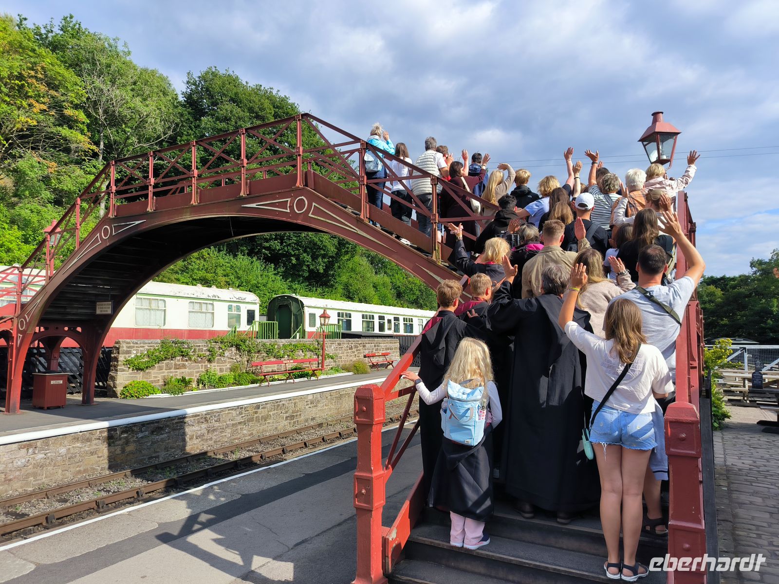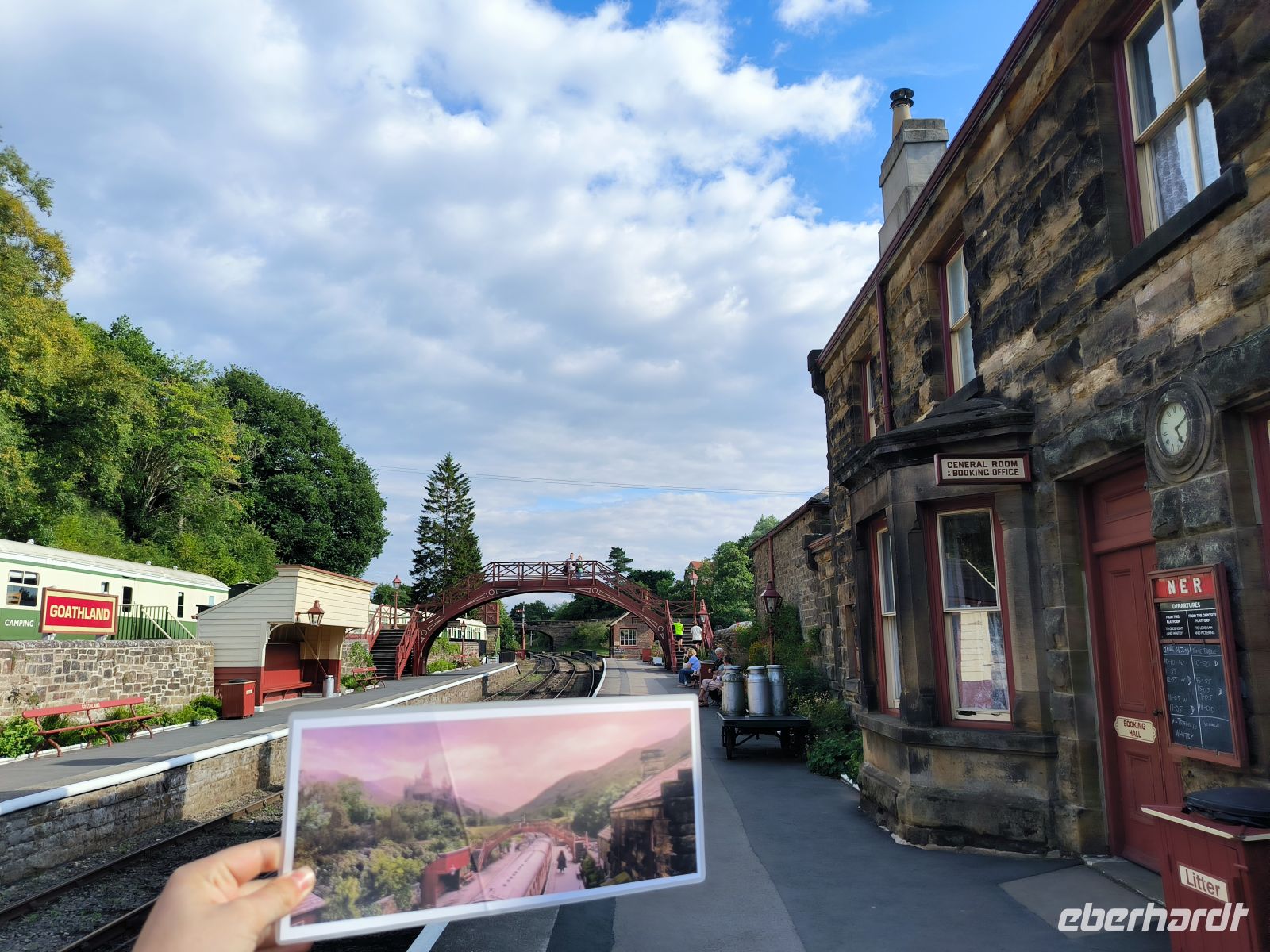 Einen Wagen hat sie zwar nicht, aber aus dem magischen Beutel zaubert Heike Süßigkeiten für alle hervor. Große Freude. Doch auch die auch verändernde Landschaft möchte bewundert werden. Viel zu schnell sind 50 Minuten Fahrt vorbei und wir erreichen Goathland. Hier wurden also die Szenen der Abfahrt/Ankunft in Hogsmeade gedreht. Unverkennbar die rote Brücke über den Gleisen. Unsere Kameras haben viel zu tun.