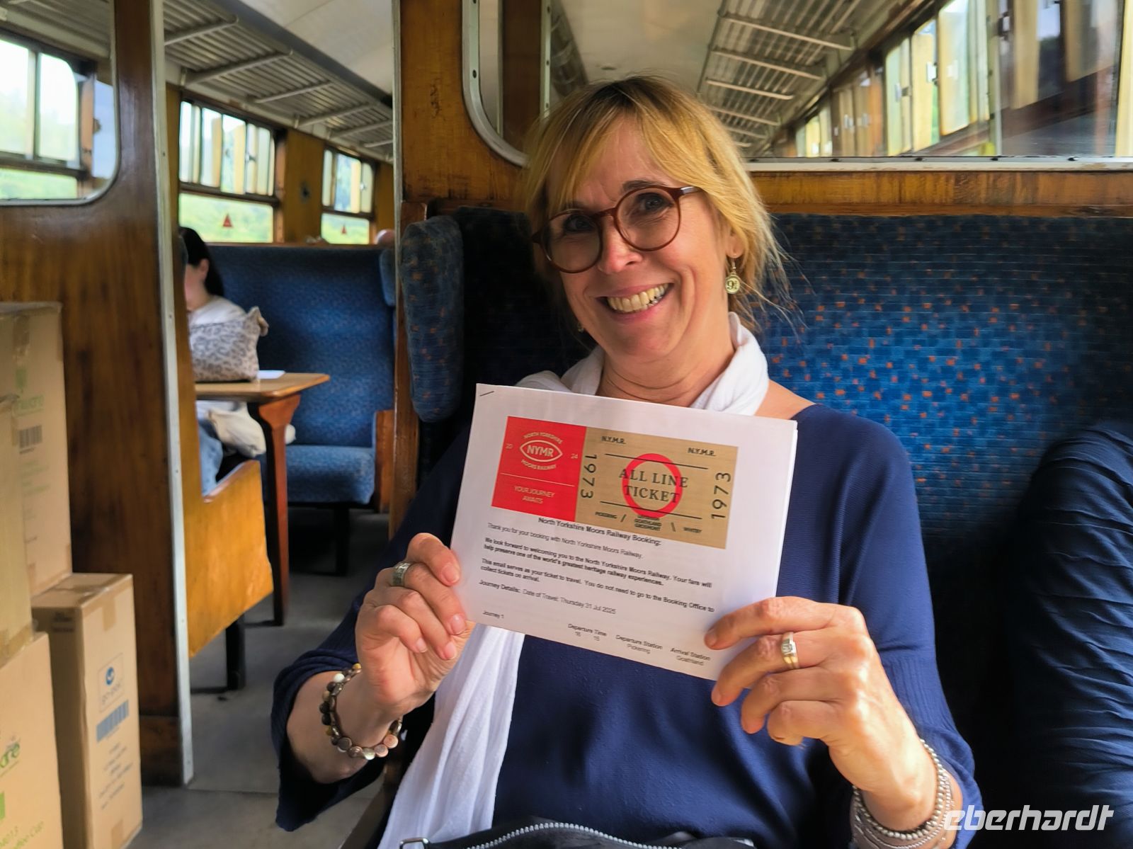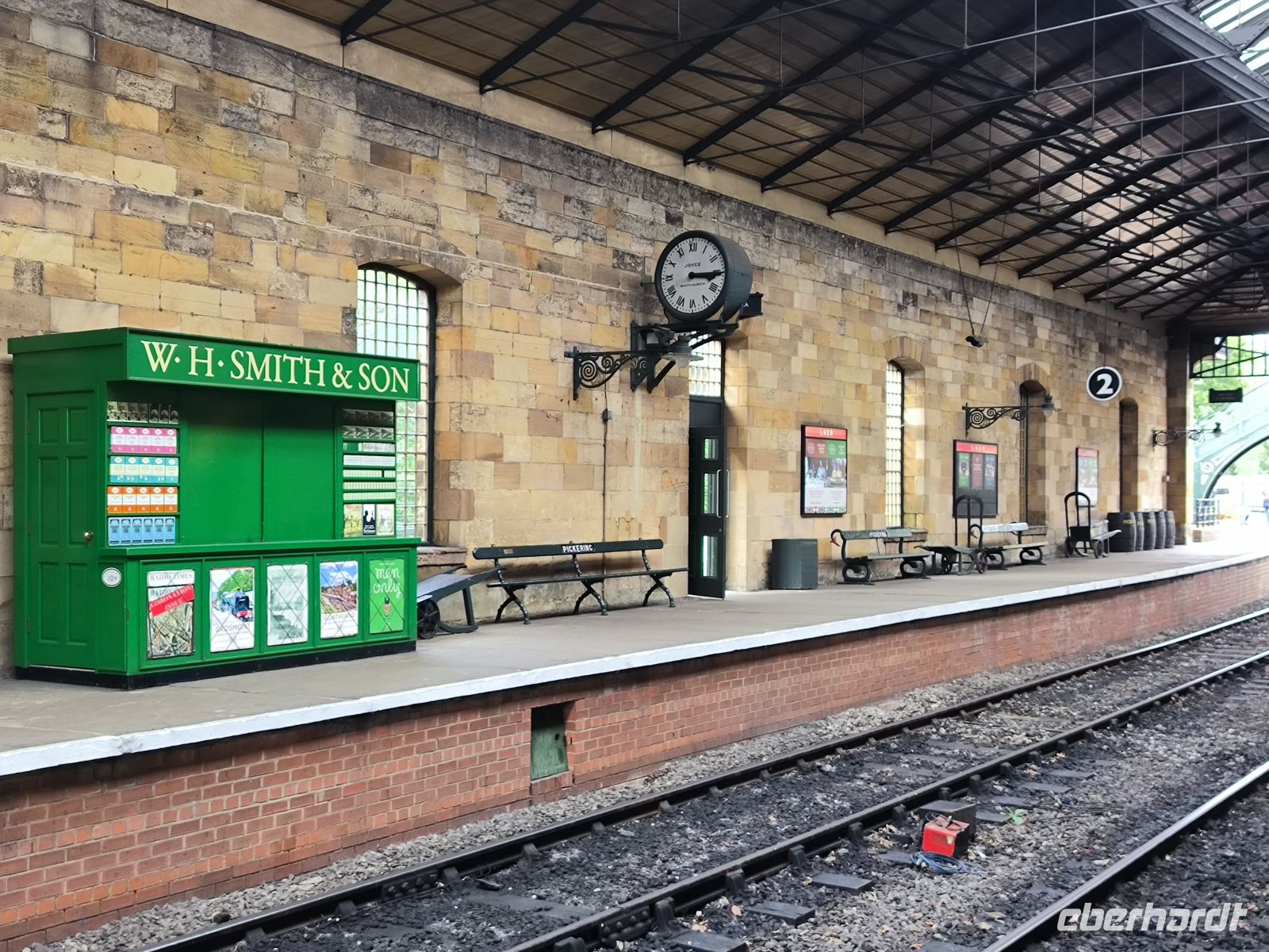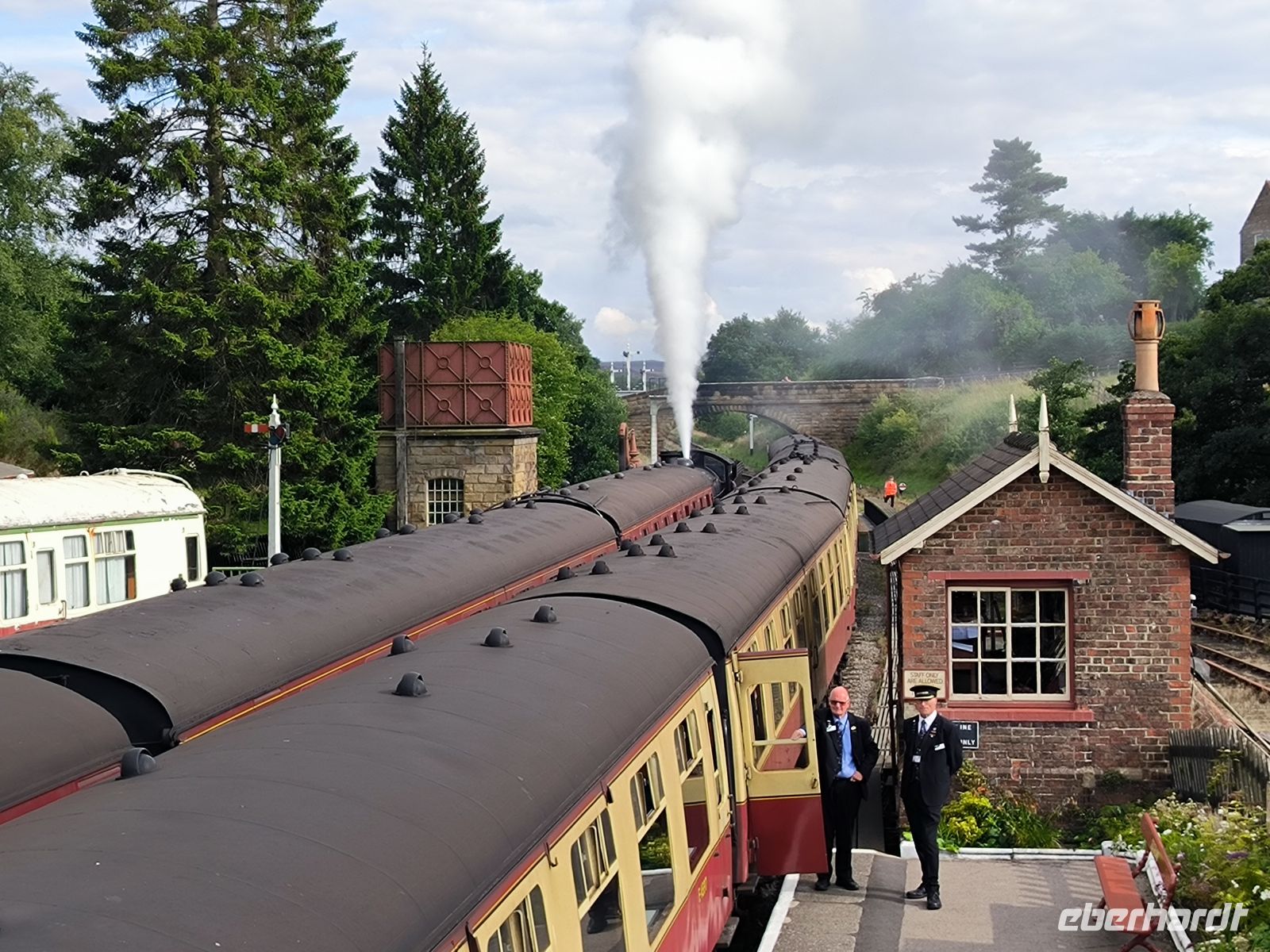 Pünktlich sind alle zurück am Bus. Schließlich wollen wir einen weiteren Höhepunkt nicht verpassen: die Zugfahrt mit der North Yorkshire Moors Railway von Pickering nach Goathland. Im historischen Bahnhof von Pickering scheint die Zeit, nicht aber die Bahnhofsuhr, stehen geblieben zu sein. Drei rote Eimer sind die Feuerwehr, die Stationsvorsteher sind von der alten Schule und die Weichen werden von Hand gestellt.