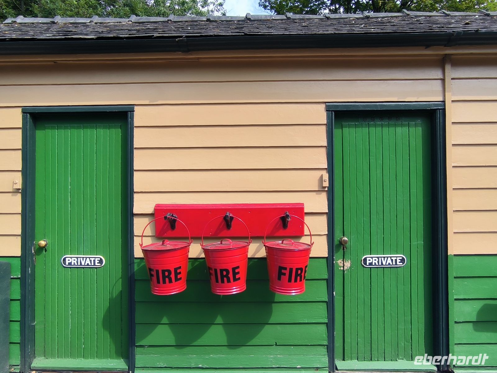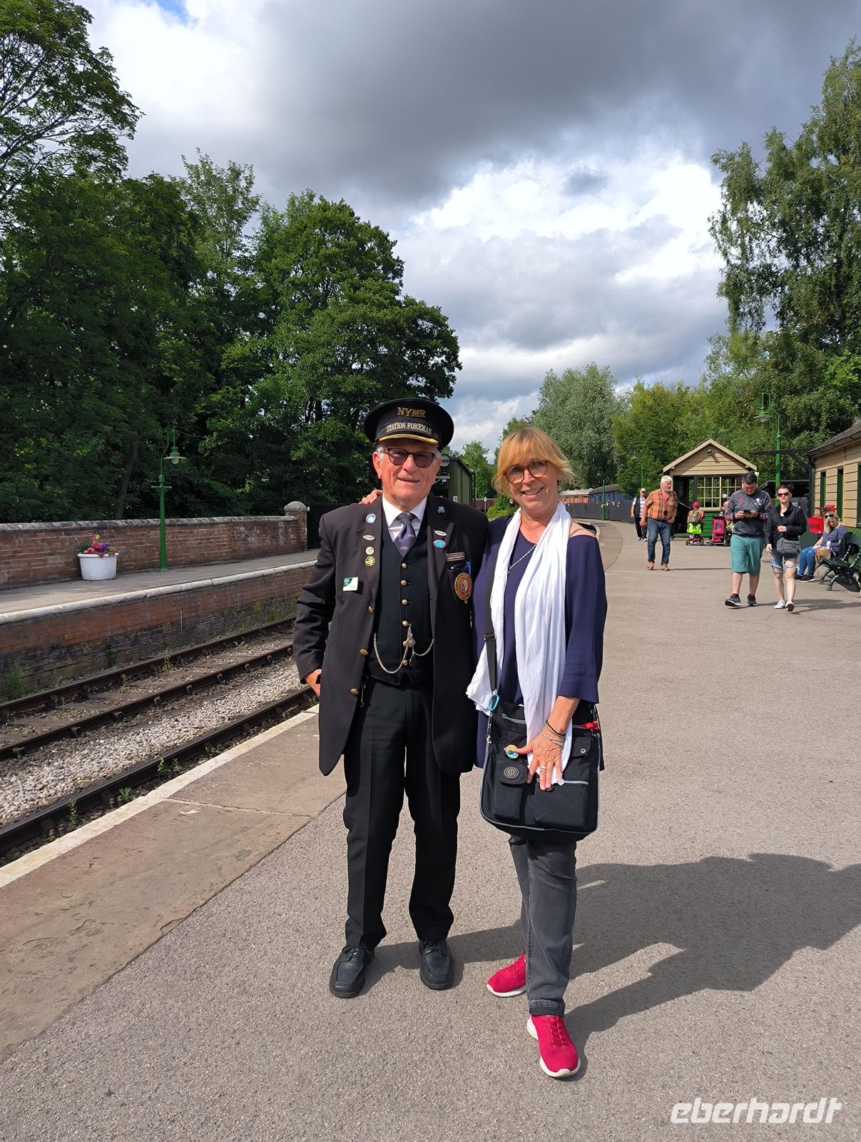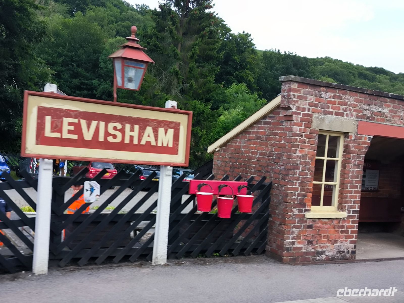 Pünktlich sind alle zurück am Bus. Schließlich wollen wir einen weiteren Höhepunkt nicht verpassen: die Zugfahrt mit der North Yorkshire Moors Railway von Pickering nach Goathland. Im historischen Bahnhof von Pickering scheint die Zeit, nicht aber die Bahnhofsuhr, stehen geblieben zu sein. Drei rote Eimer sind die Feuerwehr, die Stationsvorsteher sind von der alten Schule und die Weichen werden von Hand gestellt.