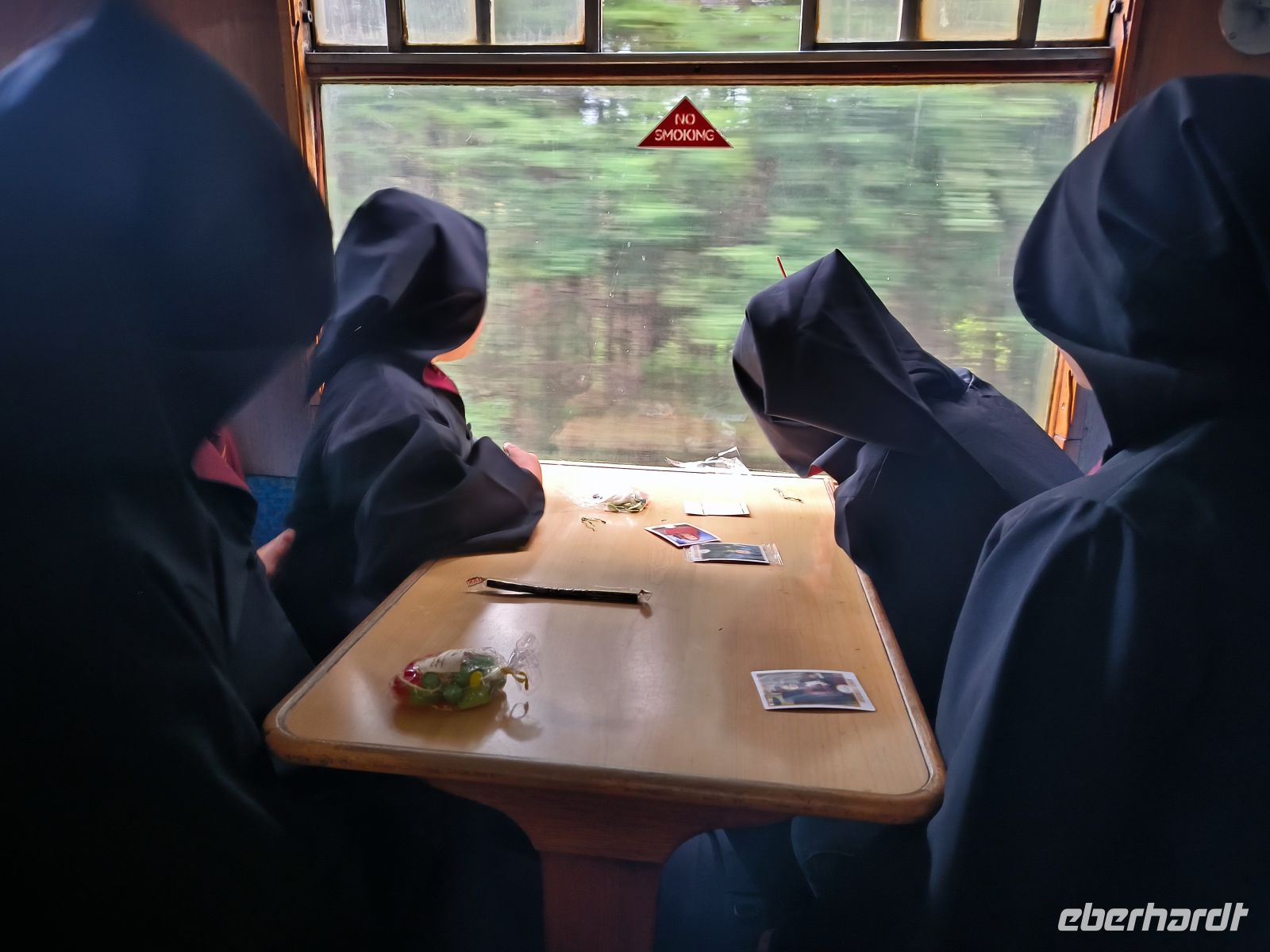 Leider ist es keine Dampflok, die unseren Zug zieht, aber da wir ja nicht bei der Deutschen Bahn sind, fahren wir ganz pünktlich ab.