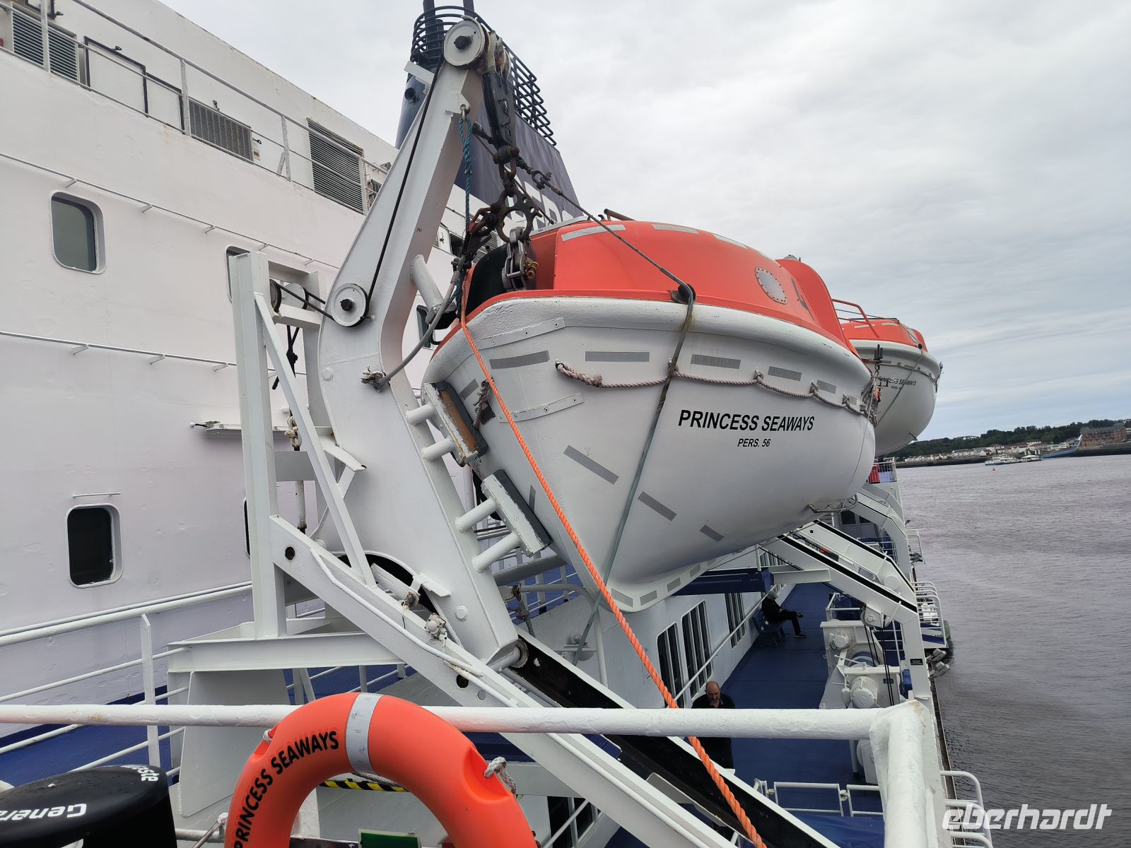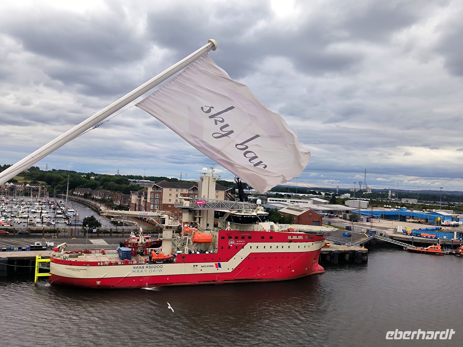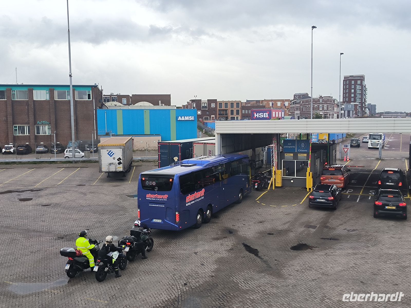 Unser fahrender Ritter ist blau statt lila und trägt die Aufschrift eberhardt. Das tut der Freude auf die kommenden Tage keinen Abbruch. Busfahrer Daniel bringt uns souverän und pünktlich nach Hoek van Holland, wo wir die Fähre nach England besteigen. Am Hafen kommen noch weitere Gäste zu uns und wir begegnen noch einer ganz speziellen, schottischen Ausgabe von Käpt'n Sparrow. Nach dem Abendessen schauen wir noch dem Auslaufen des Schiffes zu, bevor alle sich müde in ihren Kabinen schlafen legen.