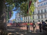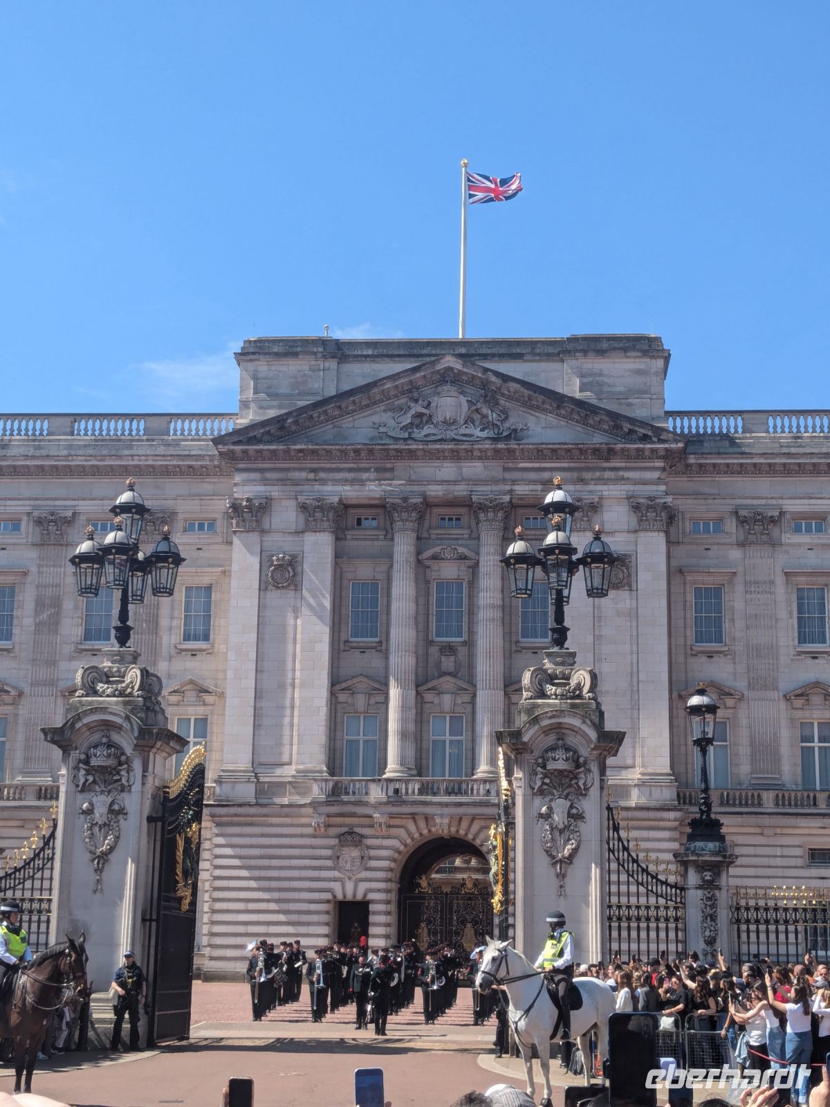 Von dort ging es weiter zum Buckingham Palace, wo wir uns an der Queen Victoria Statue niederließen. Der Wachwechsel ist hier täglich zu sehen, doch sonntags fällt er besonders groß aus. Wir beobachteten, wie die neuen Garden einmarschierten und ihre Vorgänger ablösten – inklusive gehisster Flagge: König Charles III. war anwesend. Auf dem weiteren Weg durch die Stadt erlebten wir eine zweite Wachablösung mit festlicher Musik und Beefeaters in ihren markanten roten Uniformen und hohen schwarzen Mützen, diesmal fast ohne Touristen. Ein echtes Highlight!