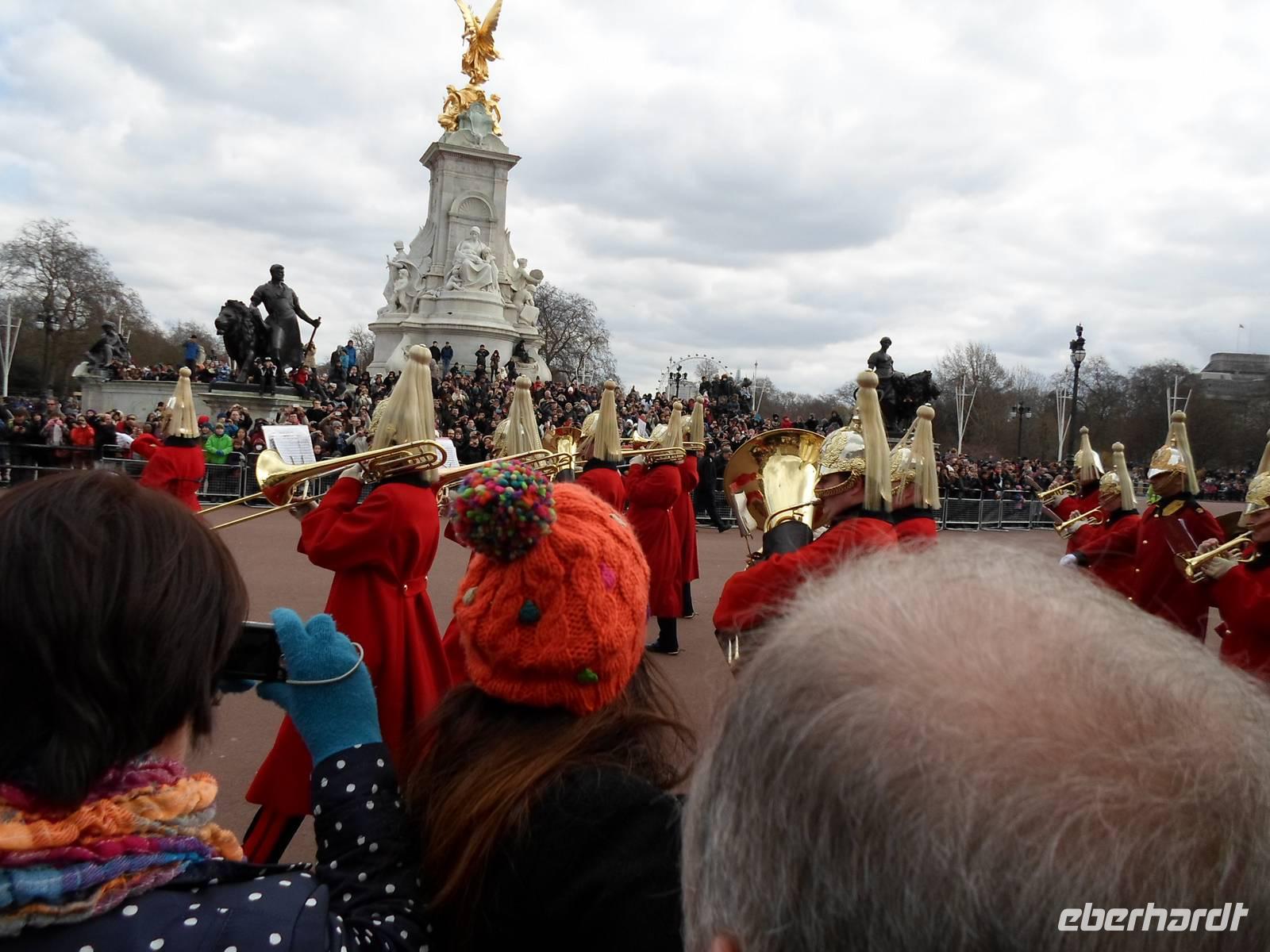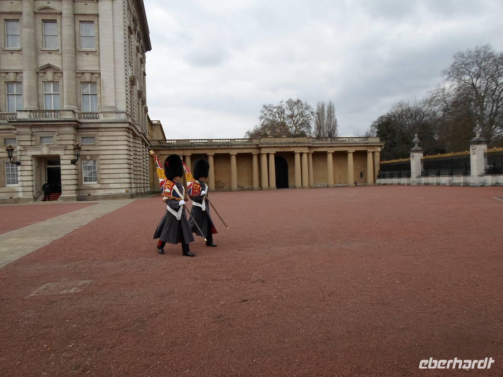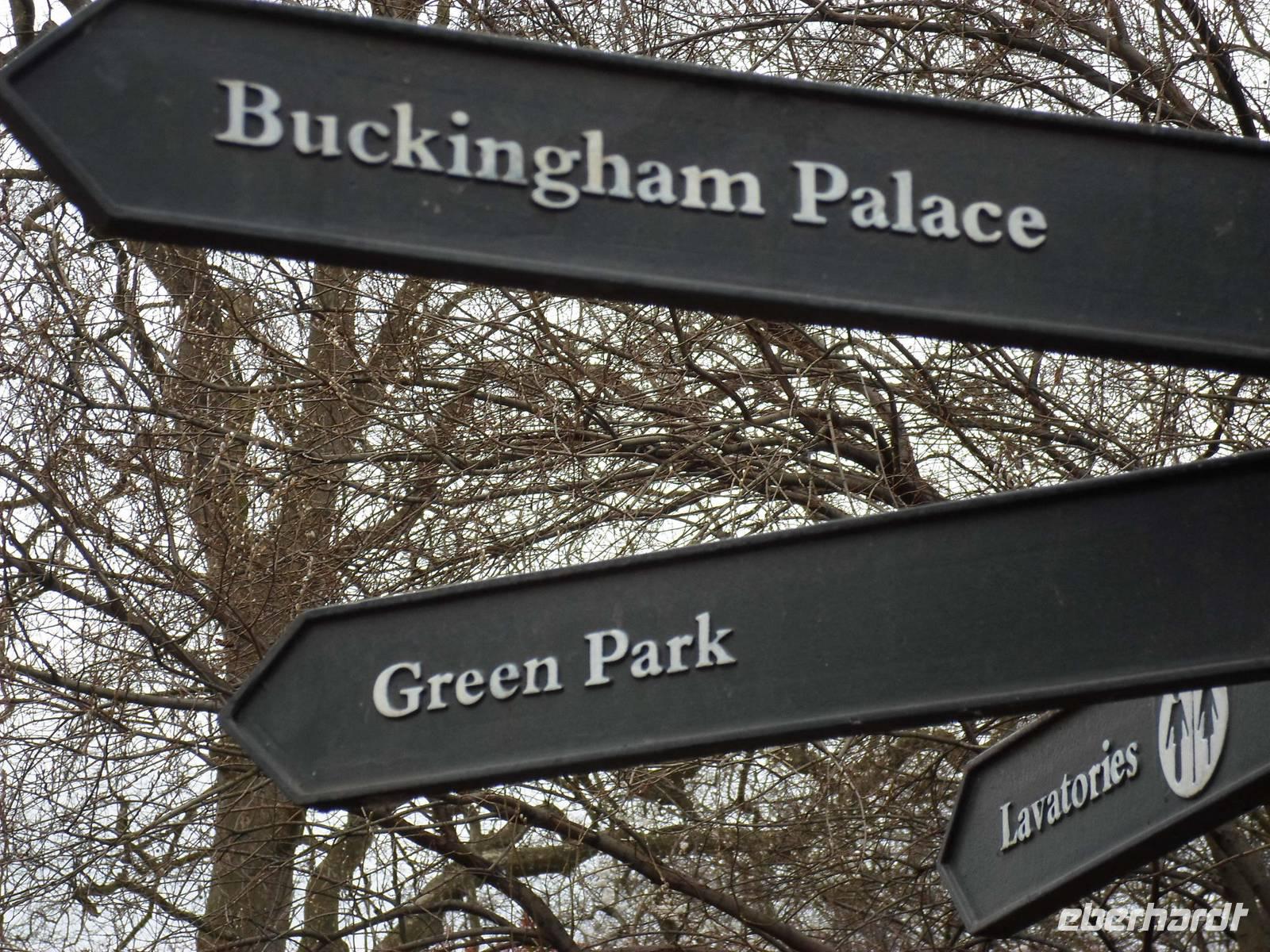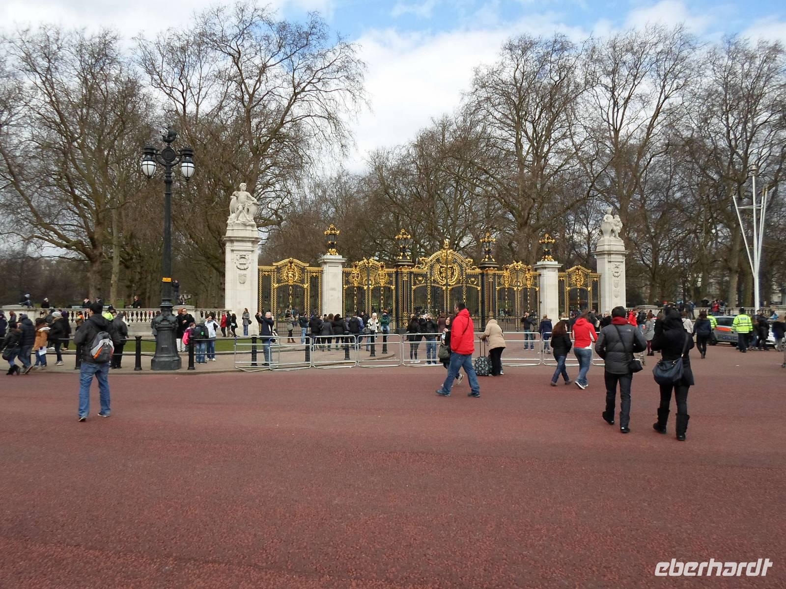 Heute warten wir umsonst auf die Sprechen. Sicherlich ist die Kälte schuld, dass so zeitig noch niemand zu sehen ist. Also laufen wir durch den Hyde Park zum Hyde Park Corner und dann weiter entlang der Begrenzungsmauer des Buckingham Palastes, um die Wachablösung davor zu erleben.